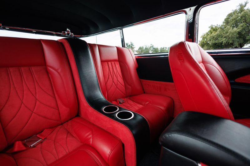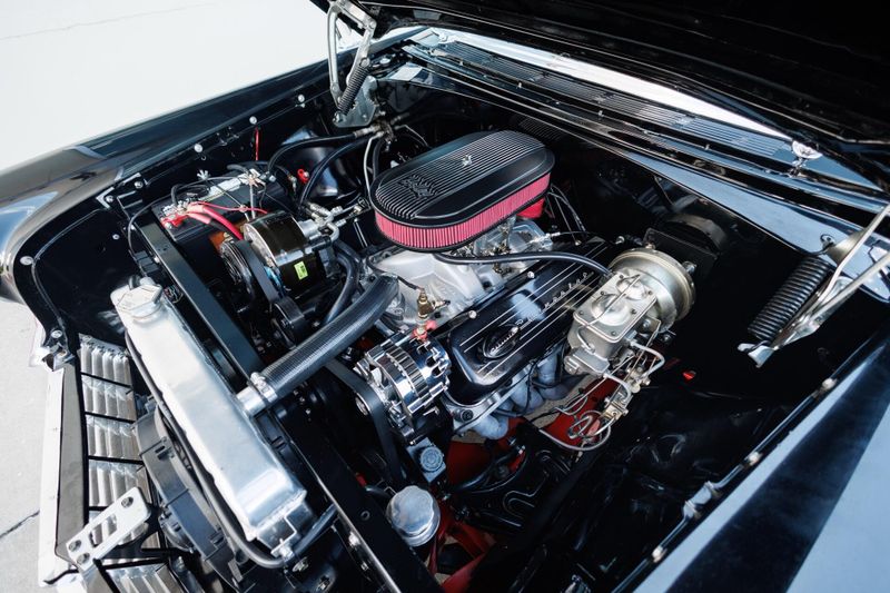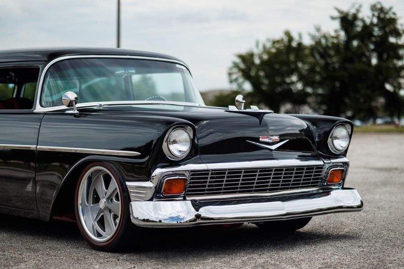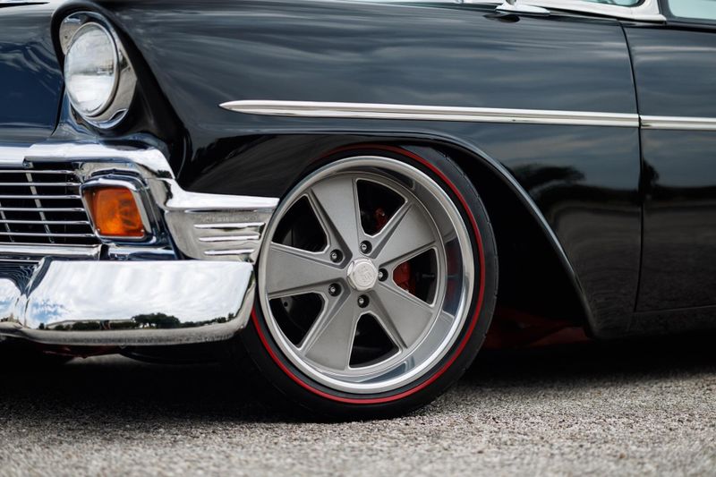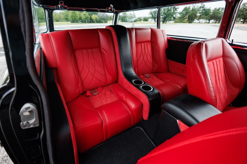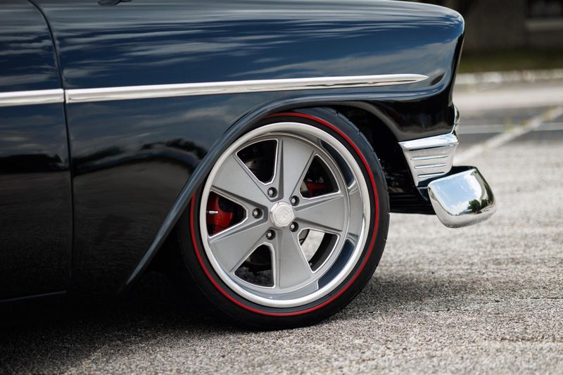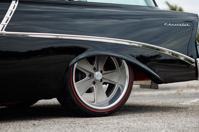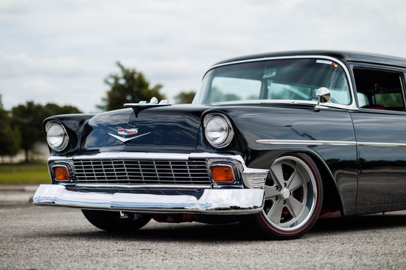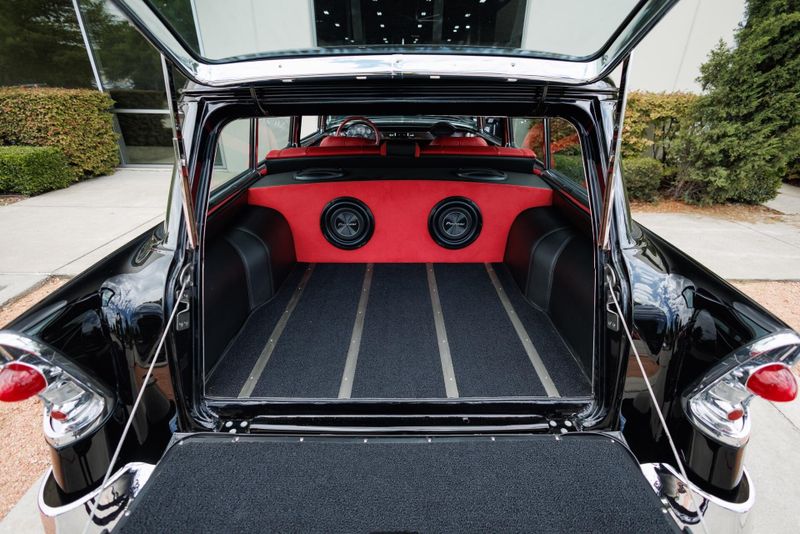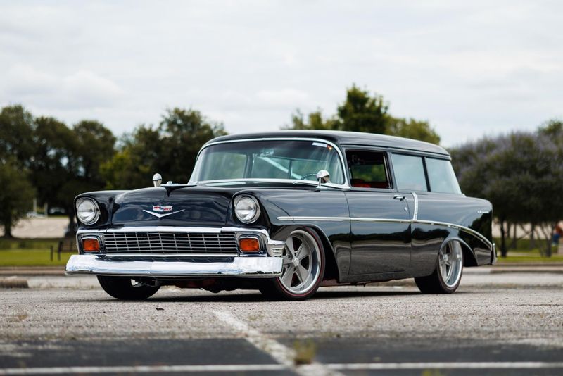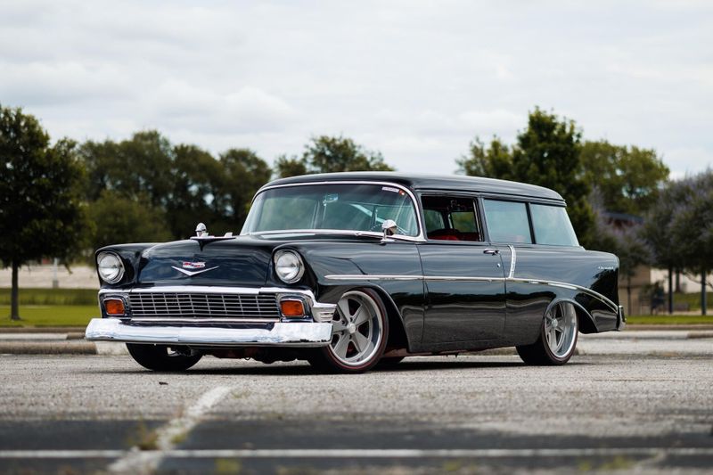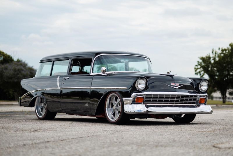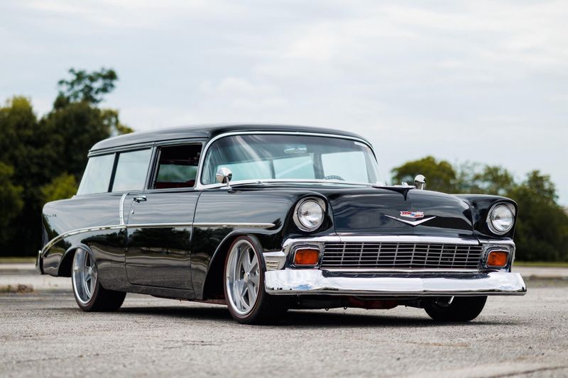 This custom 1956 Chevrolet 150 wagon underwent a professional frame-off restoration and has been driven 80 test miles. It is powered by a 7.4-liter V8 engine with Keith Black pistons, Merlin World heads, a Voodoo camshaft and roller rockers. The engine is mated to an automatic transmission and a Currie posi-traction rear end with 3.70 gearing. The frame-off restoration included new brake lines, a new fuel system and a complete wiring harness. The suspension features rack & pinion steering, QA1 adjustable coilovers, four-wheel power disc brakes, 2-inch drop spindles, and front and rear anti-sway bars. The body received multiple coats of Deep Black paint, new exterior glass, and restored or replaced trim and emblems. The interior includes modern 2+2 bucket seats, a full-length center console, custom door panels, power windows, air conditioning, a Flaming River tilt-steering column, modern gauges, a billet leather steering wheel and a professionally installed Bluetooth stereo system by Pioneer.