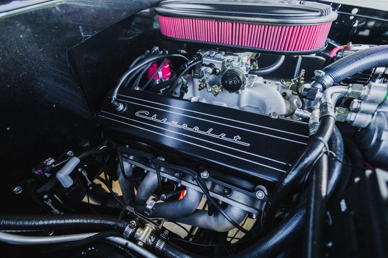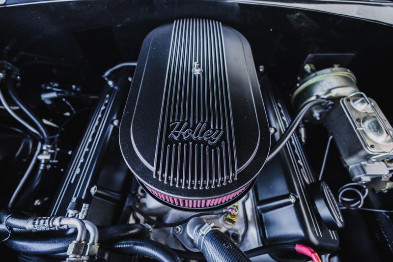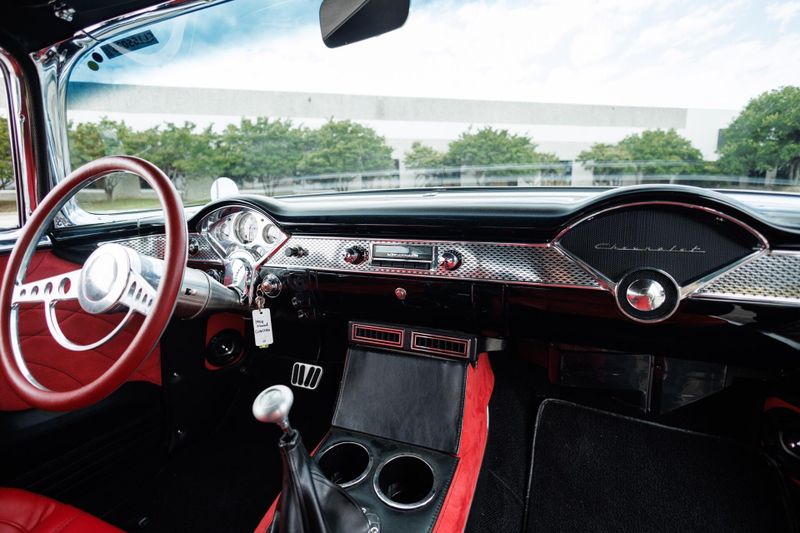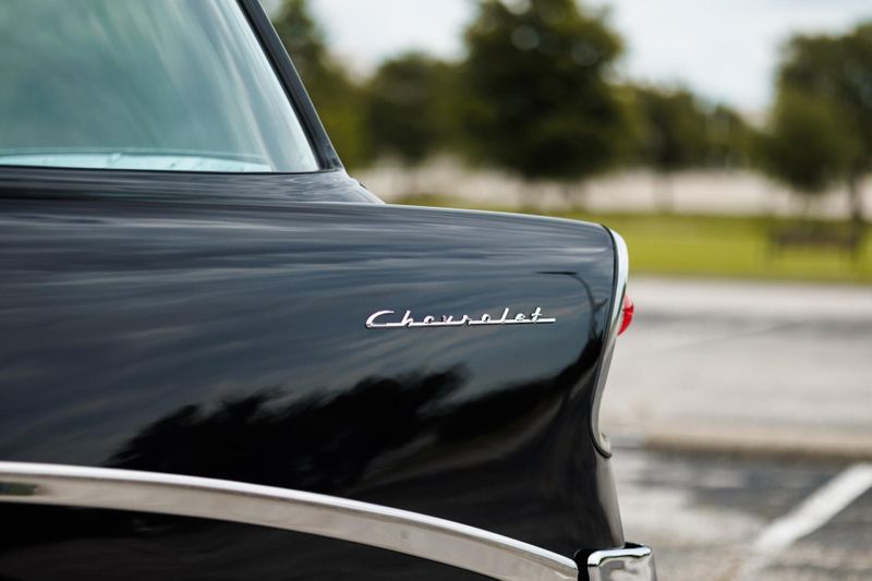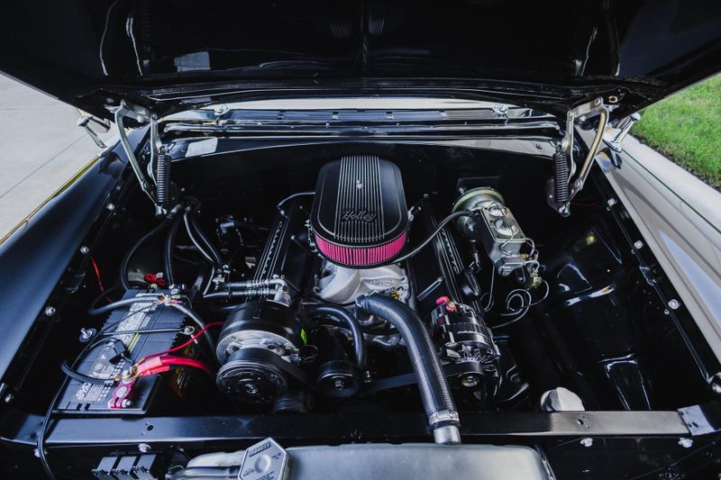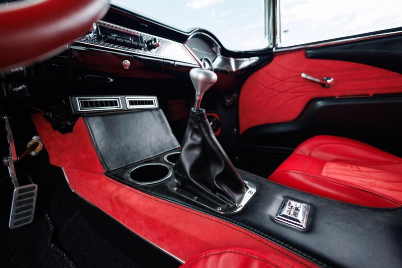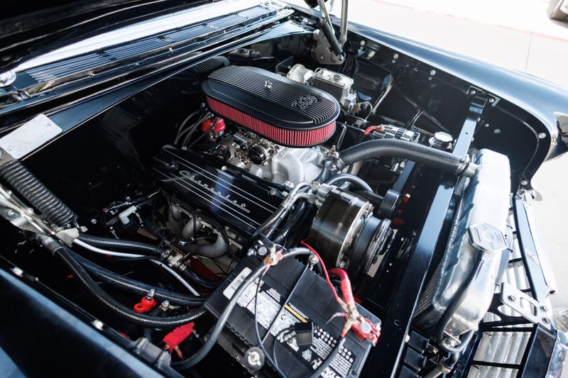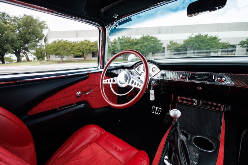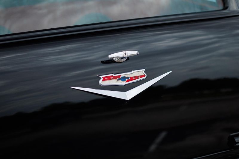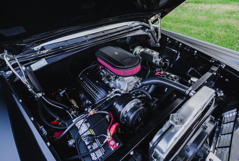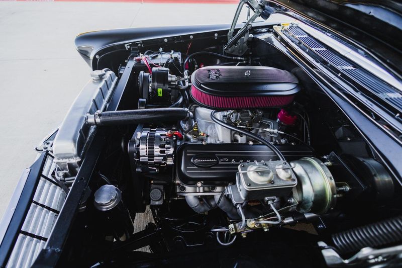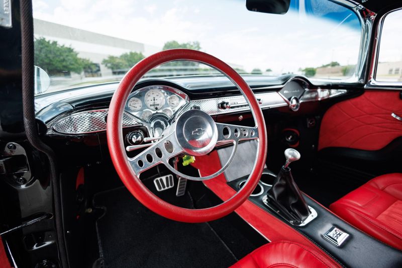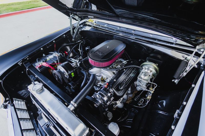 This custom 1956 Chevrolet 150 wagon underwent a professional frame-off restoration and has been driven 80 test miles. It is powered by a 7.4-liter V8 engine with Keith Black pistons, Merlin World heads, a Voodoo camshaft and roller rockers. The engine is mated to an automatic transmission and a Currie posi-traction rear end with 3.70 gearing. The frame-off restoration included new brake lines, a new fuel system and a complete wiring harness. The suspension features rack & pinion steering, QA1 adjustable coilovers, four-wheel power disc brakes, 2-inch drop spindles, and front and rear anti-sway bars. The body received multiple coats of Deep Black paint, new exterior glass, and restored or replaced trim and emblems. The interior includes modern 2+2 bucket seats, a full-length center console, custom door panels, power windows, air conditioning, a Flaming River tilt-steering column, modern gauges, a billet leather steering wheel and a professionally installed Bluetooth stereo system by Pioneer.