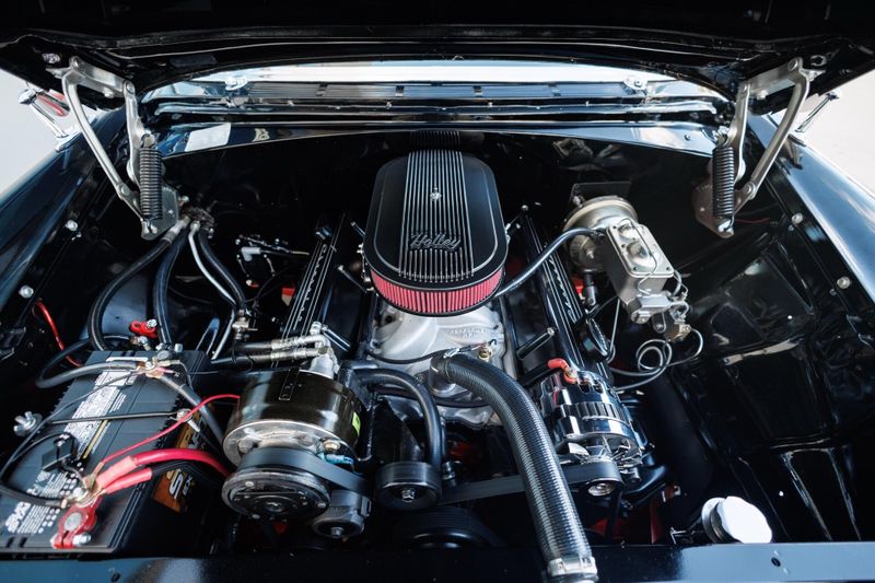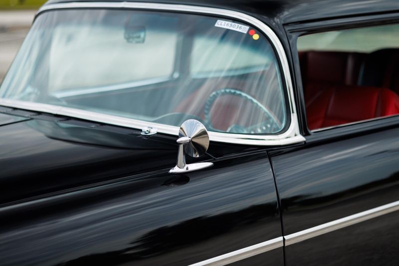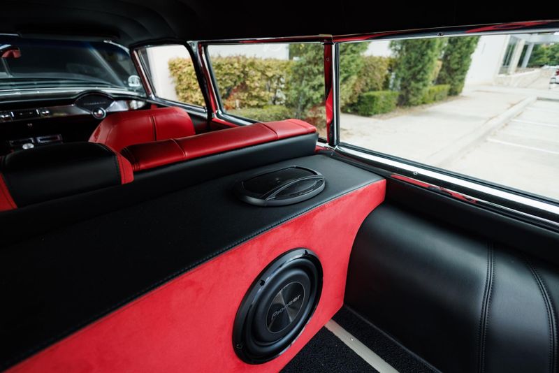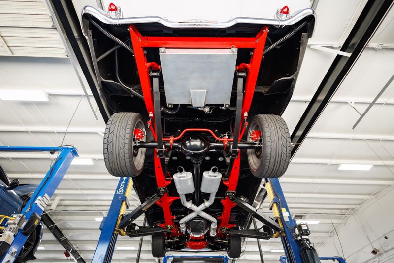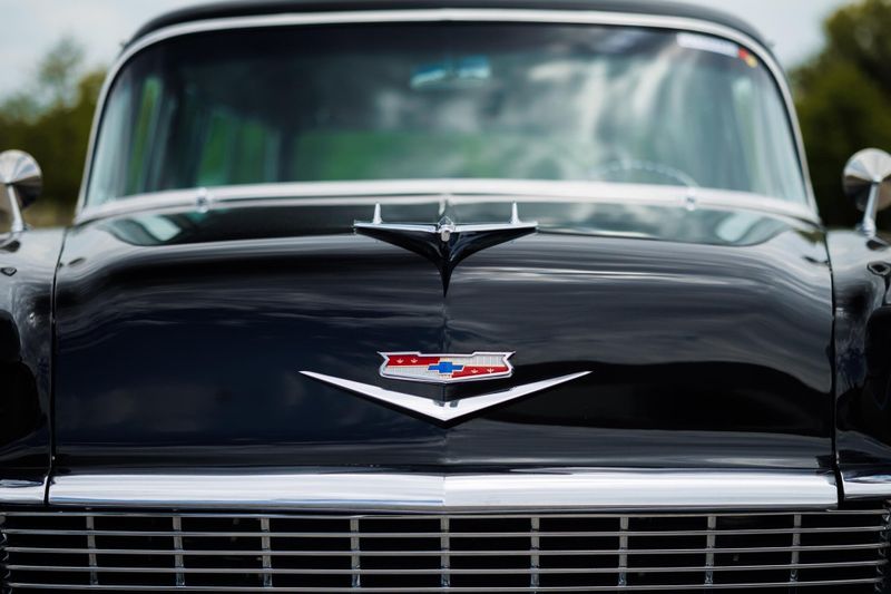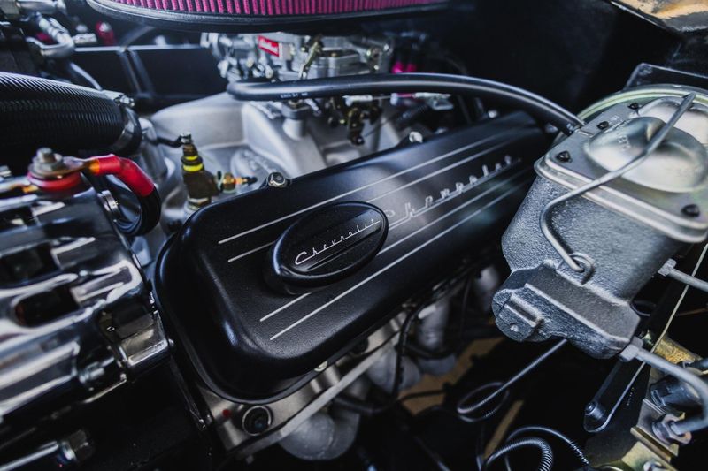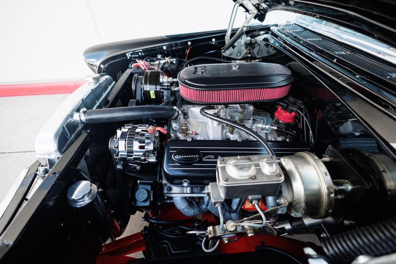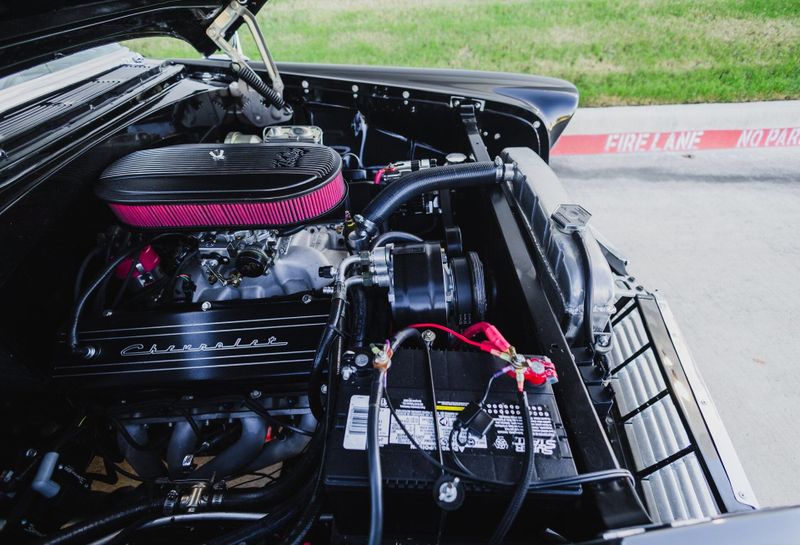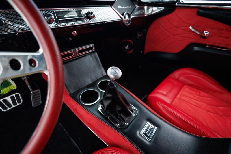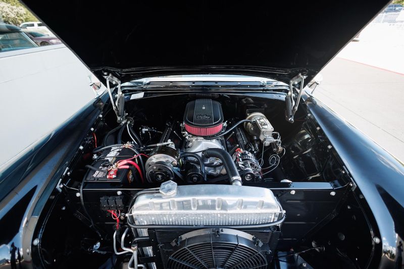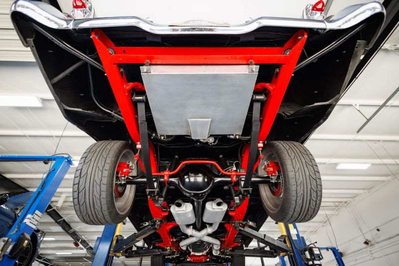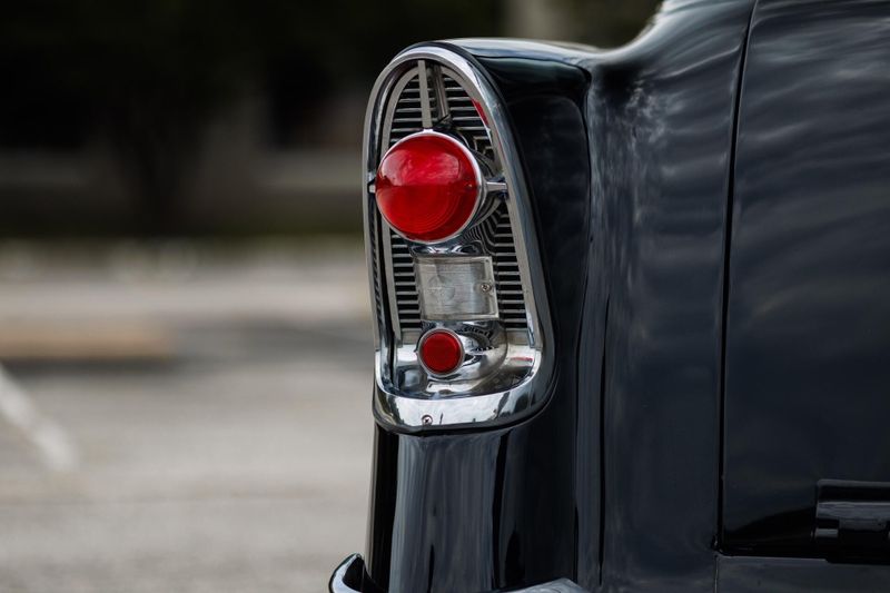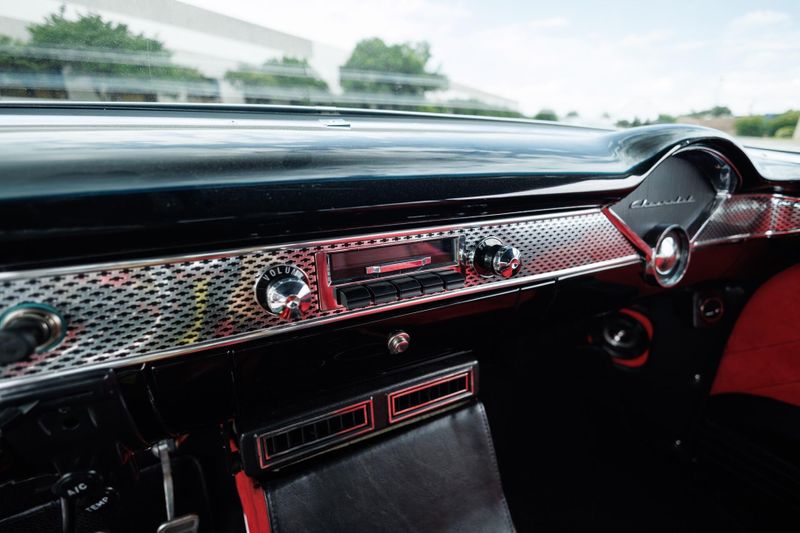 This custom 1956 Chevrolet 150 wagon underwent a professional frame-off restoration and has been driven 80 test miles. It is powered by a 7.4-liter V8 engine with Keith Black pistons, Merlin World heads, a Voodoo camshaft and roller rockers. The engine is mated to an automatic transmission and a Currie posi-traction rear end with 3.70 gearing. The frame-off restoration included new brake lines, a new fuel system and a complete wiring harness. The suspension features rack & pinion steering, QA1 adjustable coilovers, four-wheel power disc brakes, 2-inch drop spindles, and front and rear anti-sway bars. The body received multiple coats of Deep Black paint, new exterior glass, and restored or replaced trim and emblems. The interior includes modern 2+2 bucket seats, a full-length center console, custom door panels, power windows, air conditioning, a Flaming River tilt-steering column, modern gauges, a billet leather steering wheel and a professionally installed Bluetooth stereo system by Pioneer.