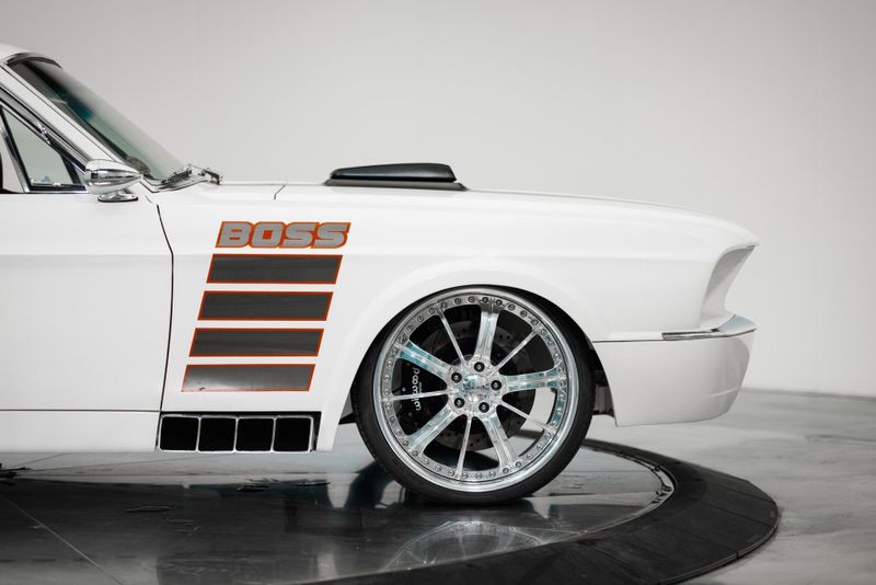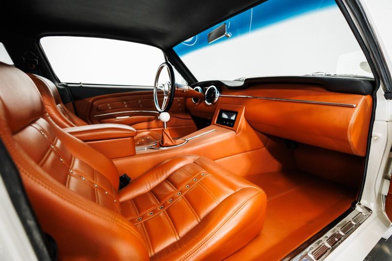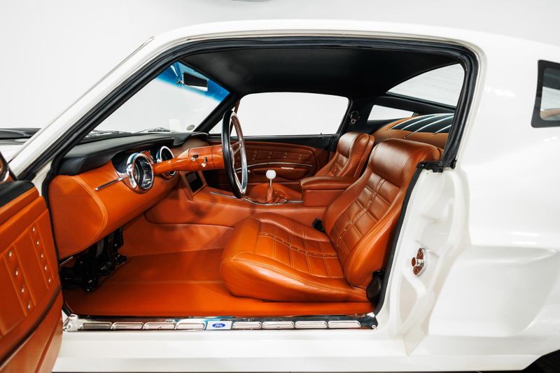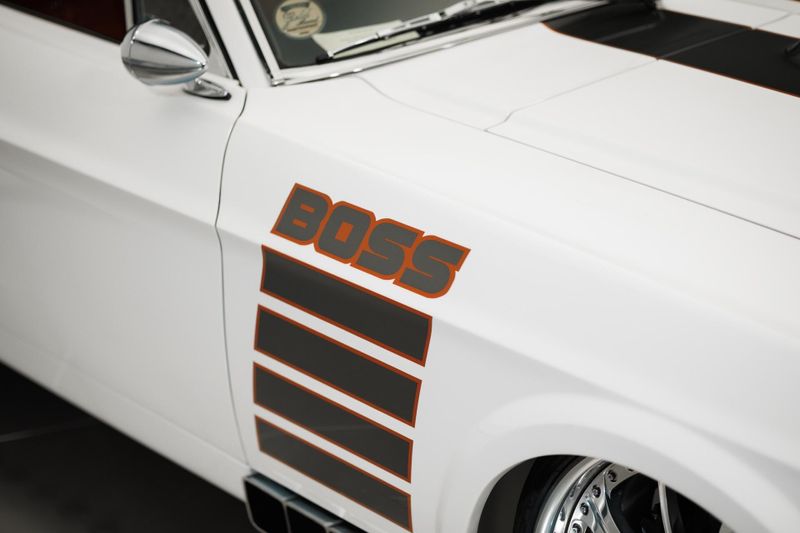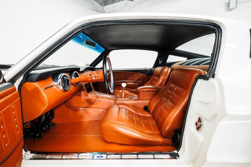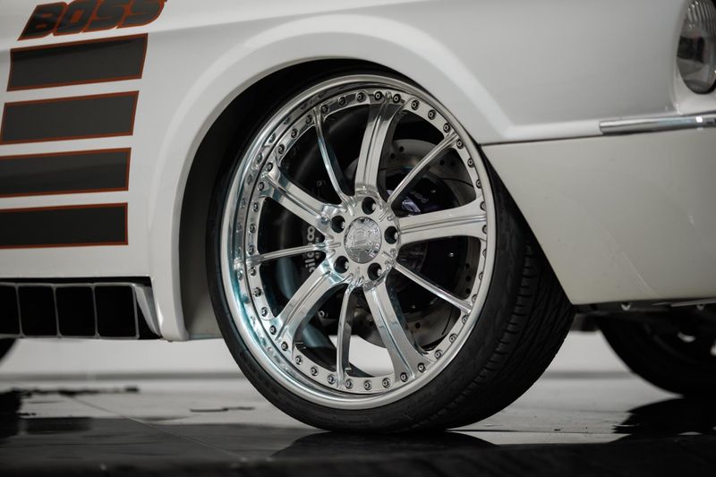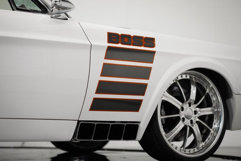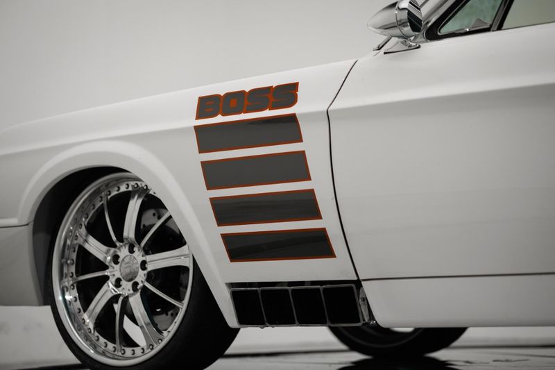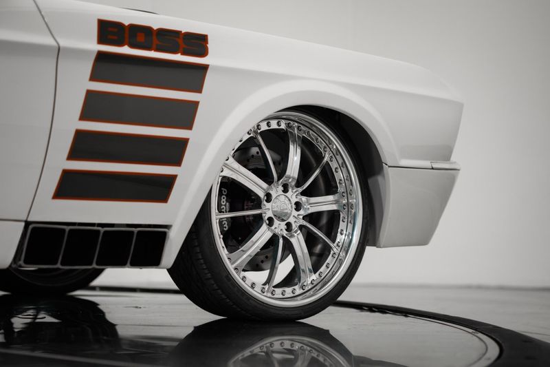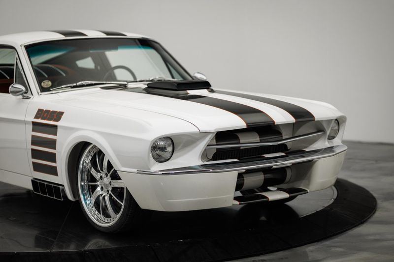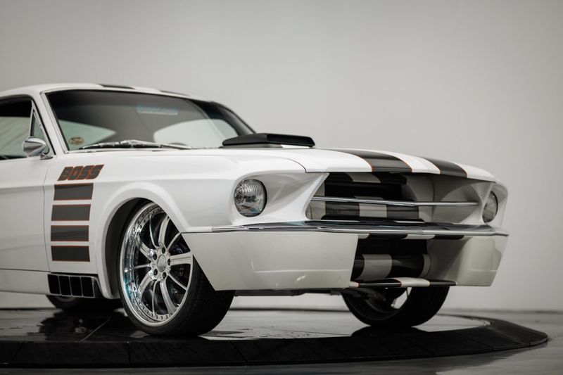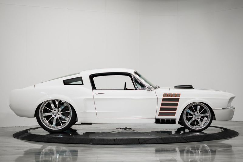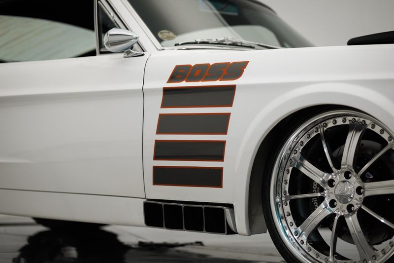 'The Boss' 1967 Ford Mustang fastback was built by Kindig-It Design's Dave Kindig and crew. The build is complete with the use of an Art Morrison custom frame covered by a full belly pan. It has a narrowed Ford 9' rear end to fit the massive 24' Intro wheels in the rear of the car, while up front 20' Intros are nestled by the functional Zoomie exhaust. The exterior is painted in Porsche Carrera White with custom graphics. Metalwork underneath the paint includes a custom stretched hood, with a grille bar floating above the modified front bumpers and air splitter. The rear section of The Boss features enlarged and raised wheel wells, a dovetail trunk lid, flush-mounted taillights and a silvered chrome bumper. Kindig-It smooth door handles give you access into the full custom leather interior done with Basketball Orange and black leather throughout. Located inside is a JL Audio system, Vintage Air, custom gauges and power windows. Under the hood is an extensive amount of custom sheet metal surrounding an ATI Procharged Ford 427ci V8 engine producing 700hp backed by a Tremec 6-speed manual transmission. This fastback has been featured in numerous magazines all over the world, as well as featured on 'Hot Rod TV,' 'Car Crazy' and 'Bitchin' Rides.'