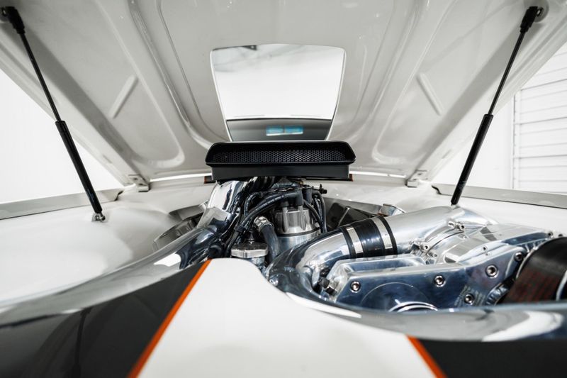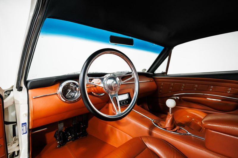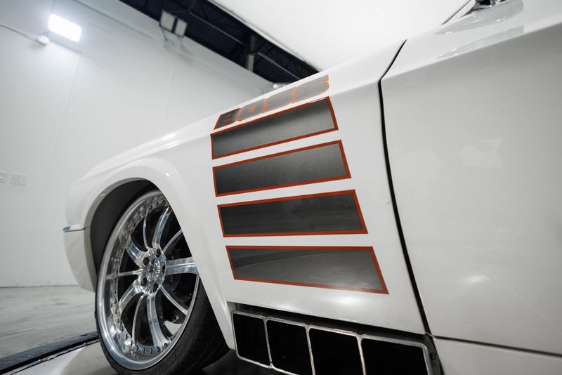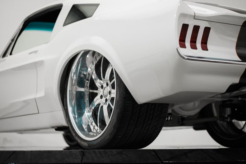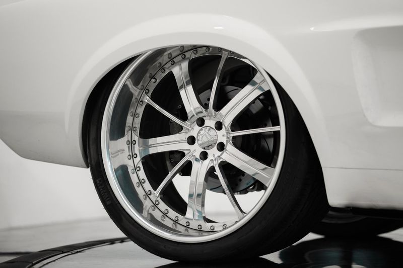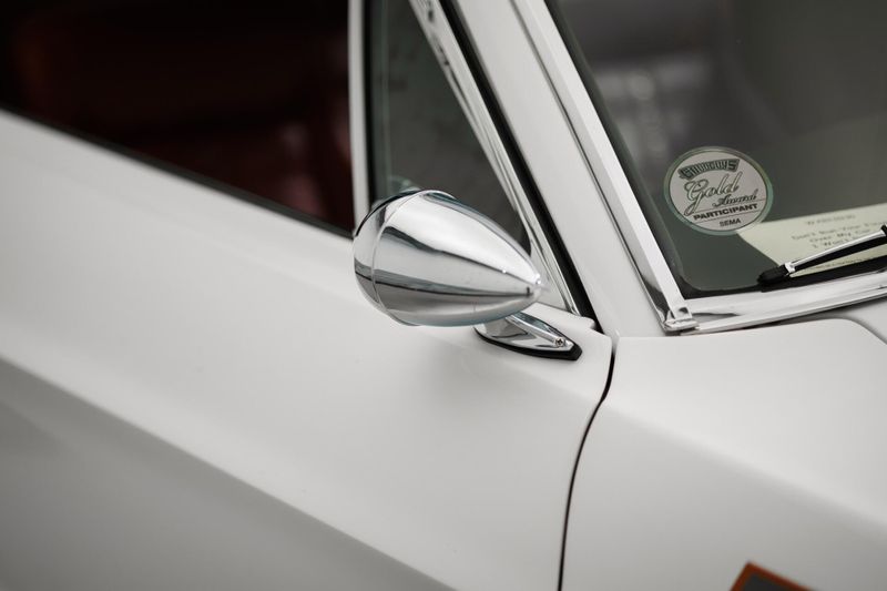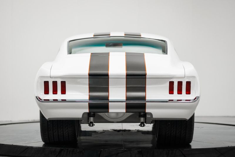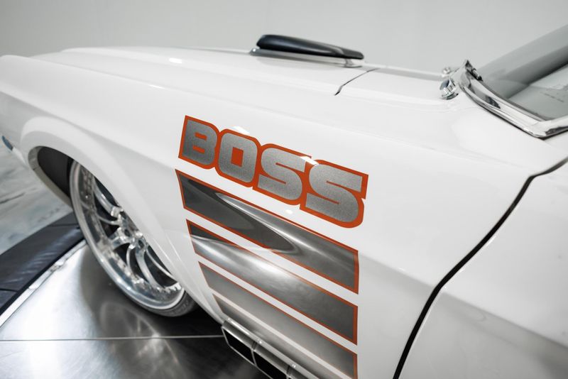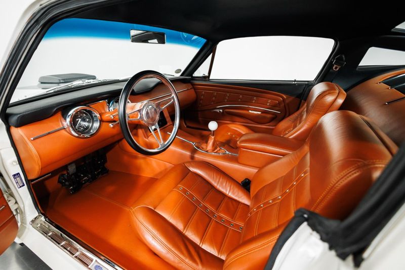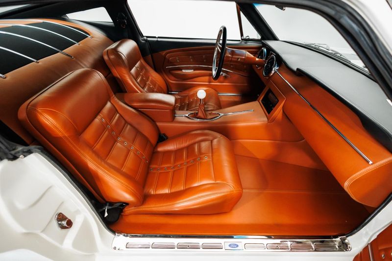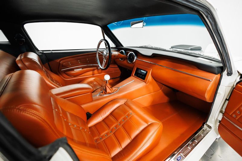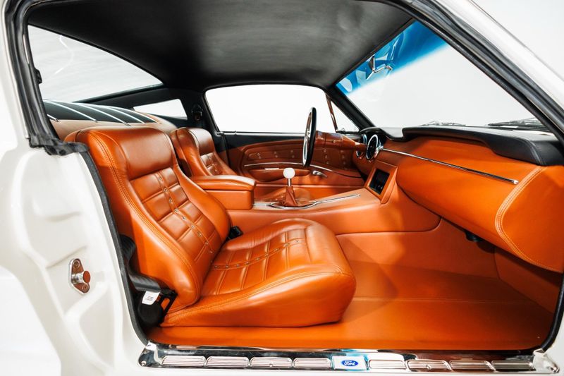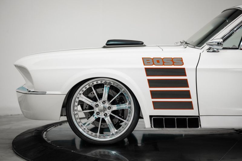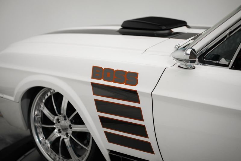 'The Boss' 1967 Ford Mustang fastback was built by Kindig-It Design's Dave Kindig and crew. The build is complete with the use of an Art Morrison custom frame covered by a full belly pan. It has a narrowed Ford 9' rear end to fit the massive 24' Intro wheels in the rear of the car, while up front 20' Intros are nestled by the functional Zoomie exhaust. The exterior is painted in Porsche Carrera White with custom graphics. Metalwork underneath the paint includes a custom stretched hood, with a grille bar floating above the modified front bumpers and air splitter. The rear section of The Boss features enlarged and raised wheel wells, a dovetail trunk lid, flush-mounted taillights and a silvered chrome bumper. Kindig-It smooth door handles give you access into the full custom leather interior done with Basketball Orange and black leather throughout. Located inside is a JL Audio system, Vintage Air, custom gauges and power windows. Under the hood is an extensive amount of custom sheet metal surrounding an ATI Procharged Ford 427ci V8 engine producing 700hp backed by a Tremec 6-speed manual transmission. This fastback has been featured in numerous magazines all over the world, as well as featured on 'Hot Rod TV,' 'Car Crazy' and 'Bitchin' Rides.'