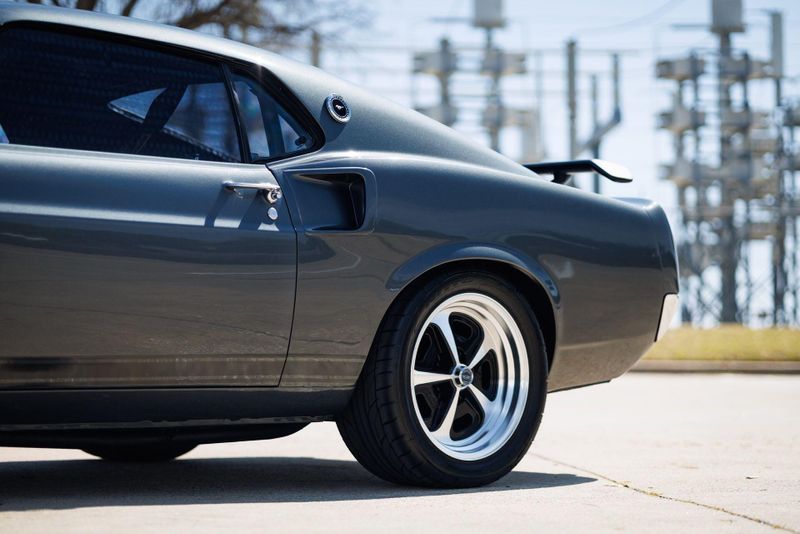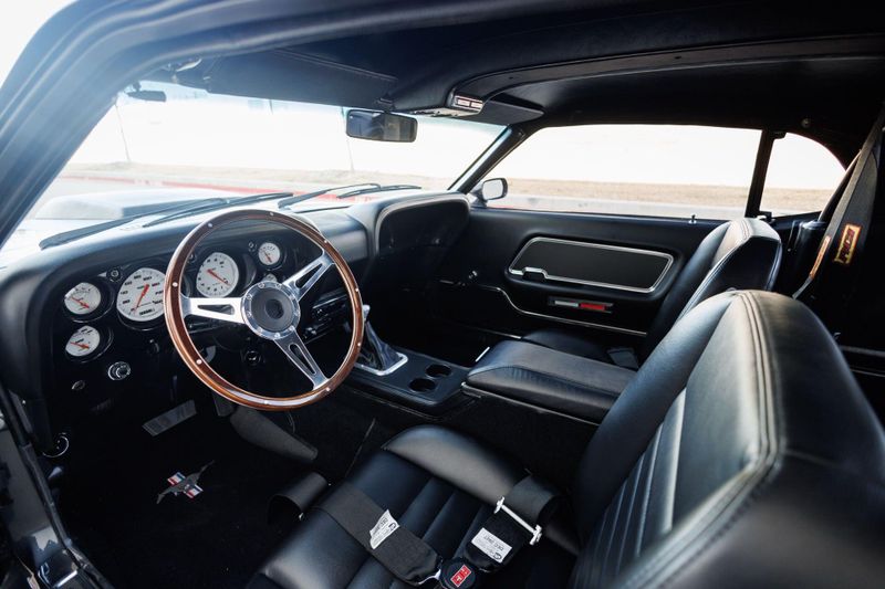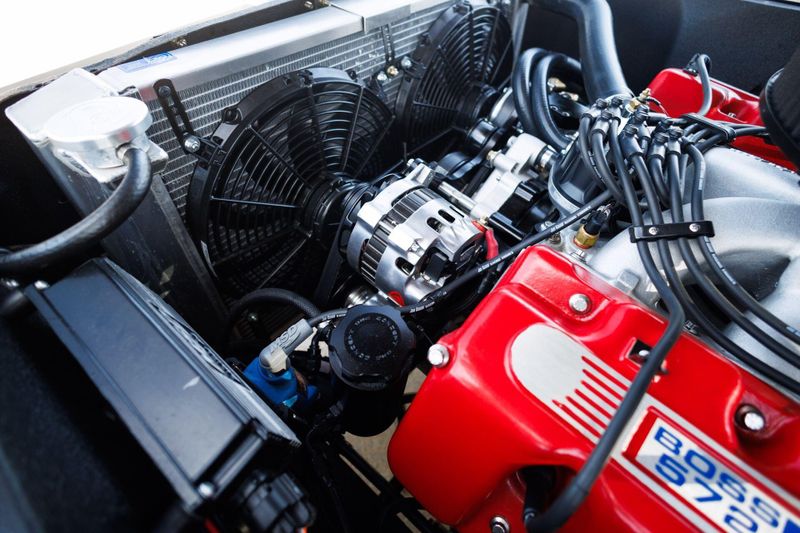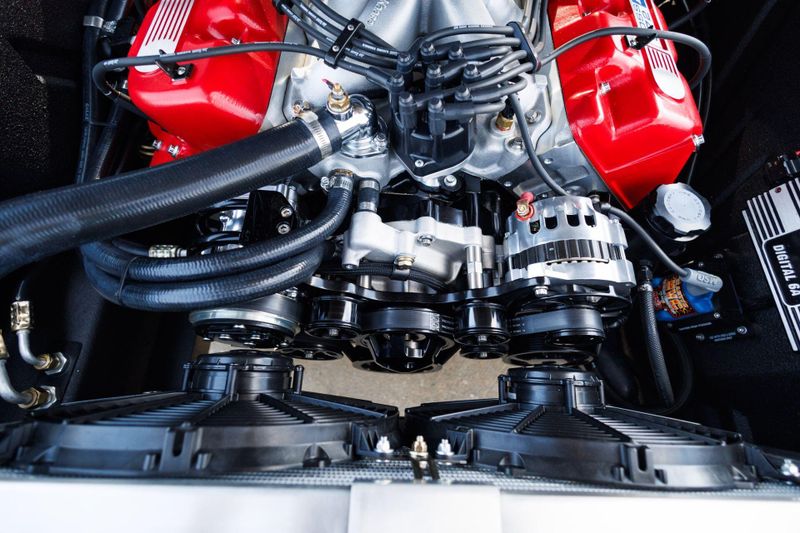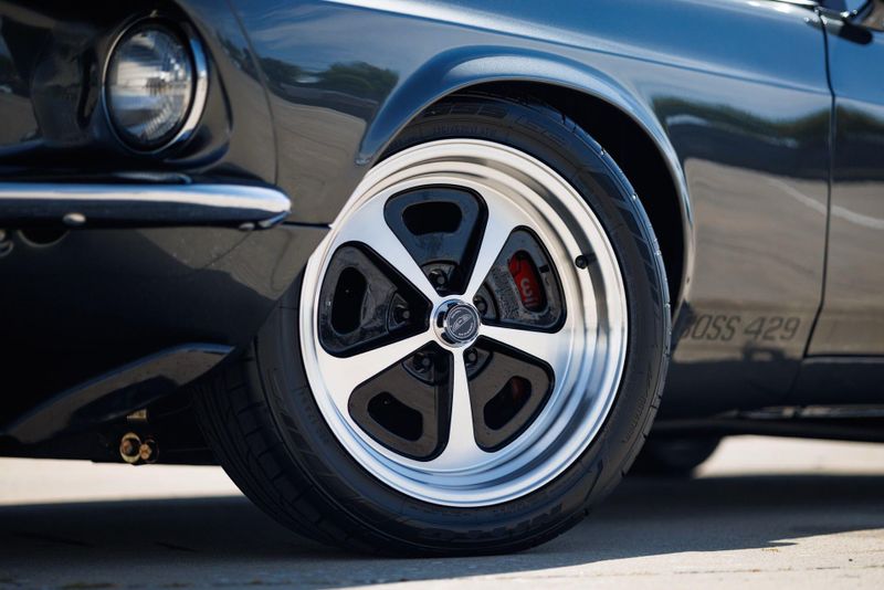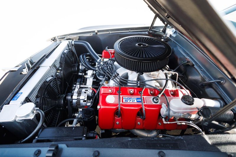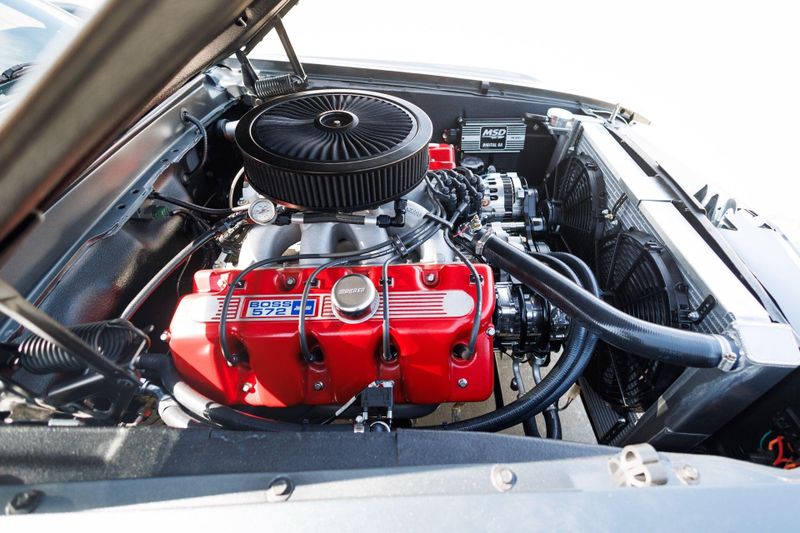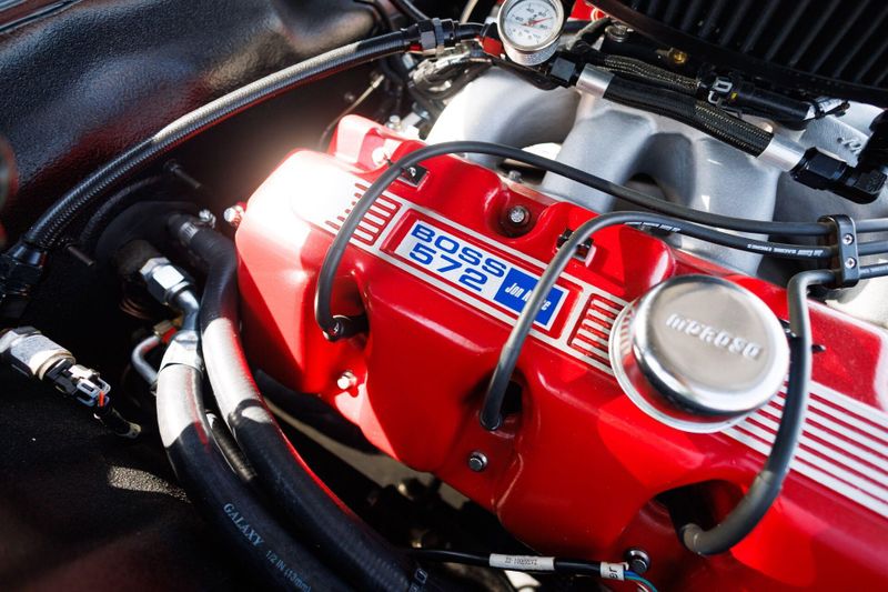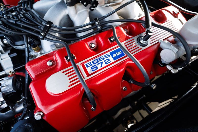 Power comes from a John Kaase Racing Engines BOSS NINE 572ci V8, a modern evolution of the legendary Boss 429 platform. Built with a 4340 forged steel crankshaft and rods, and fed by Holley Terminator X electronic fuel injection, this engine delivers 850+ HP of raw, violent performance. Cooling is handled by a Be Cool radiator with dual electric fans, ensuring this beast stays composed under pressure.