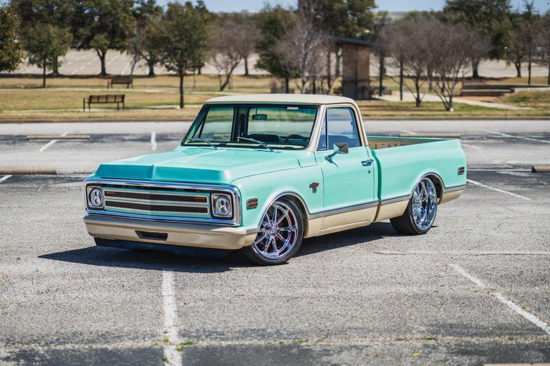 This complete custom 1970 Chevrolet C10 factory short-bed pickup is powered by a GM Performance 350ci crate V8 engine mated to a 700R4 automatic transmission and a Lokar floor shifter. It is equipped with a 12-bolt rear end, Billet Specialties front-runner system, polished compressor, alternator and pulleys, MSD ignition, billet valve covers, Hedman headers with a 3-inch exhaust and an aluminum radiator with electric fans. It features QA1 tubular upper and lower control arms, front and rear coilovers, rear trailing arms, and front and rear sway bars. Stopping power is courtesy of a Wilwood master cylinder with power booster, 4-piston Wilwood brakes front and rear, drilled and slotted rotors and braided brake lines. It features a Borgeson power steering box and a Lokar emergency brake. The interior features TMI bucket seats and door panels, power windows, tilt column with billet wheel, Classic Instruments gauges, custom center console, Kenwood audio system, billet pedals and seatbelts. It also features an oak bed floor, rear-mounted fuel tank, 20x10 U.S. Mags wheels in the rear with 295/30/20 tires and 20x8 in the front with 245/40/20 tires, plus a custom hood treatment. Head turner and names ''Deminted''.