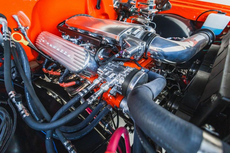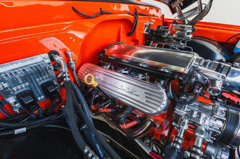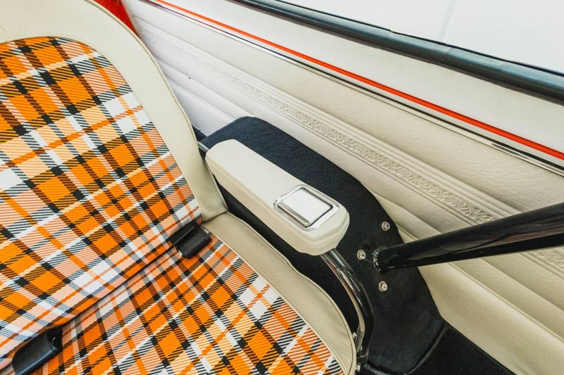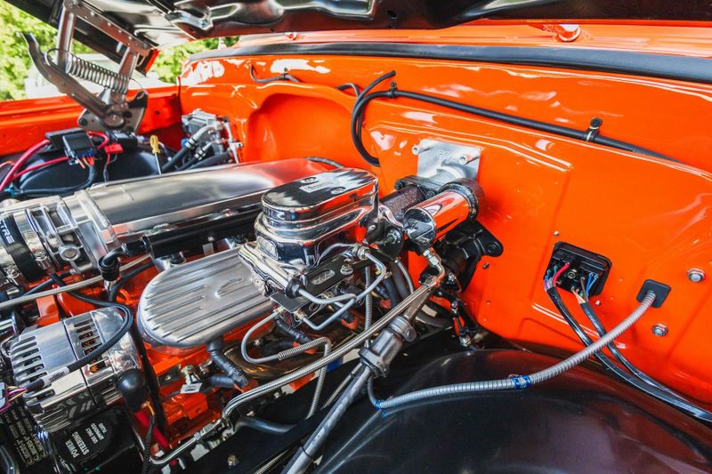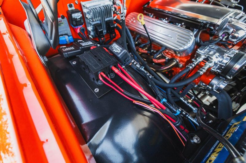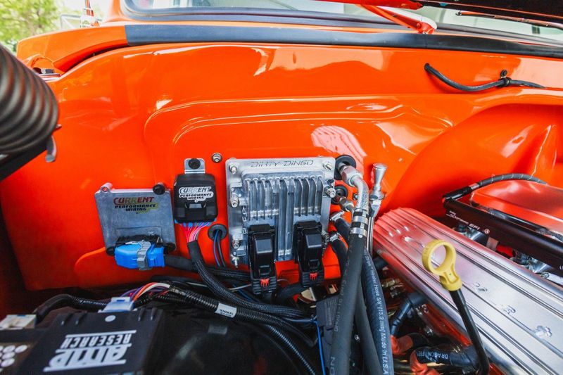 Riding on Goodyear tires mounted on Mickey Thompson wheels, with the braking handled by a Hydro-Vac brake booster system. Upgrades include a powder-coated custom steel roll bar with shoulder harness seat belts and a removable hardtop for an all-season ride. The interior includes all-new upholstery, carpet and weatherstripping. The comfort is handled by a Vintage Air system. The dashboard includes a Dakota Digital RTX instrument cluster and a reproduction AM/FM stereo. For safety, LED headlights and taillights were installed. For comfort, this ride includes an Ididit tilt steering column.
