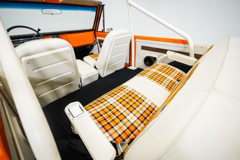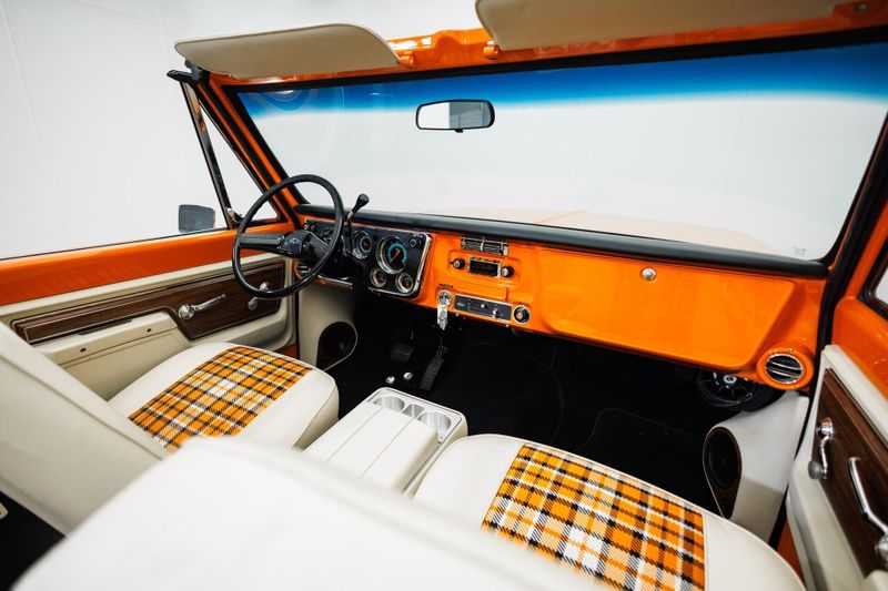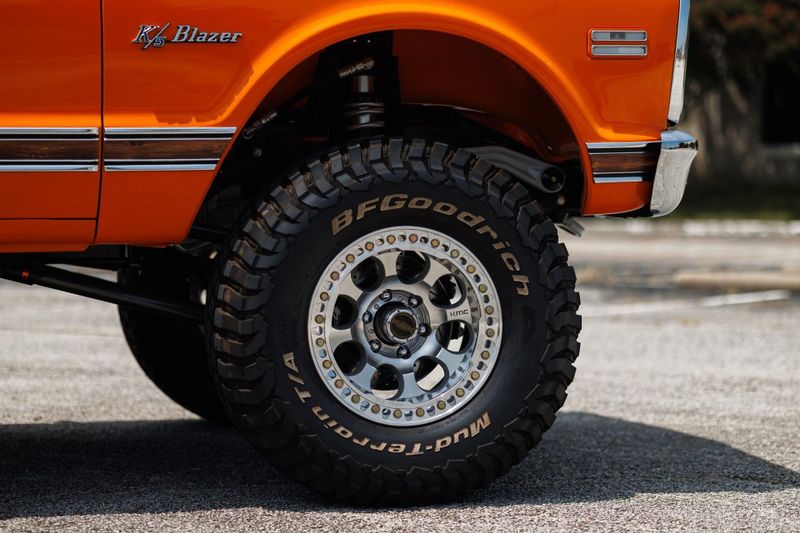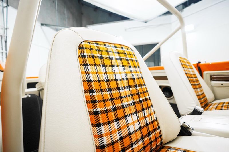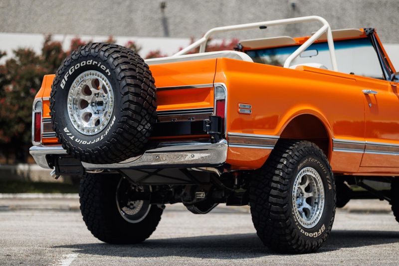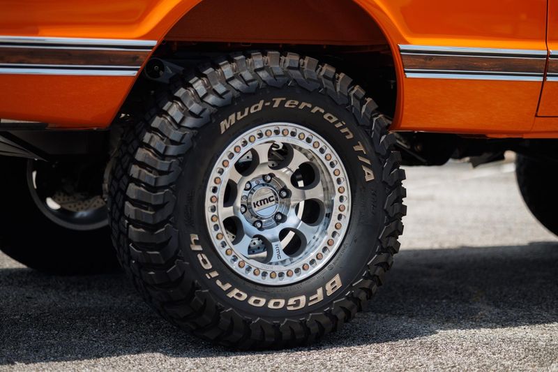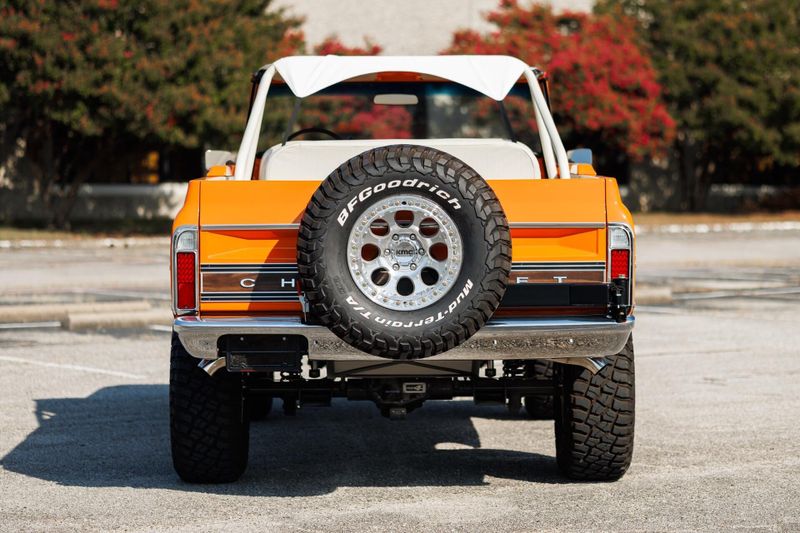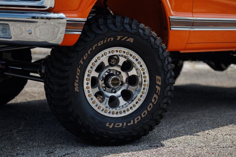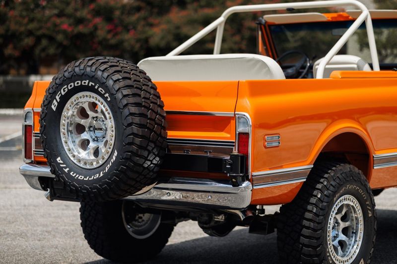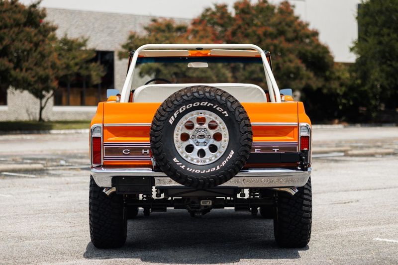 The topless exterior features a pair of Hogan Built shorty bedrail caps. The rear bumper has been cut, sectioned, TIG-welded and re-chromed, giving this Blazer an OEM look. Behind the custom rear bumper, it features a fully TIG-welded custom-made spare tire swing carrier that has been engineered and designed to fit and function perfectly. This K5 rides on 17-inch KMC beadlock wheels wrapped in 35-inch BFGoodrich tires. Contrasting with the exterior is the Bone White CST Highlander interior, featuring K5 Orange Plaid seat inserts and a TIG-welded OEM-style roll bar. Keeping the interior comfortable is an all-new Vintage Air system and new tilt steering column. Classic instrument gauges have been installed, along with all-new dash components and a full American Autowire harness. The audio system includes a RetroSound head unit, four 6-inch infinity speakers and two 10-inch JL subwoofers that play through the 1,000-watt amplifier. All this sound is enhanced by Dynamat sound-deadener and insulation throughout. If you are seeking the best built by the best, you just found your new car. This K5 is amazing!