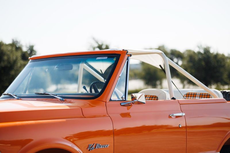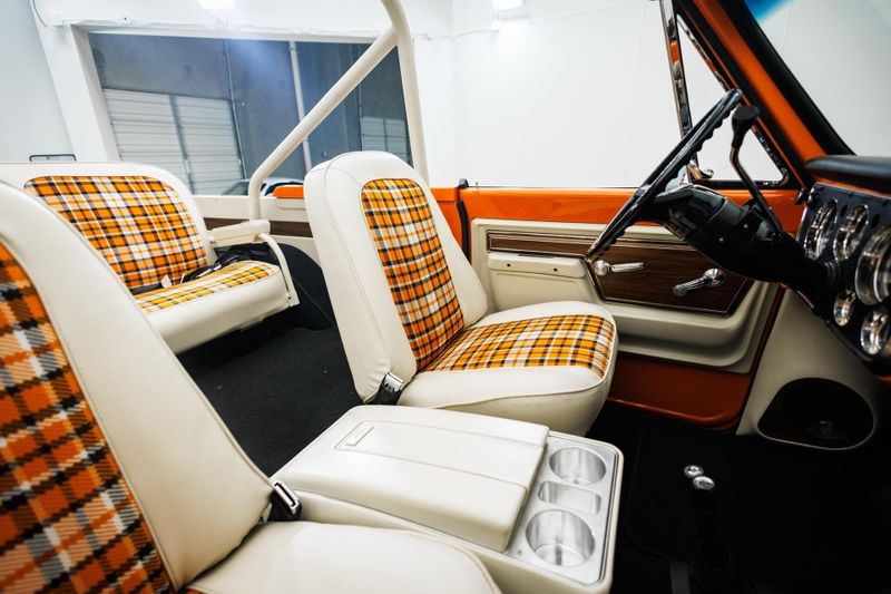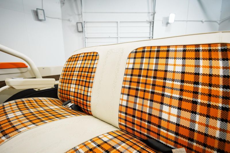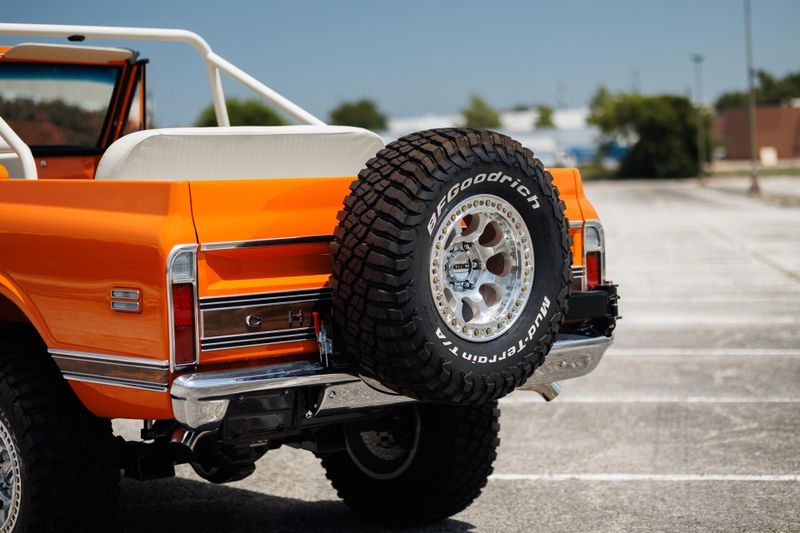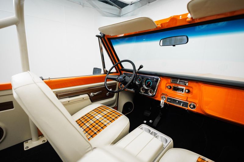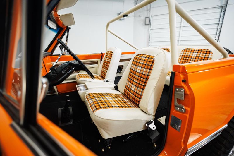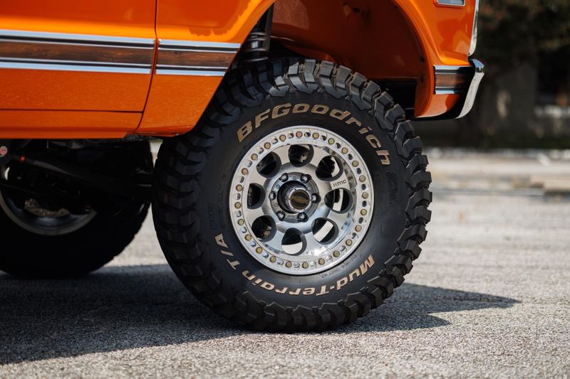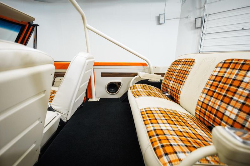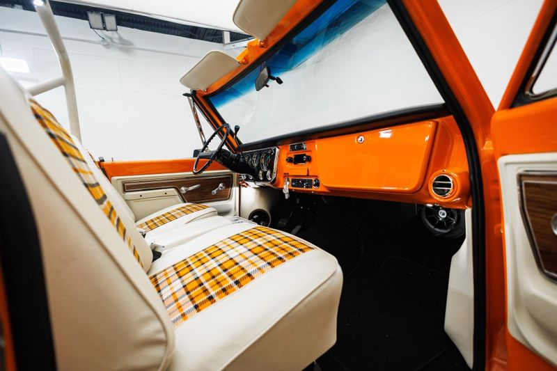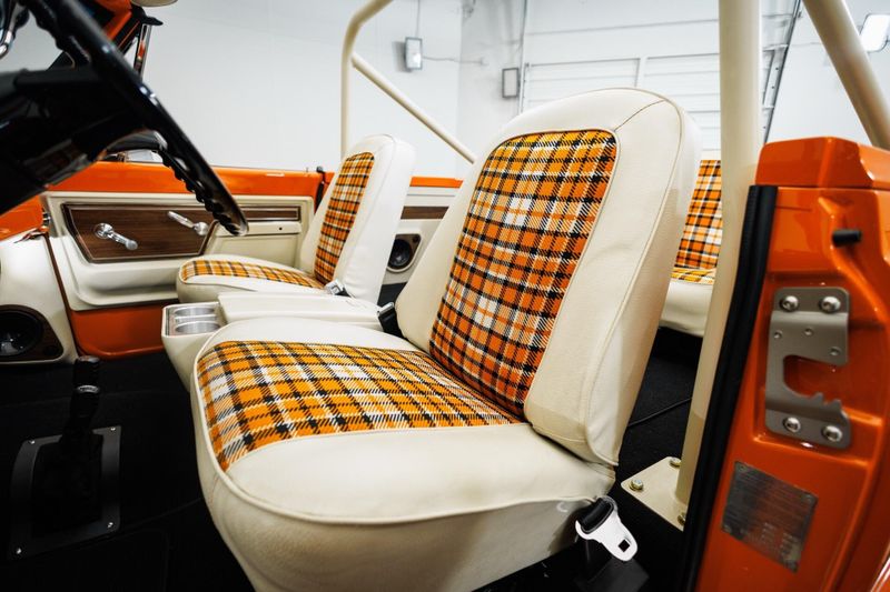 The topless exterior features a pair of Hogan Built shorty bedrail caps. The rear bumper has been cut, sectioned, TIG-welded and re-chromed, giving this Blazer an OEM look. Behind the custom rear bumper, it features a fully TIG-welded custom-made spare tire swing carrier that has been engineered and designed to fit and function perfectly. This K5 rides on 17-inch KMC beadlock wheels wrapped in 35-inch BFGoodrich tires. Contrasting with the exterior is the Bone White CST Highlander interior, featuring K5 Orange Plaid seat inserts and a TIG-welded OEM-style roll bar. Keeping the interior comfortable is an all-new Vintage Air system and new tilt steering column. Classic instrument gauges have been installed, along with all-new dash components and a full American Autowire harness. The audio system includes a RetroSound head unit, four 6-inch infinity speakers and two 10-inch JL subwoofers that play through the 1,000-watt amplifier. All this sound is enhanced by Dynamat sound-deadener and insulation throughout. If you are seeking the best built by the best, you just found your new car. This K5 is amazing!