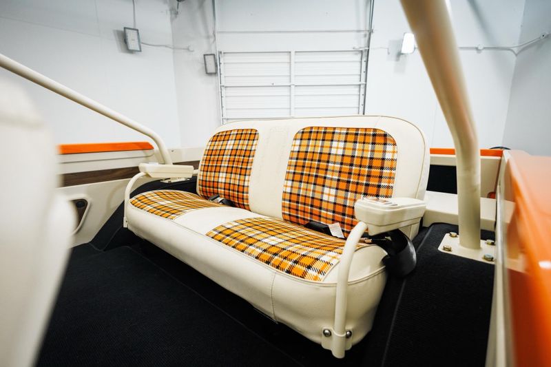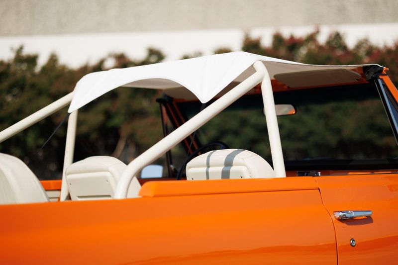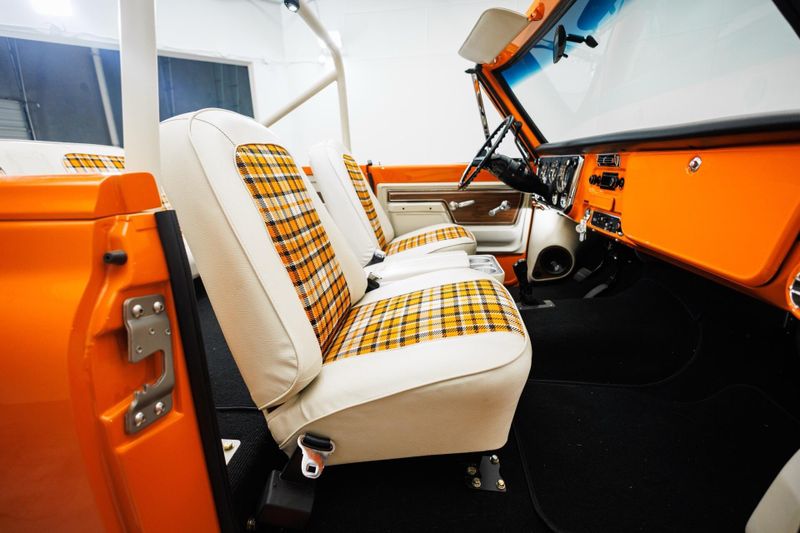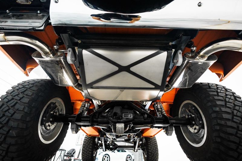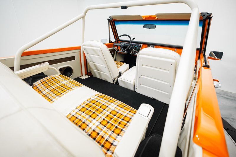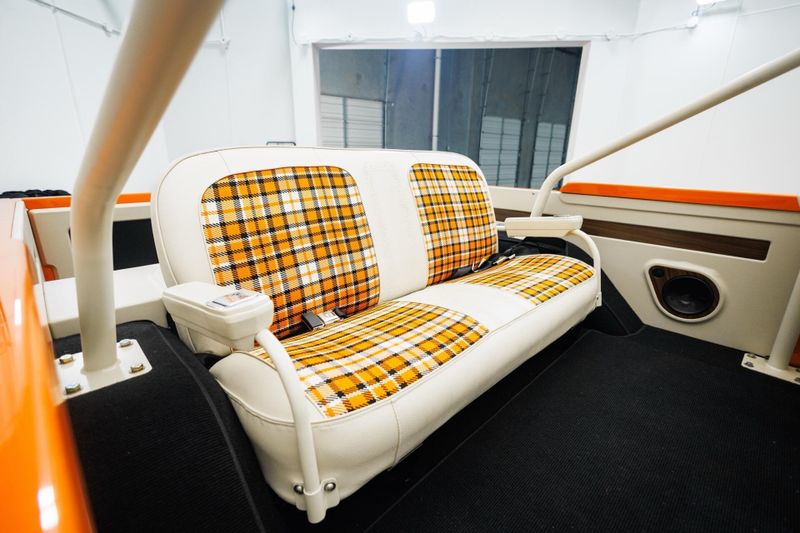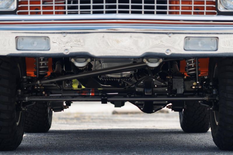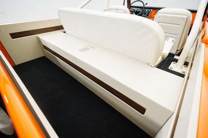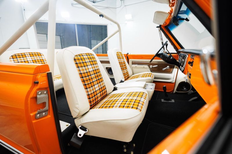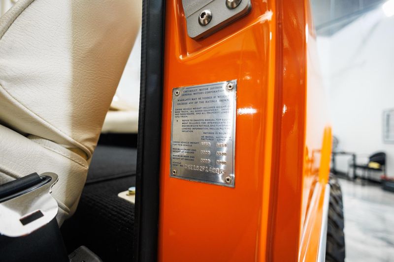 The topless exterior features a pair of Hogan Built shorty bedrail caps. The rear bumper has been cut, sectioned, TIG-welded and re-chromed, giving this Blazer an OEM look. Behind the custom rear bumper, it features a fully TIG-welded custom-made spare tire swing carrier that has been engineered and designed to fit and function perfectly. This K5 rides on 17-inch KMC beadlock wheels wrapped in 35-inch BFGoodrich tires. Contrasting with the exterior is the Bone White CST Highlander interior, featuring K5 Orange Plaid seat inserts and a TIG-welded OEM-style roll bar. Keeping the interior comfortable is an all-new Vintage Air system and new tilt steering column. Classic instrument gauges have been installed, along with all-new dash components and a full American Autowire harness. The audio system includes a RetroSound head unit, four 6-inch infinity speakers and two 10-inch JL subwoofers that play through the 1,000-watt amplifier. All this sound is enhanced by Dynamat sound-deadener and insulation throughout. If you are seeking the best built by the best, you just found your new car. This K5 is amazing!