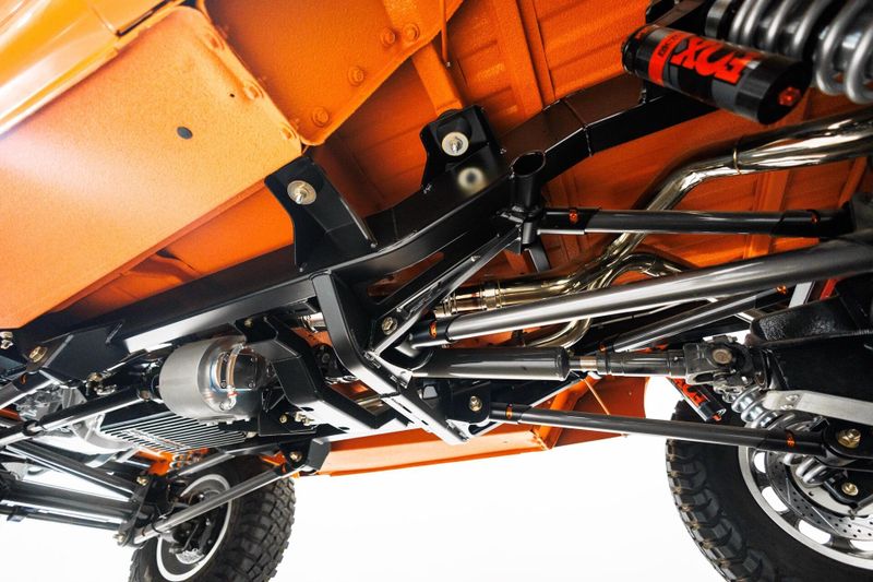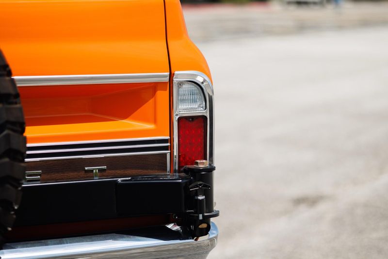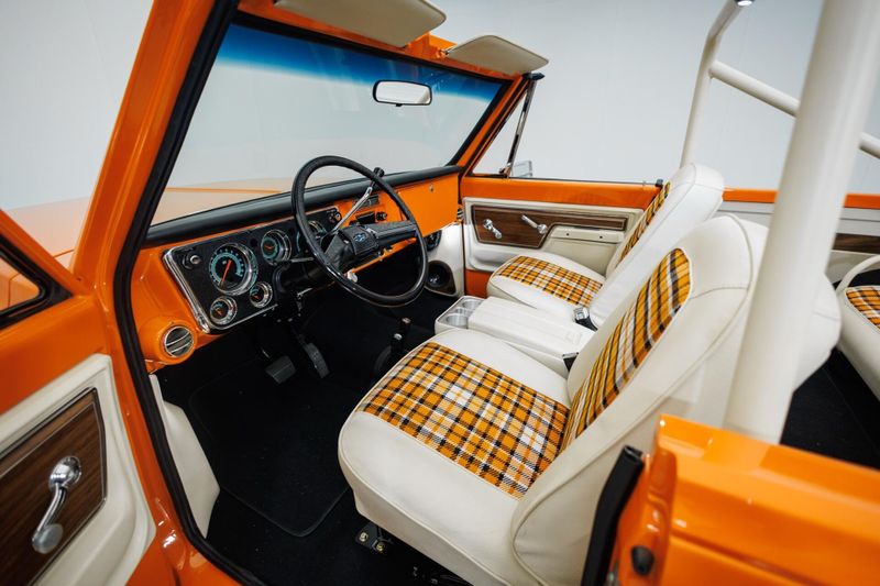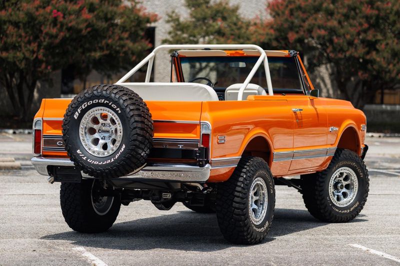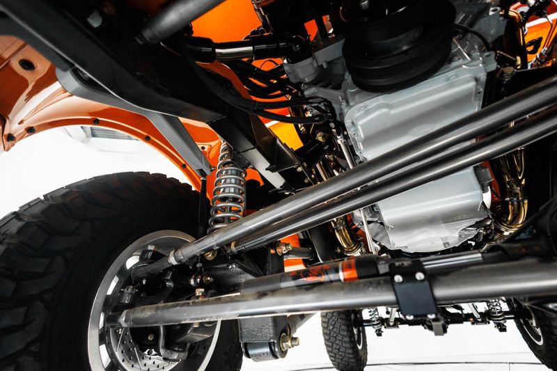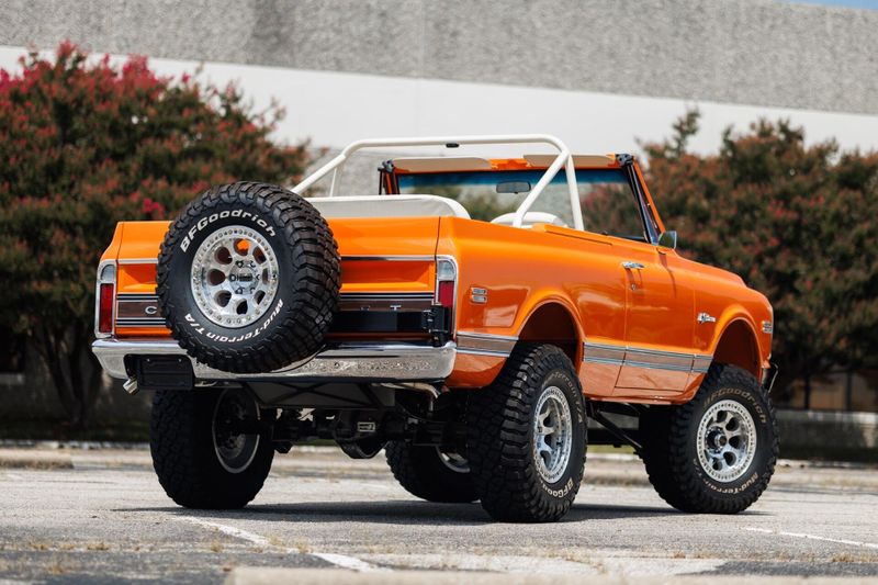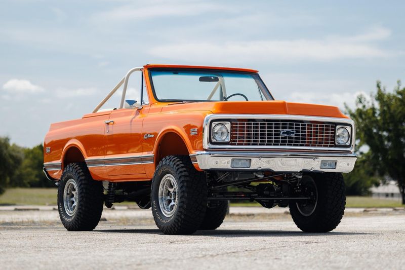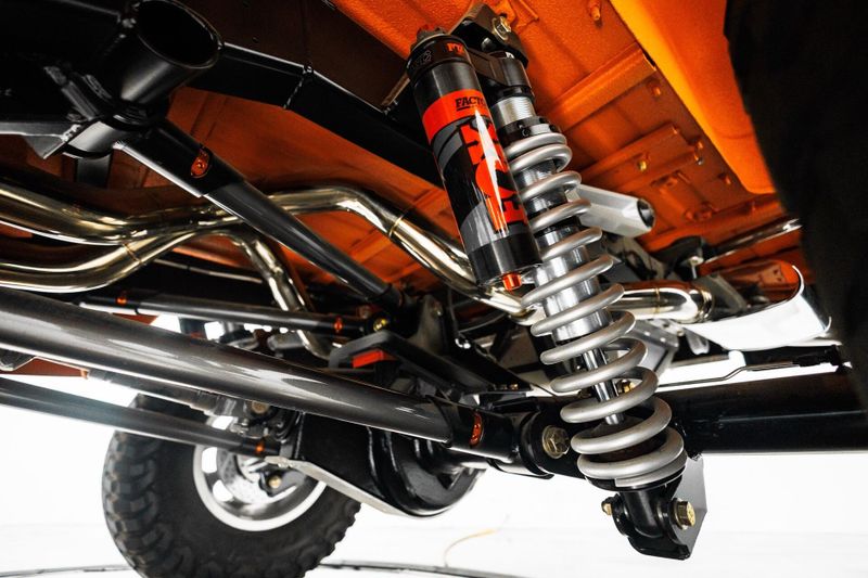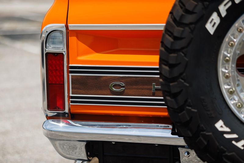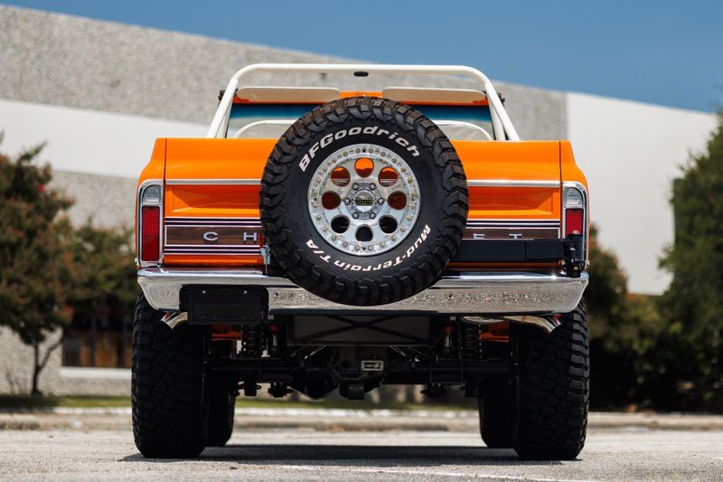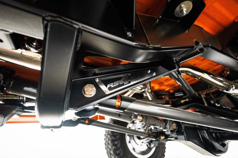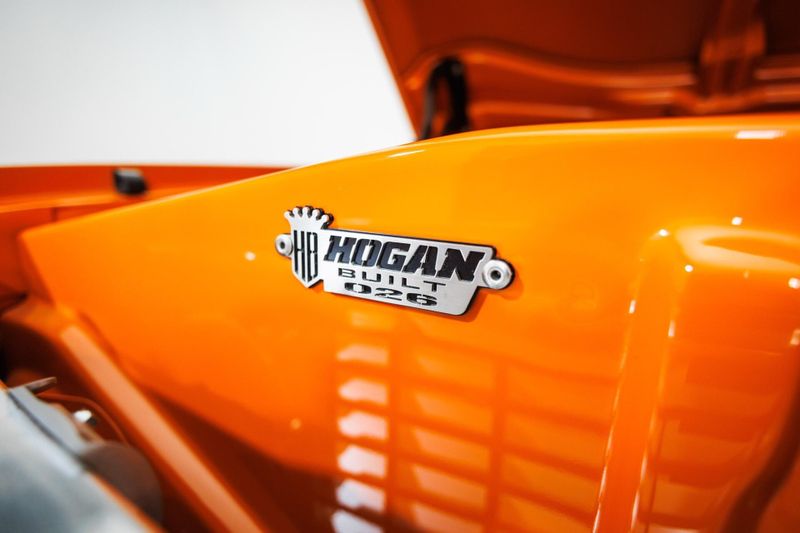 Nicknamed ''Renn'' and riding on a Roadster Shop RS4 chassis, this Hogan Built 1972 Chevrolet K5 Blazer is powered by a 525hp 6.2-liter LS3 engine backed by a Hughes 4L80 4-speed automatic transmission. Under the hood features an Avalanche-colored engine that has been upfitted with a Holley intake manifold, 14-inch air cleaner and vintage Chevrolet valve covers with hidden coil packs. Keeping the drivability a top priority, a CPP hydro-boost system was installed, along with a DeWitts radiator and a CVF front drive system. The Roadster Shop RS4 chassis features upgraded 13-inch Baer brakes, oversized sway bar links, triangulated front and rear 4-links, Currie high-pinion axles with 4.56 gears, 20-way adjustable Fox 2.0 coilovers, Fox hydraulic bump stops and a 24-way adjustable Fox steering stabilizer. Dispersing the power through the chassis is a twin-stick Atlas transfer case. A 3-inch fully polished stainless-steel exhaust has been fabricated and completely TIG-welded utilizing V-band clamps and four MagnaFlow mufflers. Before marrying the '72 K5 body to the chassis, the body was completely sandblasted, metalworked and bodyworked and shows the result of a concours-worthy refinish shining bright in Omaha Orange.
