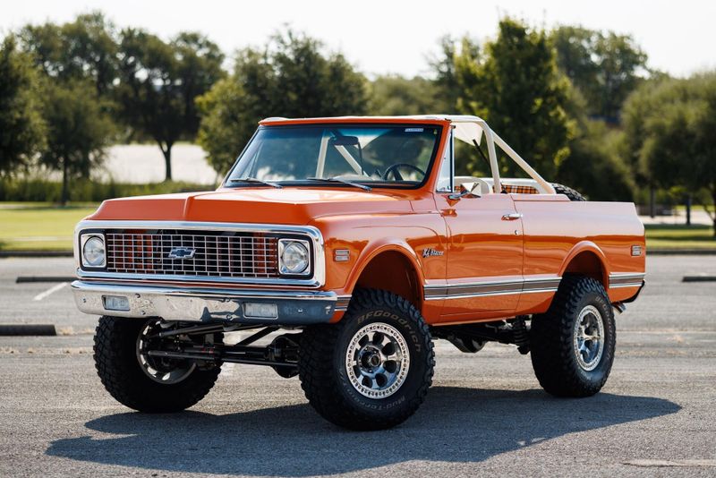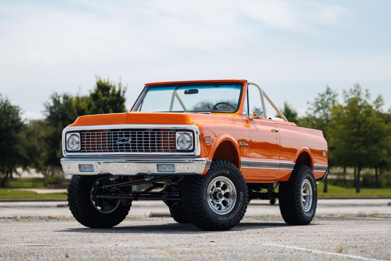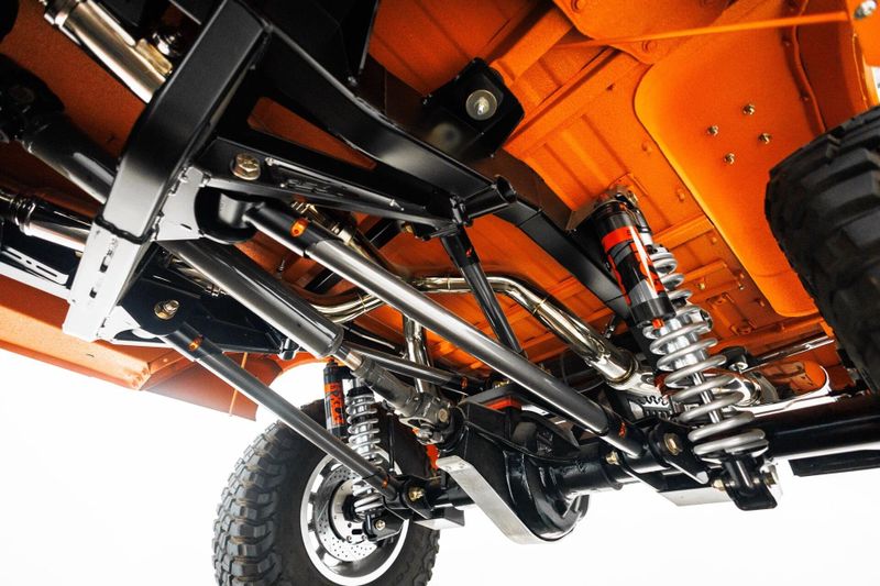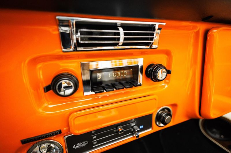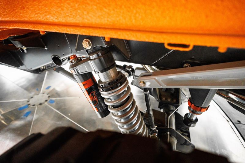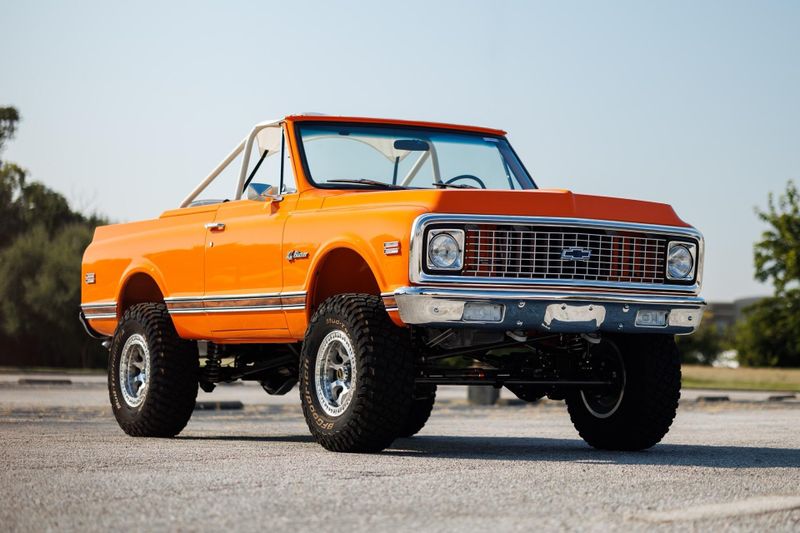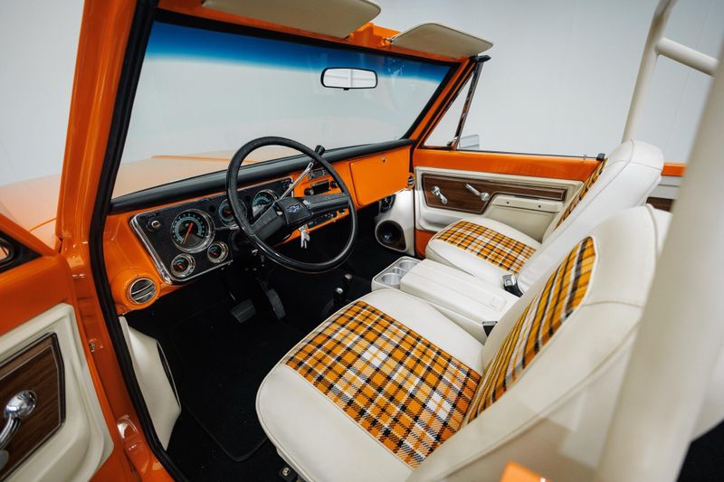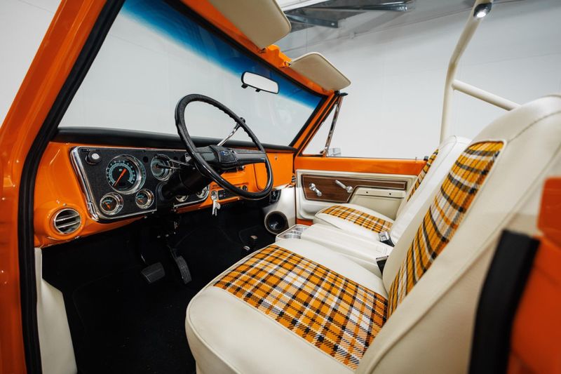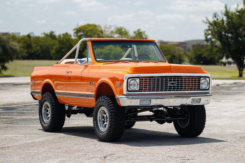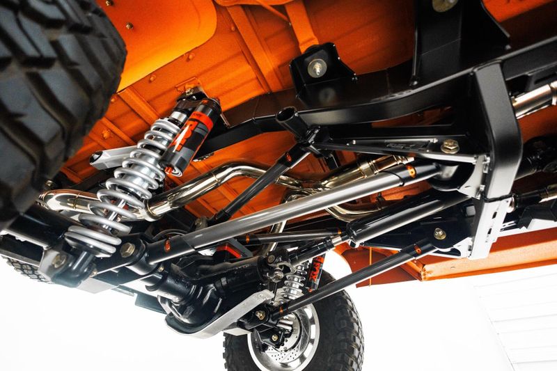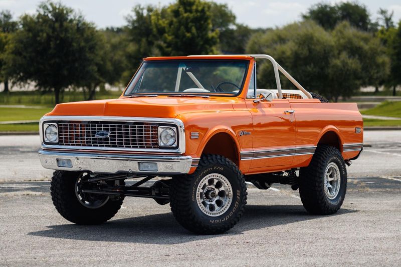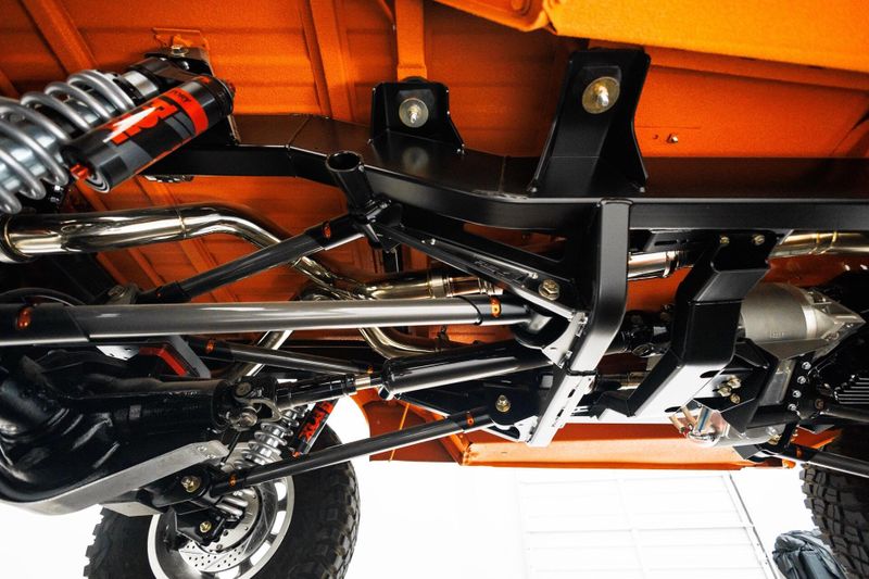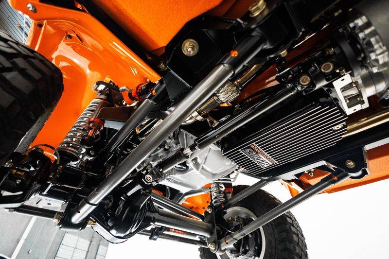 Nicknamed ''Renn'' and riding on a Roadster Shop RS4 chassis, this Hogan Built 1972 Chevrolet K5 Blazer is powered by a 525hp 6.2-liter LS3 engine backed by a Hughes 4L80 4-speed automatic transmission. Under the hood features an Avalanche-colored engine that has been upfitted with a Holley intake manifold, 14-inch air cleaner and vintage Chevrolet valve covers with hidden coil packs. Keeping the drivability a top priority, a CPP hydro-boost system was installed, along with a DeWitts radiator and a CVF front drive system. The Roadster Shop RS4 chassis features upgraded 13-inch Baer brakes, oversized sway bar links, triangulated front and rear 4-links, Currie high-pinion axles with 4.56 gears, 20-way adjustable Fox 2.0 coilovers, Fox hydraulic bump stops and a 24-way adjustable Fox steering stabilizer. Dispersing the power through the chassis is a twin-stick Atlas transfer case. A 3-inch fully polished stainless-steel exhaust has been fabricated and completely TIG-welded utilizing V-band clamps and four MagnaFlow mufflers. Before marrying the '72 K5 body to the chassis, the body was completely sandblasted, metalworked and bodyworked and shows the result of a concours-worthy refinish shining bright in Omaha Orange.