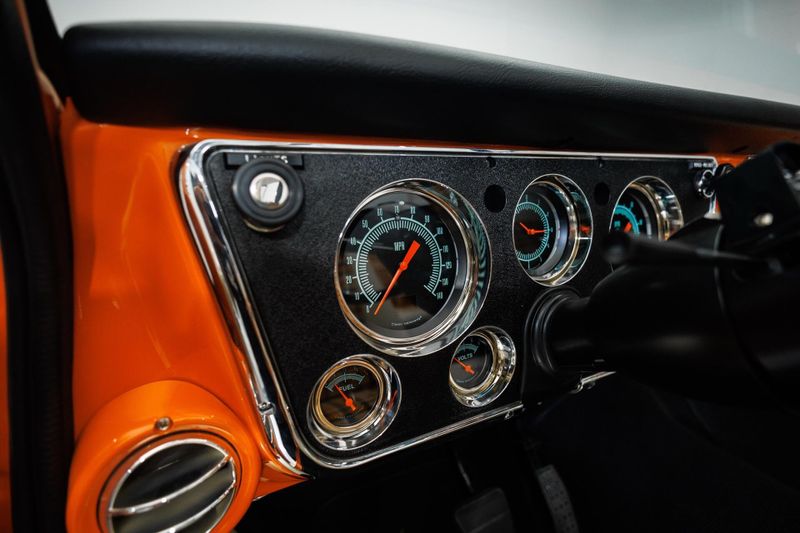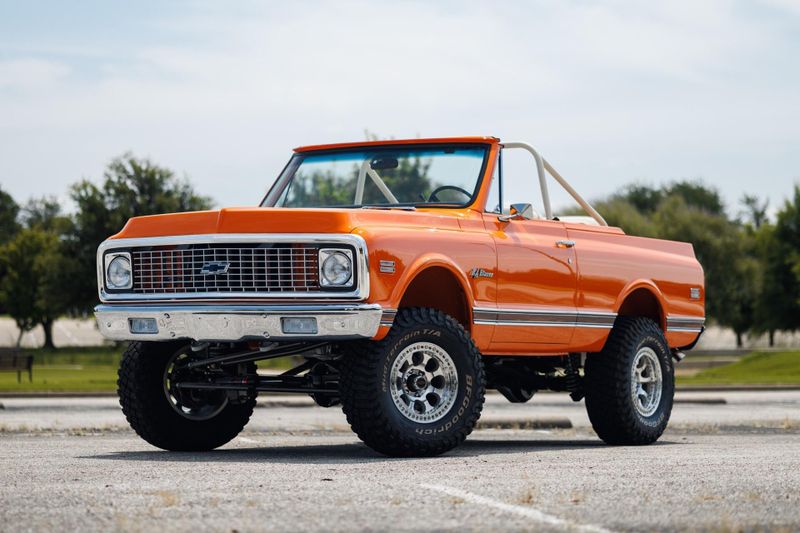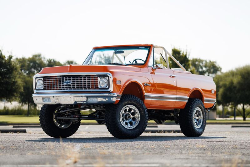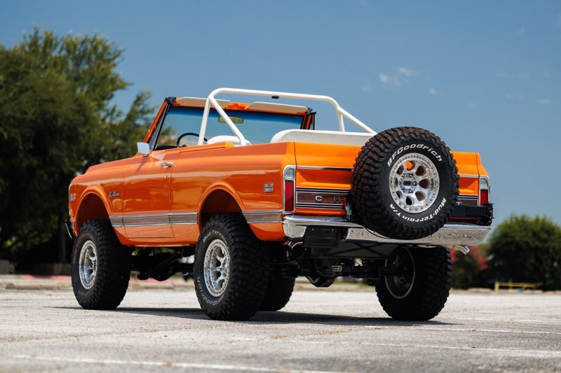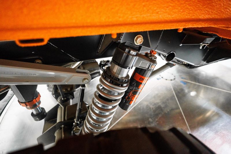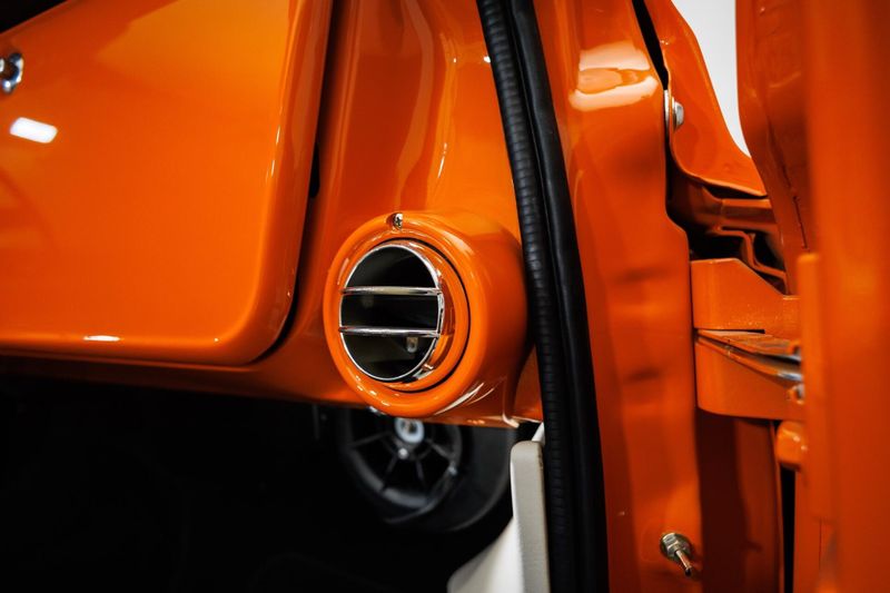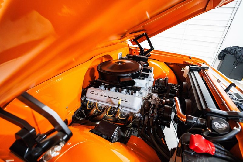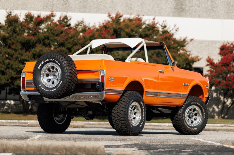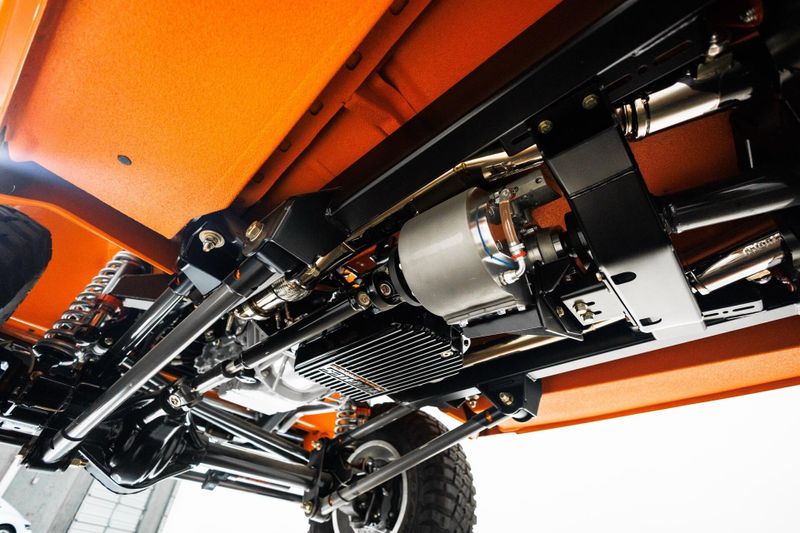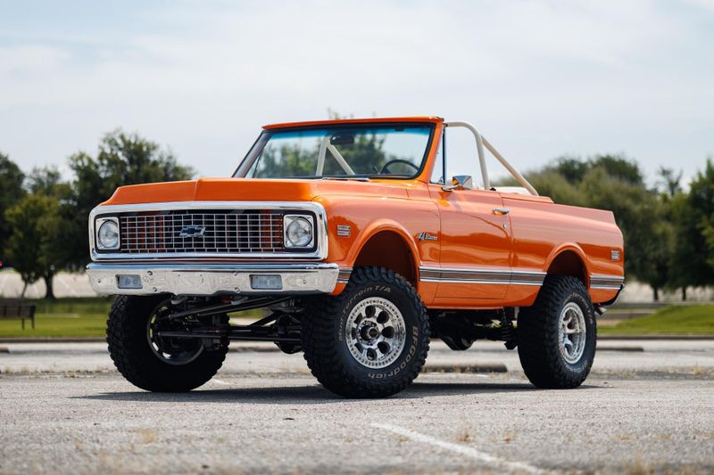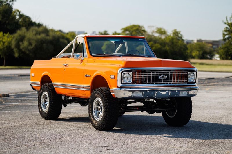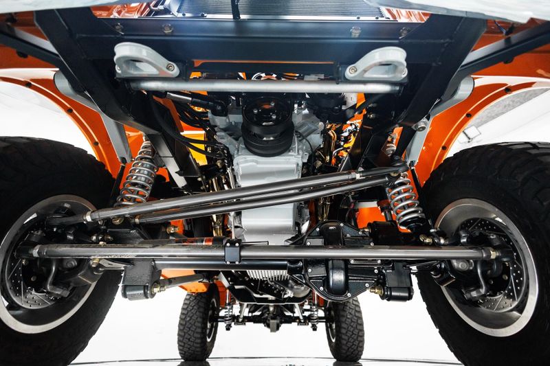 Nicknamed ''Renn'' and riding on a Roadster Shop RS4 chassis, this Hogan Built 1972 Chevrolet K5 Blazer is powered by a 525hp 6.2-liter LS3 engine backed by a Hughes 4L80 4-speed automatic transmission. Under the hood features an Avalanche-colored engine that has been upfitted with a Holley intake manifold, 14-inch air cleaner and vintage Chevrolet valve covers with hidden coil packs. Keeping the drivability a top priority, a CPP hydro-boost system was installed, along with a DeWitts radiator and a CVF front drive system. The Roadster Shop RS4 chassis features upgraded 13-inch Baer brakes, oversized sway bar links, triangulated front and rear 4-links, Currie high-pinion axles with 4.56 gears, 20-way adjustable Fox 2.0 coilovers, Fox hydraulic bump stops and a 24-way adjustable Fox steering stabilizer. Dispersing the power through the chassis is a twin-stick Atlas transfer case. A 3-inch fully polished stainless-steel exhaust has been fabricated and completely TIG-welded utilizing V-band clamps and four MagnaFlow mufflers. Before marrying the '72 K5 body to the chassis, the body was completely sandblasted, metalworked and bodyworked and shows the result of a concours-worthy refinish shining bright in Omaha Orange.