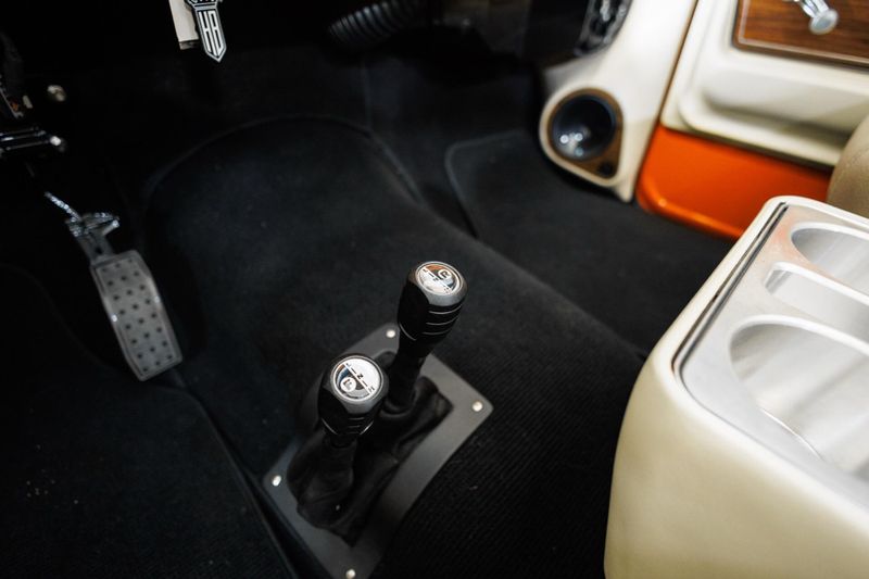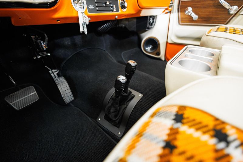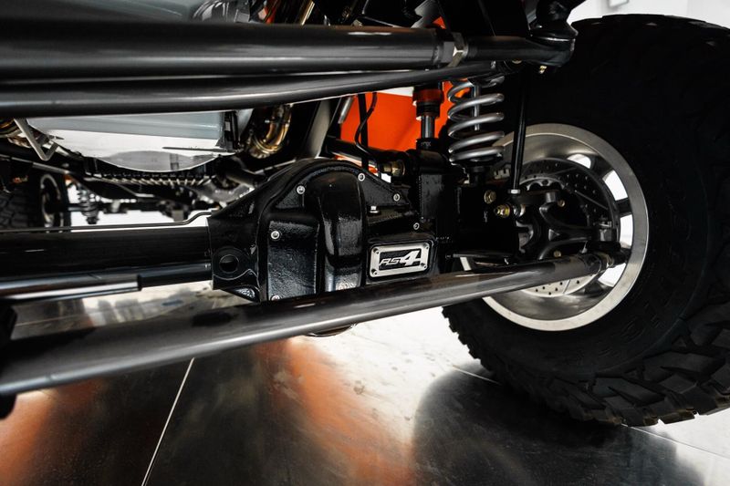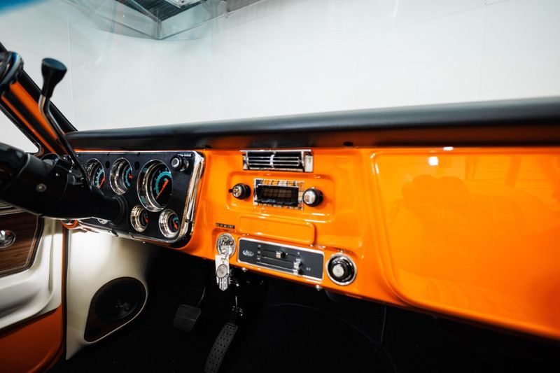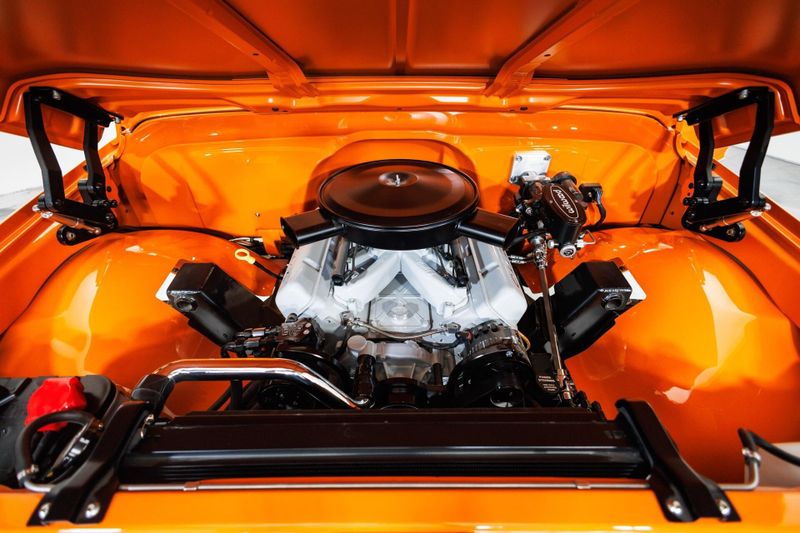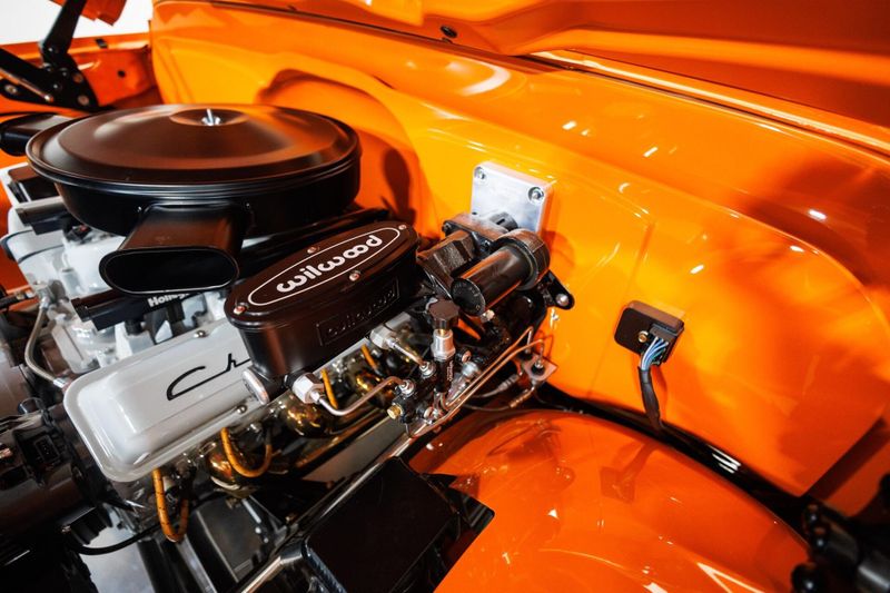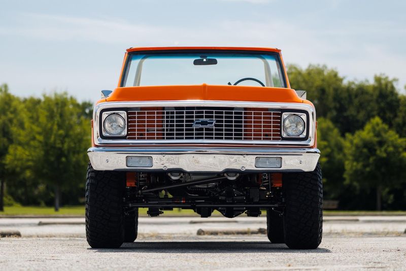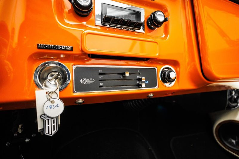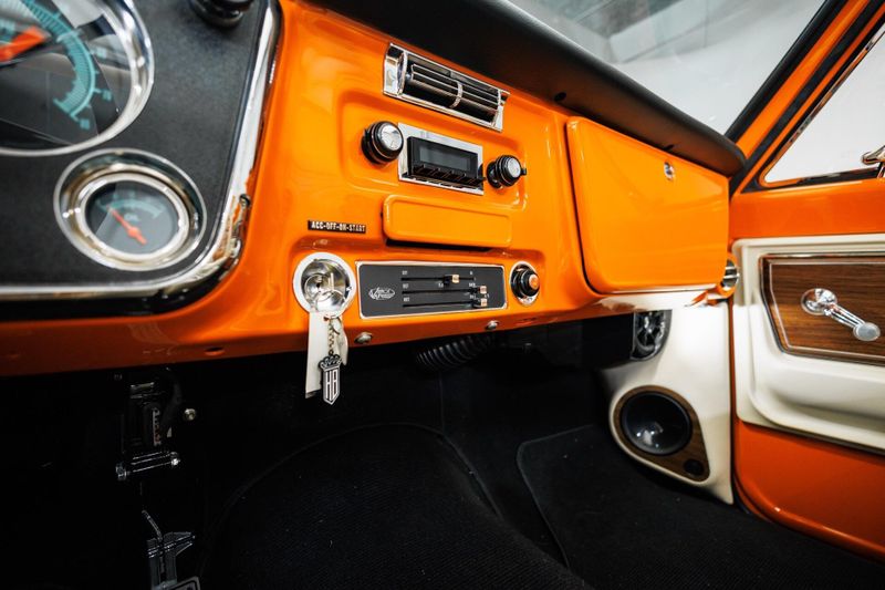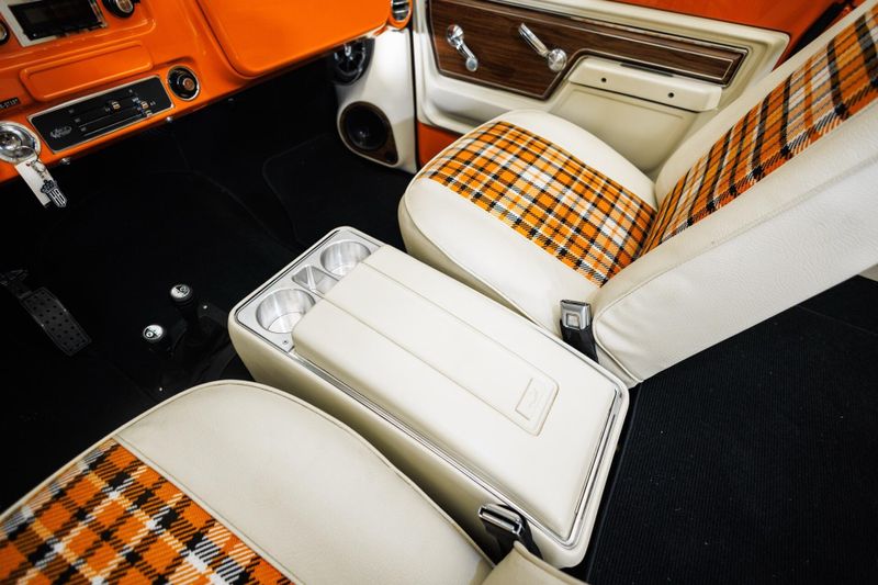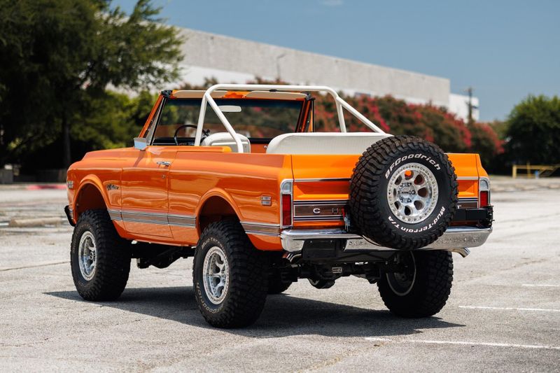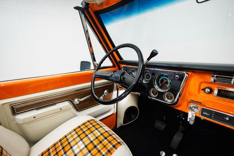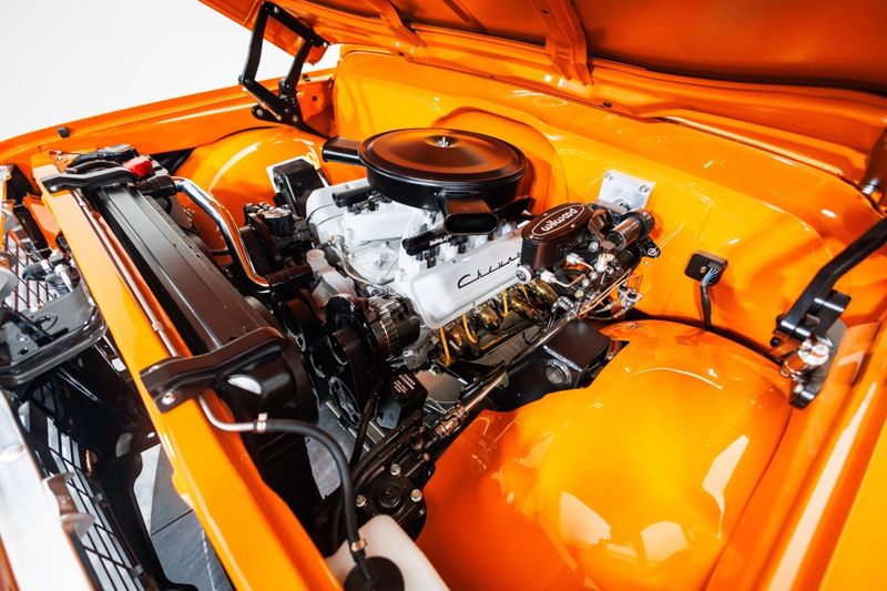 Nicknamed ''Renn'' and riding on a Roadster Shop RS4 chassis, this Hogan Built 1972 Chevrolet K5 Blazer is powered by a 525hp 6.2-liter LS3 engine backed by a Hughes 4L80 4-speed automatic transmission. Under the hood features an Avalanche-colored engine that has been upfitted with a Holley intake manifold, 14-inch air cleaner and vintage Chevrolet valve covers with hidden coil packs. Keeping the drivability a top priority, a CPP hydro-boost system was installed, along with a DeWitts radiator and a CVF front drive system. The Roadster Shop RS4 chassis features upgraded 13-inch Baer brakes, oversized sway bar links, triangulated front and rear 4-links, Currie high-pinion axles with 4.56 gears, 20-way adjustable Fox 2.0 coilovers, Fox hydraulic bump stops and a 24-way adjustable Fox steering stabilizer. Dispersing the power through the chassis is a twin-stick Atlas transfer case. A 3-inch fully polished stainless-steel exhaust has been fabricated and completely TIG-welded utilizing V-band clamps and four MagnaFlow mufflers. Before marrying the '72 K5 body to the chassis, the body was completely sandblasted, metalworked and bodyworked and shows the result of a concours-worthy refinish shining bright in Omaha Orange.