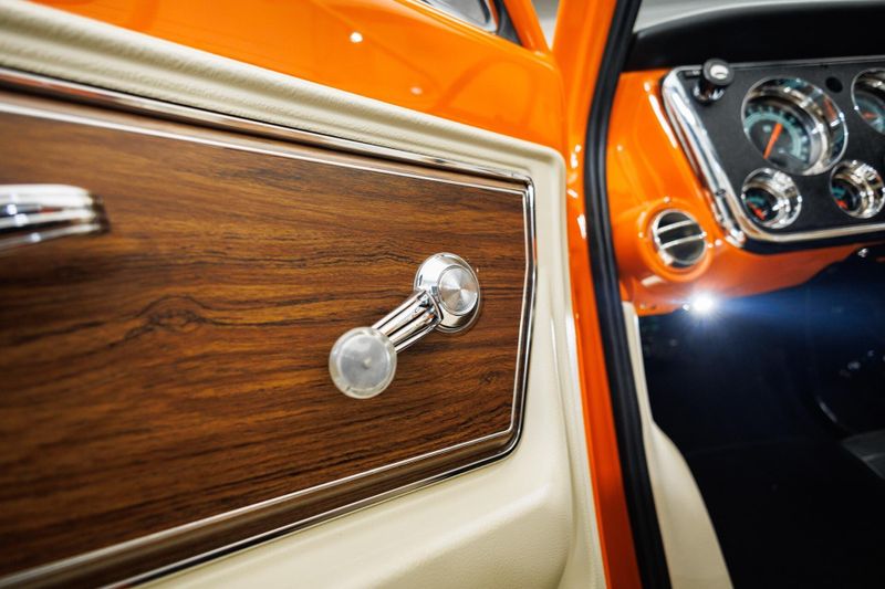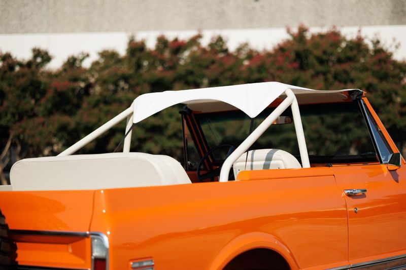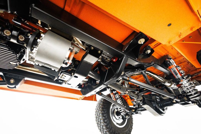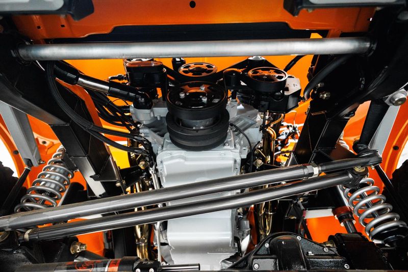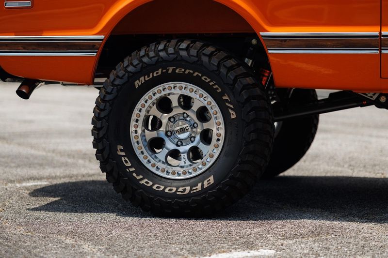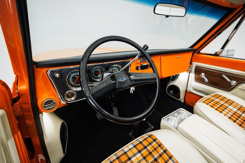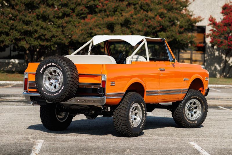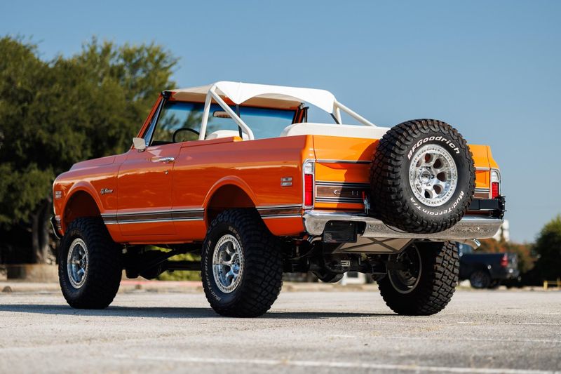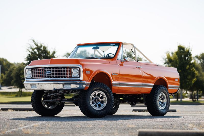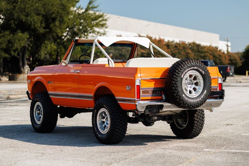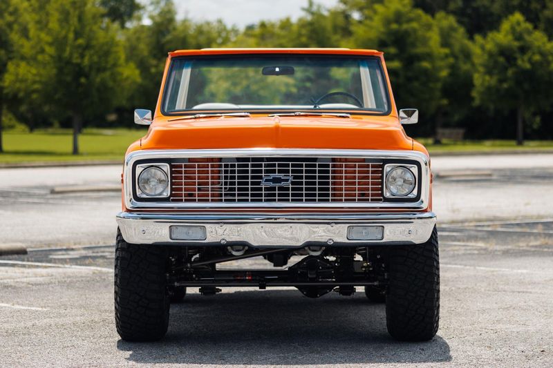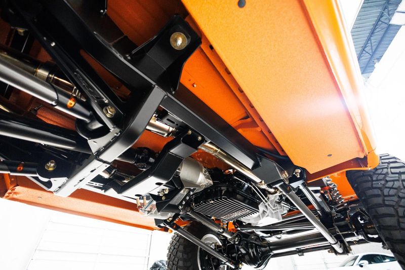 Nicknamed ''Renn'' and riding on a Roadster Shop RS4 chassis, this Hogan Built 1972 Chevrolet K5 Blazer is powered by a 525hp 6.2-liter LS3 engine backed by a Hughes 4L80 4-speed automatic transmission. Under the hood features an Avalanche-colored engine that has been upfitted with a Holley intake manifold, 14-inch air cleaner and vintage Chevrolet valve covers with hidden coil packs. Keeping the drivability a top priority, a CPP hydro-boost system was installed, along with a DeWitts radiator and a CVF front drive system. The Roadster Shop RS4 chassis features upgraded 13-inch Baer brakes, oversized sway bar links, triangulated front and rear 4-links, Currie high-pinion axles with 4.56 gears, 20-way adjustable Fox 2.0 coilovers, Fox hydraulic bump stops and a 24-way adjustable Fox steering stabilizer. Dispersing the power through the chassis is a twin-stick Atlas transfer case. A 3-inch fully polished stainless-steel exhaust has been fabricated and completely TIG-welded utilizing V-band clamps and four MagnaFlow mufflers. Before marrying the '72 K5 body to the chassis, the body was completely sandblasted, metalworked and bodyworked and shows the result of a concours-worthy refinish shining bright in Omaha Orange.