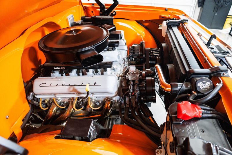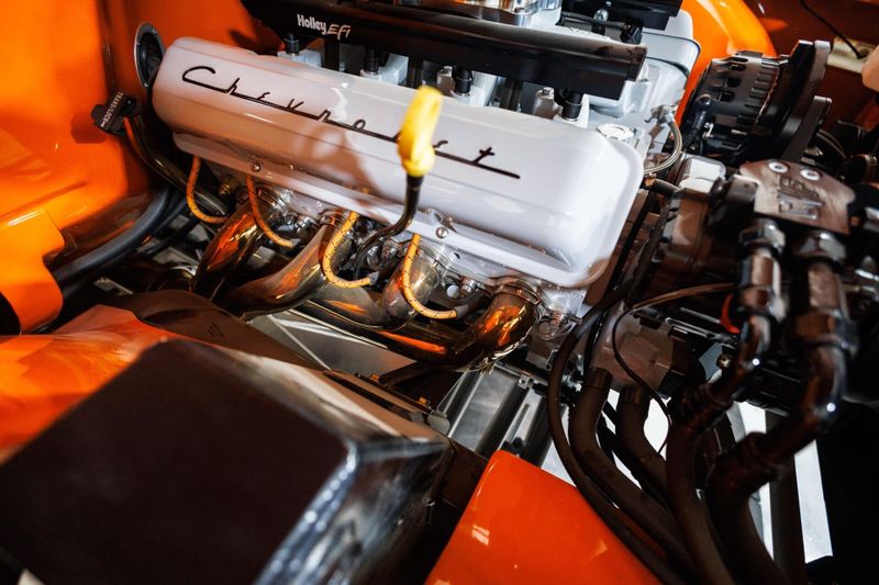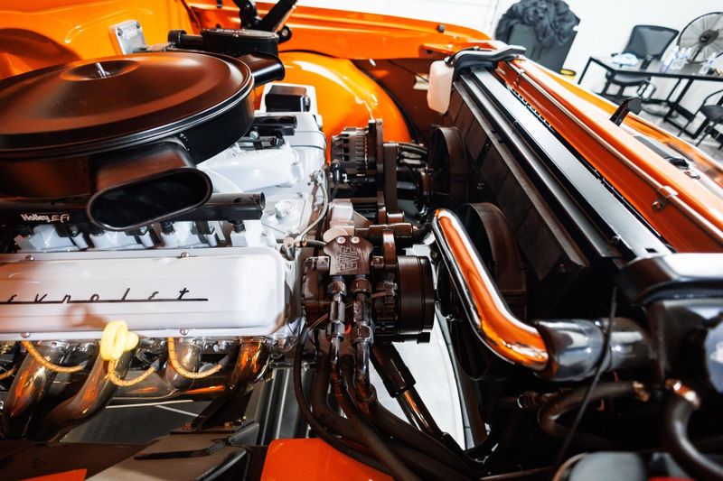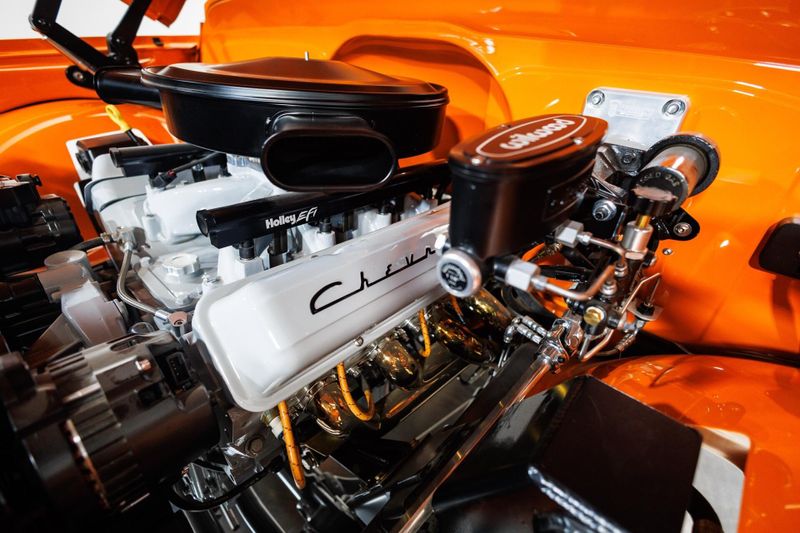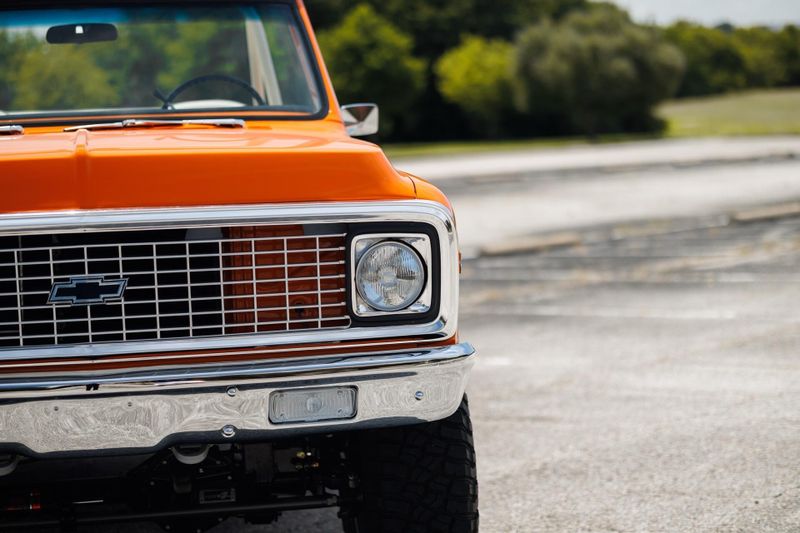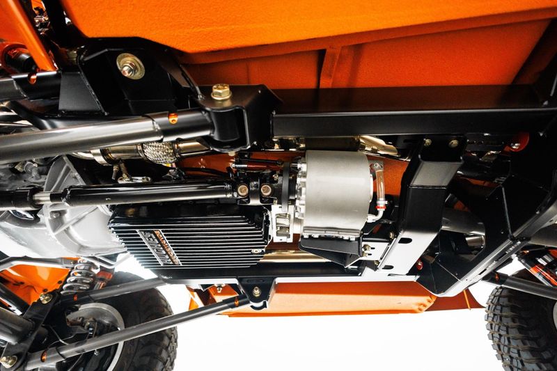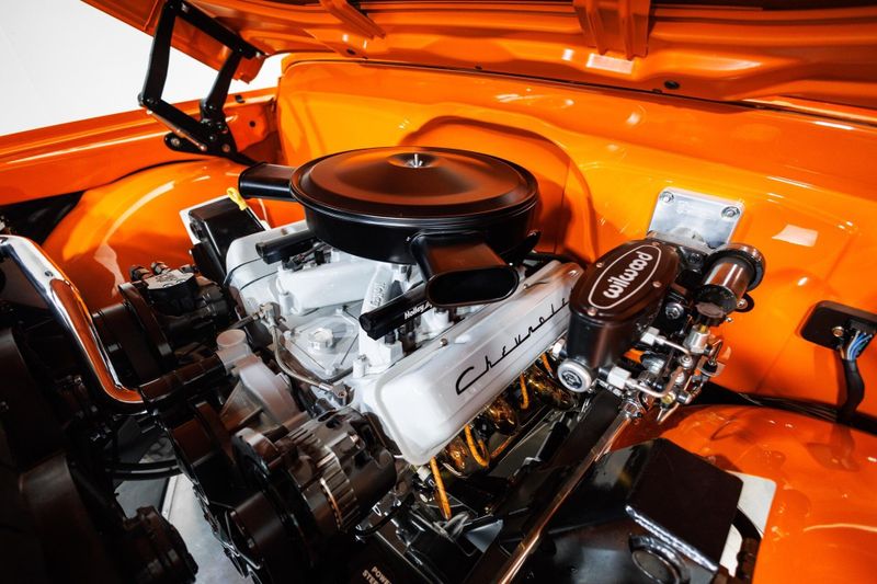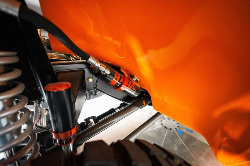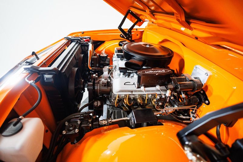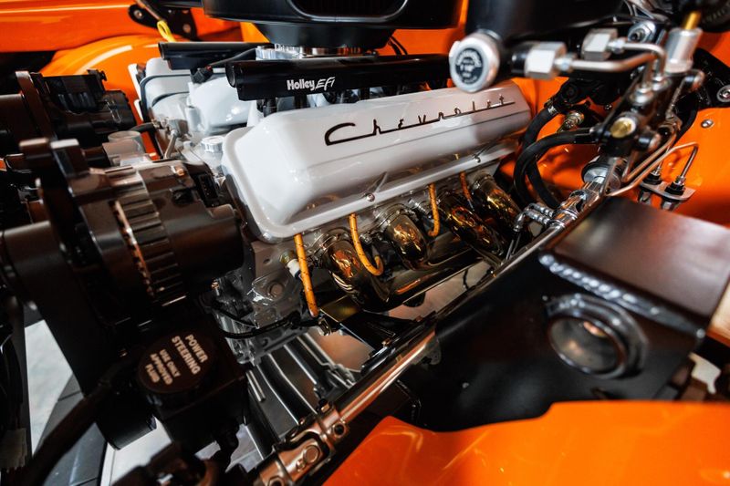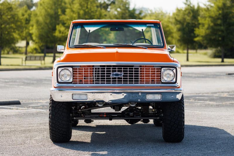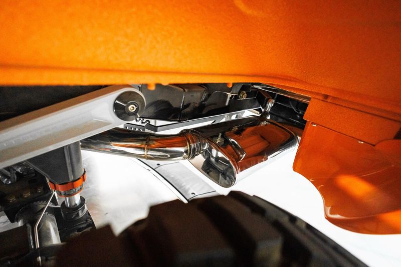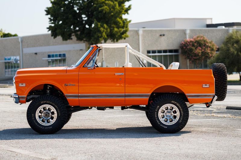 Nicknamed ''Renn'' and riding on a Roadster Shop RS4 chassis, this Hogan Built 1972 Chevrolet K5 Blazer is powered by a 525hp 6.2-liter LS3 engine backed by a Hughes 4L80 4-speed automatic transmission. Under the hood features an Avalanche-colored engine that has been upfitted with a Holley intake manifold, 14-inch air cleaner and vintage Chevrolet valve covers with hidden coil packs. Keeping the drivability a top priority, a CPP hydro-boost system was installed, along with a DeWitts radiator and a CVF front drive system. The Roadster Shop RS4 chassis features upgraded 13-inch Baer brakes, oversized sway bar links, triangulated front and rear 4-links, Currie high-pinion axles with 4.56 gears, 20-way adjustable Fox 2.0 coilovers, Fox hydraulic bump stops and a 24-way adjustable Fox steering stabilizer. Dispersing the power through the chassis is a twin-stick Atlas transfer case. A 3-inch fully polished stainless-steel exhaust has been fabricated and completely TIG-welded utilizing V-band clamps and four MagnaFlow mufflers. Before marrying the '72 K5 body to the chassis, the body was completely sandblasted, metalworked and bodyworked and shows the result of a concours-worthy refinish shining bright in Omaha Orange.