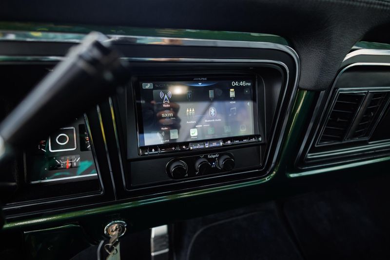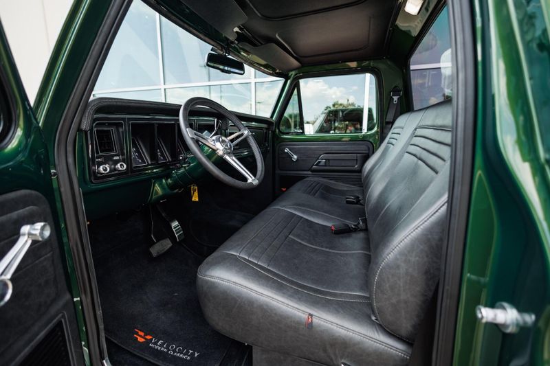 Inside, this classic Ford truck all about refined craftsmanship. Upgraded hand-stitched, distressed leather covers the seats, delivering vintage luxury, while the leather-wrapped steering wheel feels upscale and sporty to match the trucks persona. A double-DIN infotainment system, with Apple CarPlay and Focal speakers, provides modern connectivity, while a Velocity-exclusive backup camera seamlessly integrates into the billet tailgate handle for maximum style and safety.