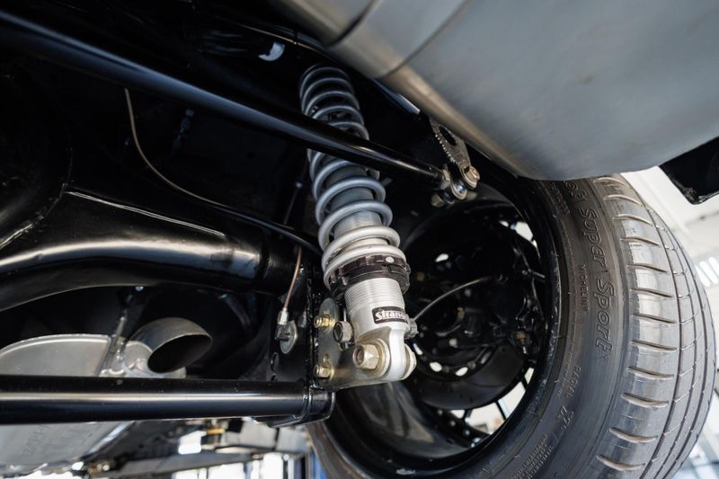 Tubular front suspension with quick ratio steering box 4-wheel 14 inch Wilwood brakes with Wilwood master cylinder. Rick Tanks stainless gas tank with custom side entry fuel filler.