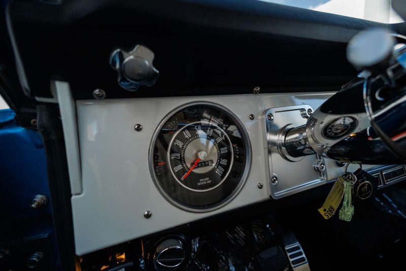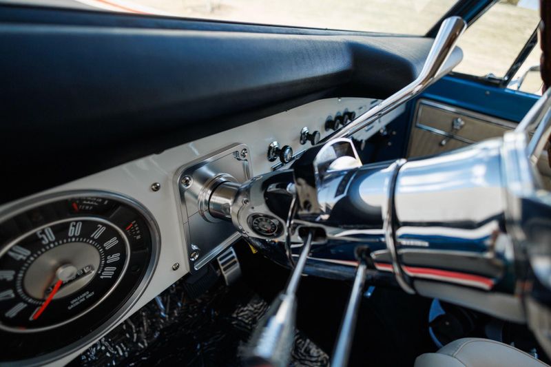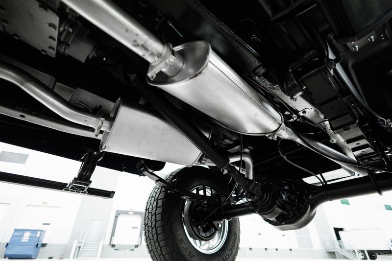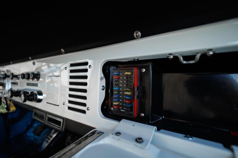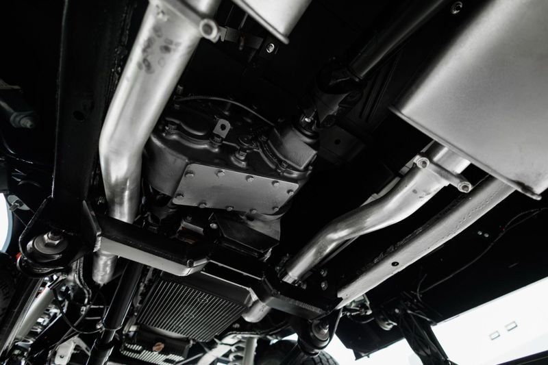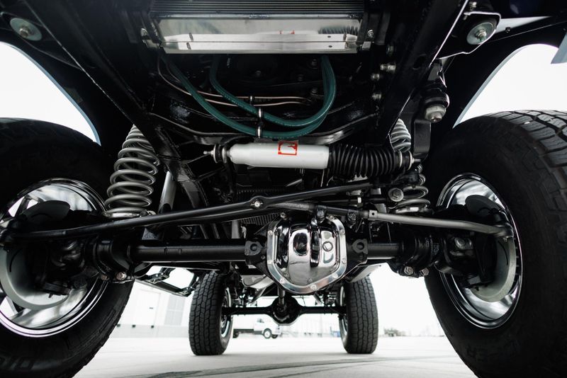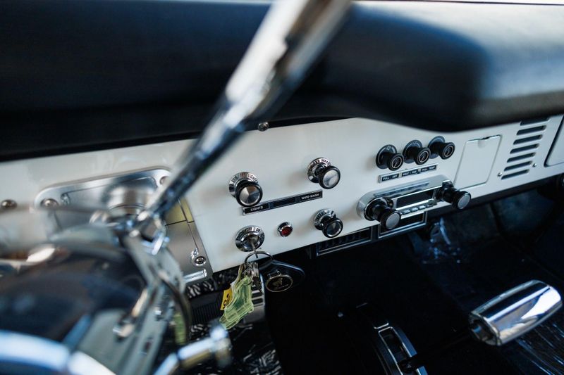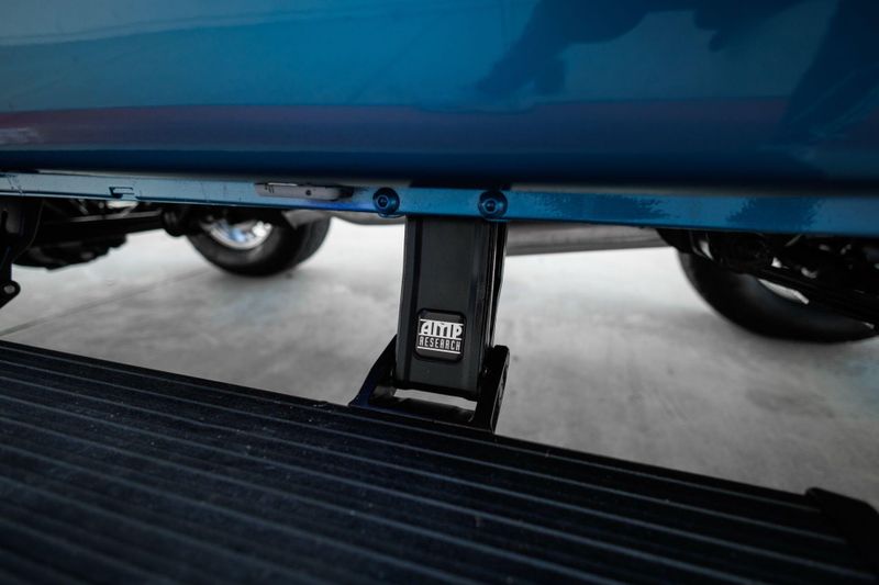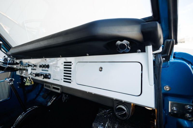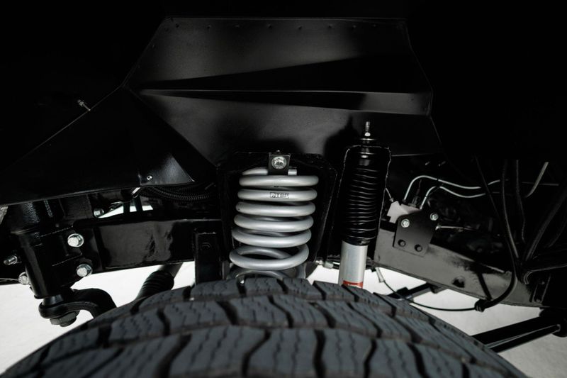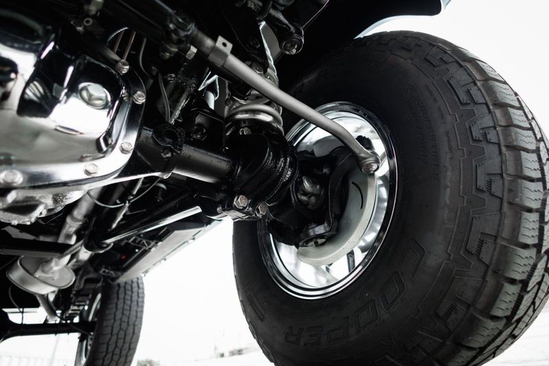 Borgeson power steering and power front disc brakes team up with a 3.5'' suspension lift and Tom's Offroad locking hubs for maximum 4-wheel drive capability. AMP Research power steps with LED lighting and carbon fiber door sill accents encourage climbing into the cabin.