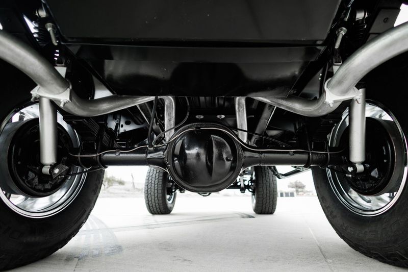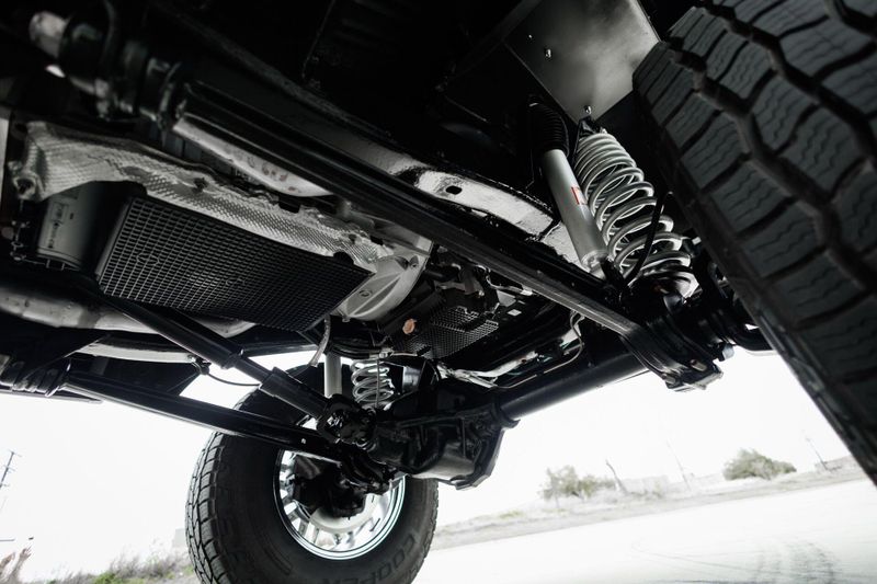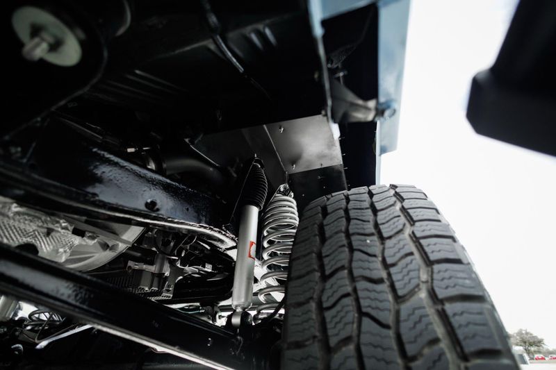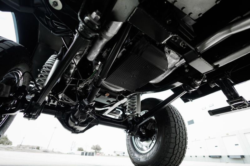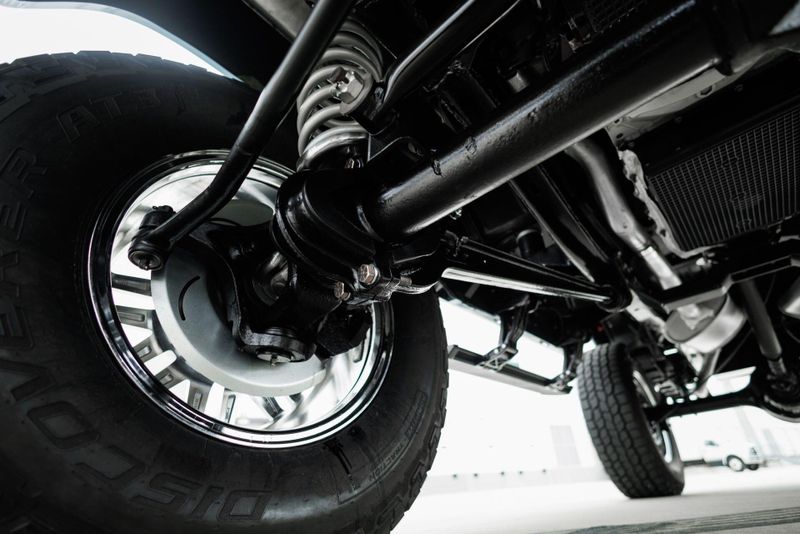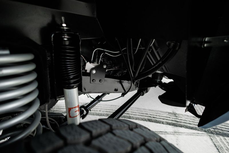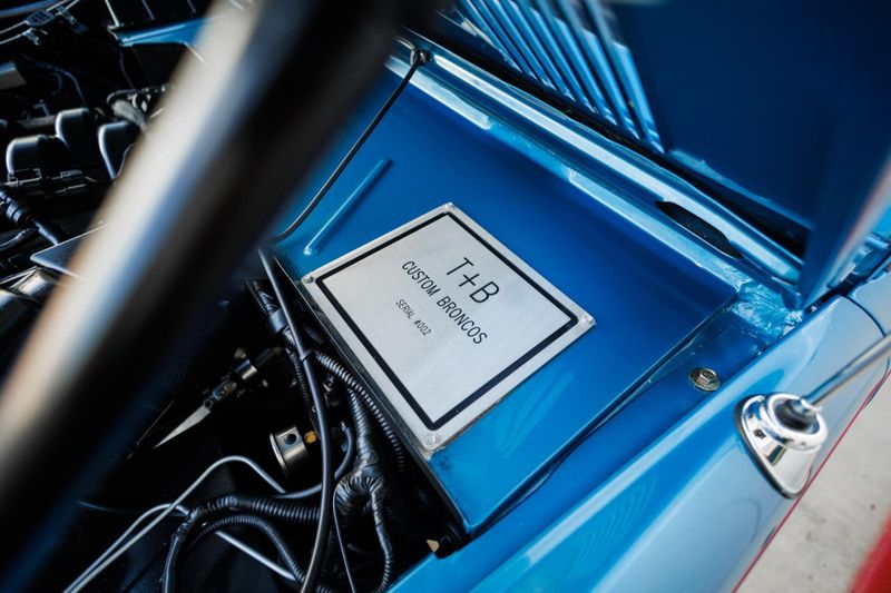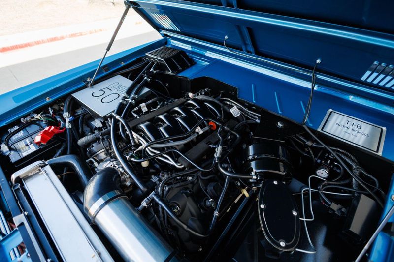 T+B Custom Bronco serial number 002 is powered by a 5.0L Gen 3 Coyote V-8 Engine with a cold air intake and ceramic-coated exhaust headers. The quad cam monster pulls fuel from a 23 gallon EFI gas tank and pushes power through a Ford 10R80 10-Speed automatic transmission and custom built driveshafts.