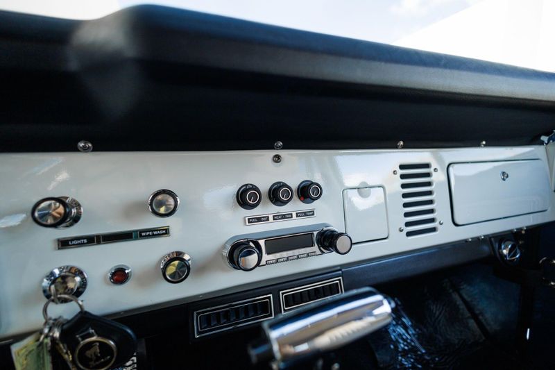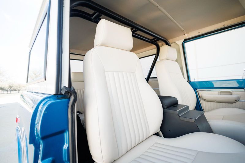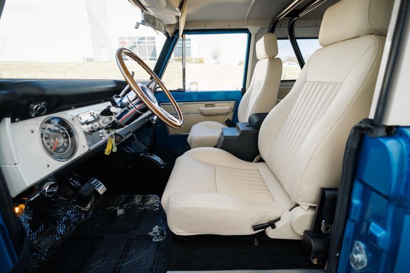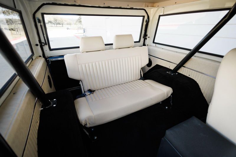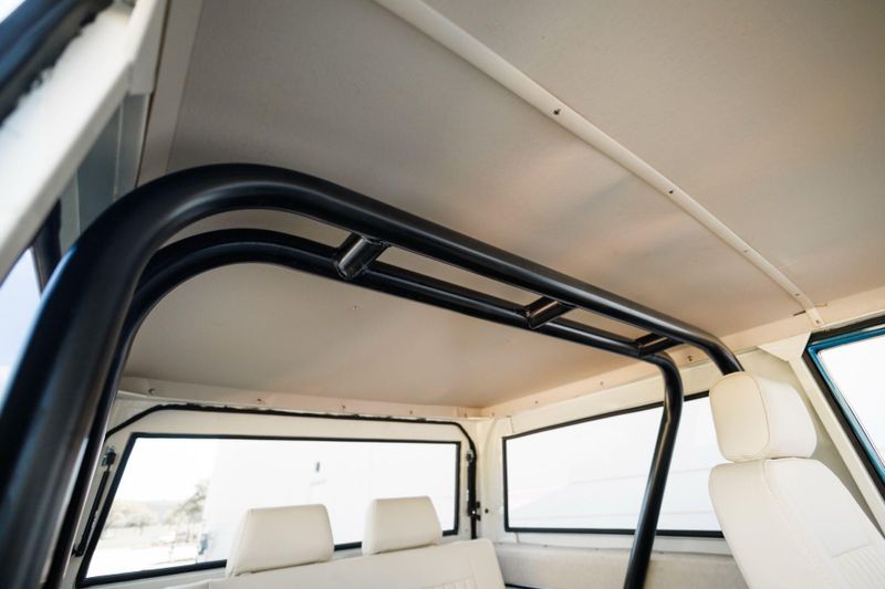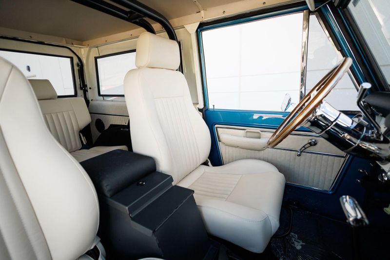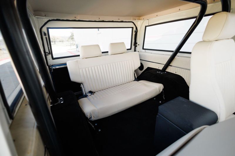 Tom's Offroad custom Bronco bucket seats with rear fold down seat offer premium comfort with classic style. Air conditioning and a RetroSound radio with Bluetooth connectivity deliver 4-season comfort and entertainment. A locking center console and custom-built roll bar augment security and safety.