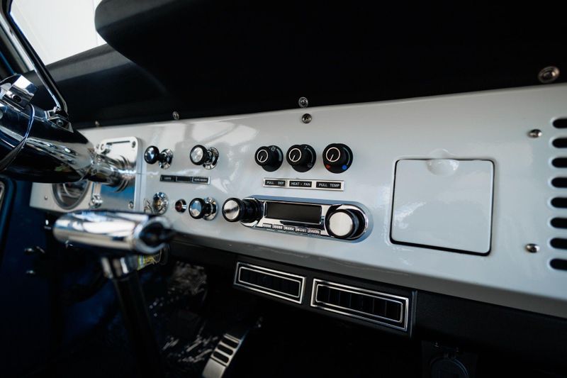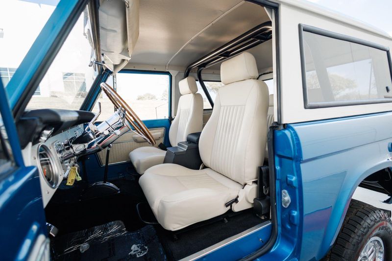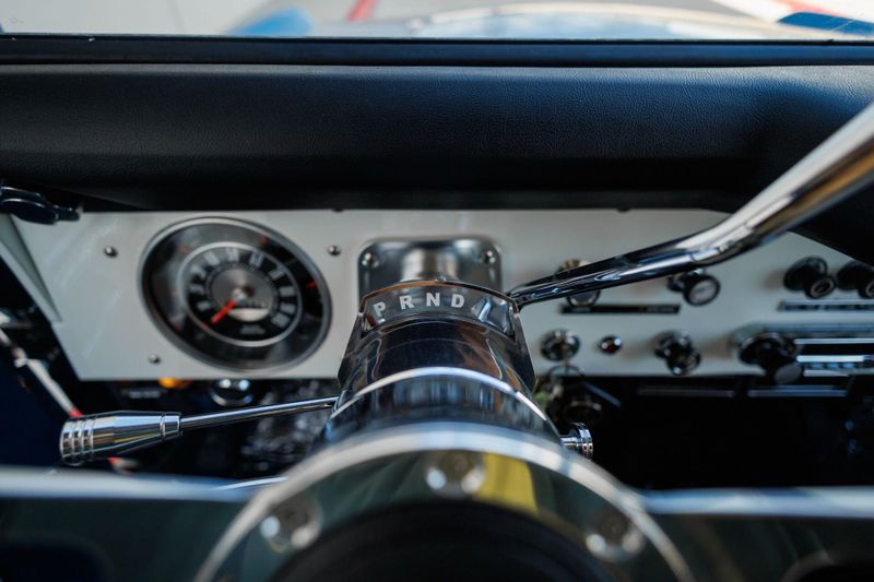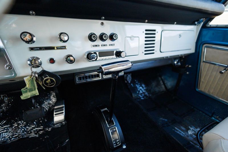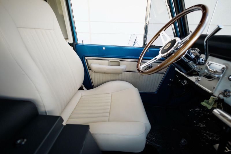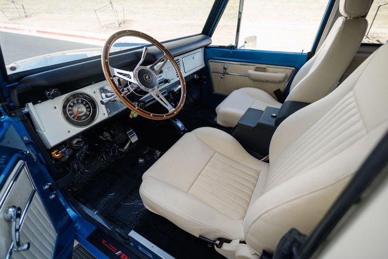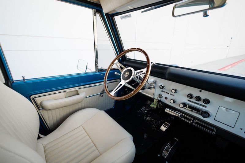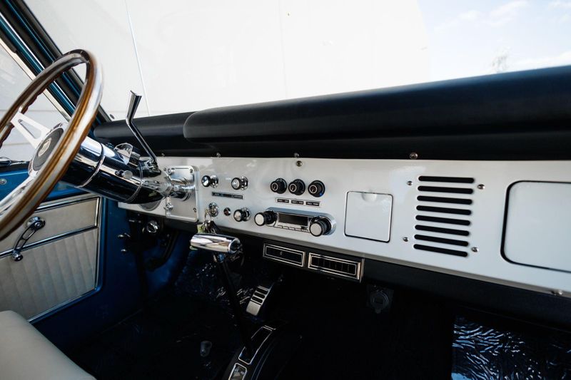 Tom's Offroad custom Bronco bucket seats with rear fold down seat offer premium comfort with classic style. Air conditioning and a RetroSound radio with Bluetooth connectivity deliver 4-season comfort and entertainment. A locking center console and custom-built roll bar augment security and safety.