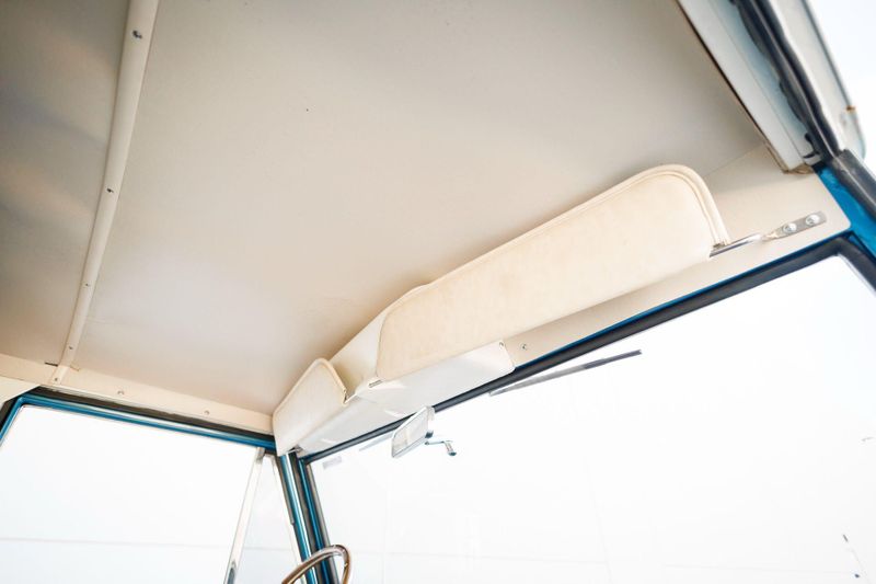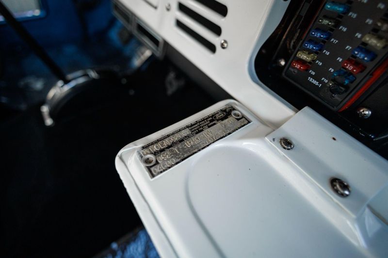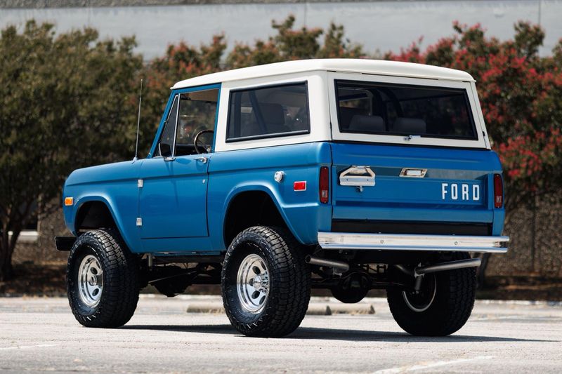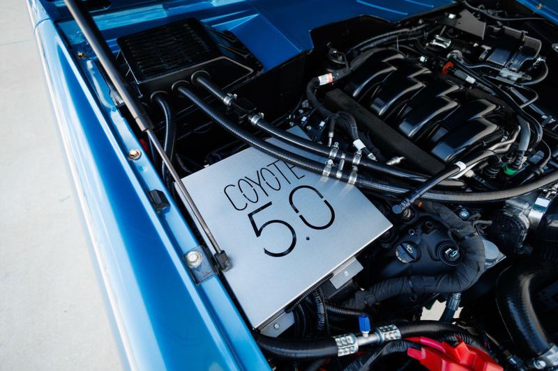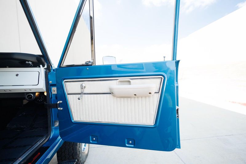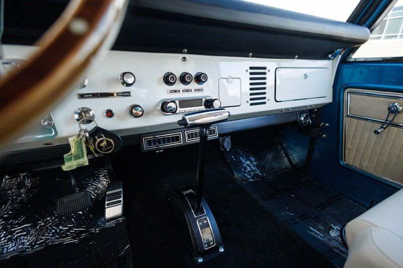 The new removable hardtop and tinted glass complement the custom iridescent blue metallic exterior wrap with LED headlights in a custom Bronco-script grille, new chrome bumpers and Coyote fender badging to finish out the melding of the past and present.