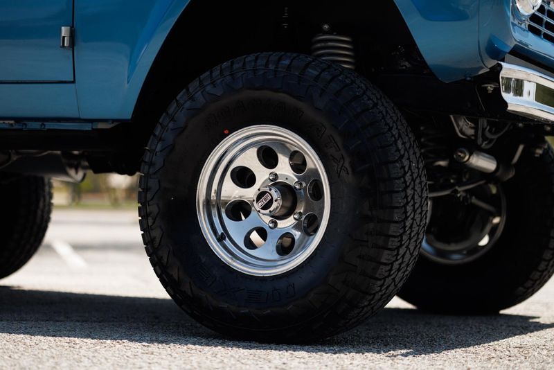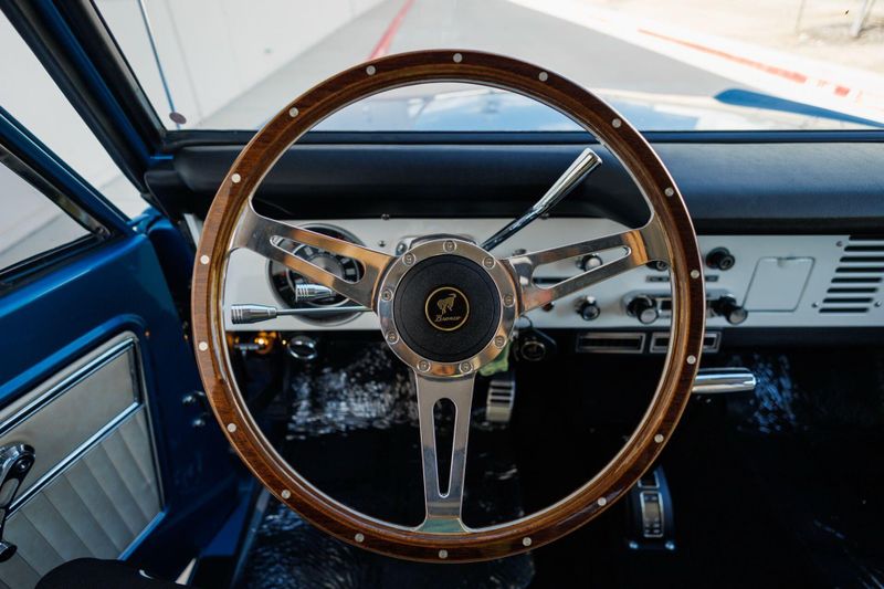 The bespoke Bronco waits for its next driver to adjust the wood-rimmed steering wheel on a polished tilt column and engage full Coyote power on polished Raceline wheels and Cooper Discoverer AT3 285/70R17 tires.