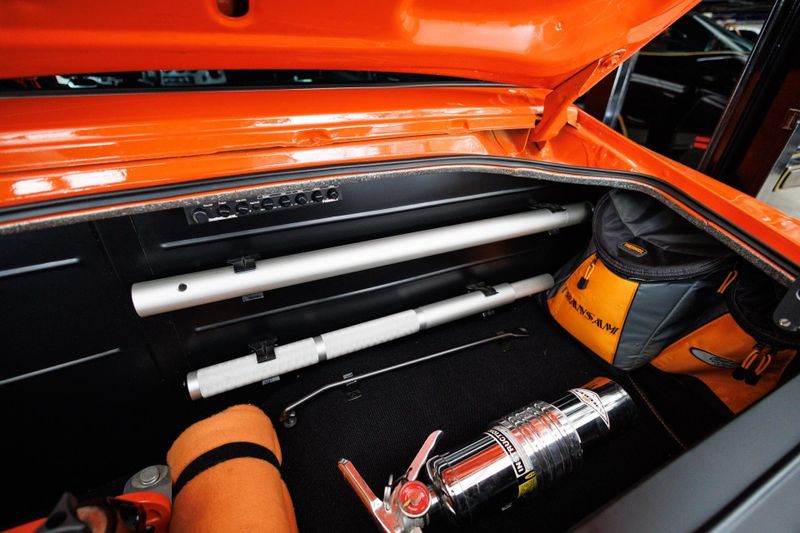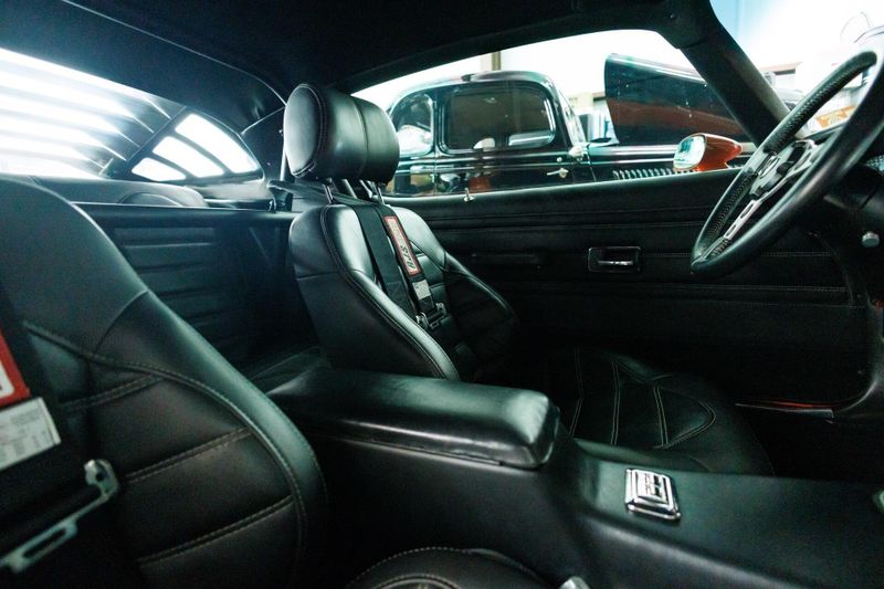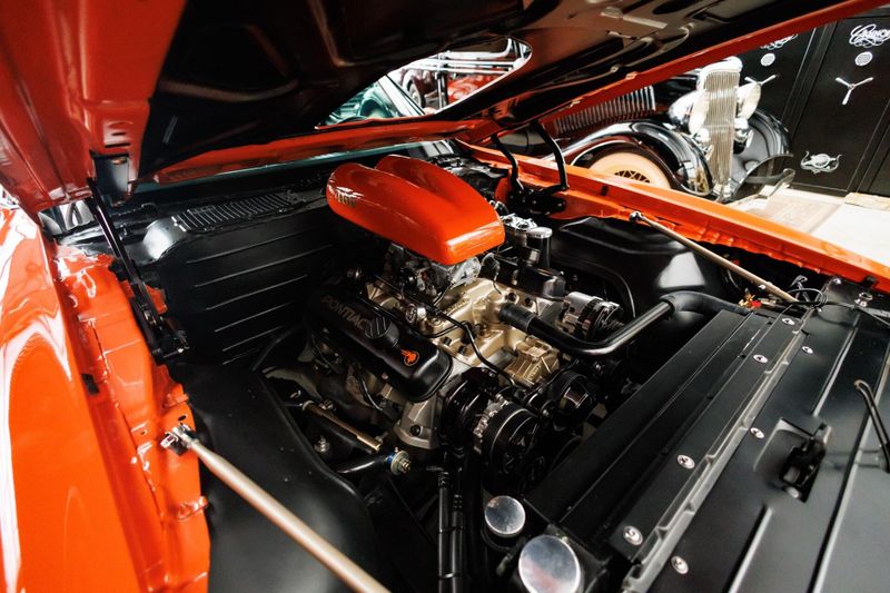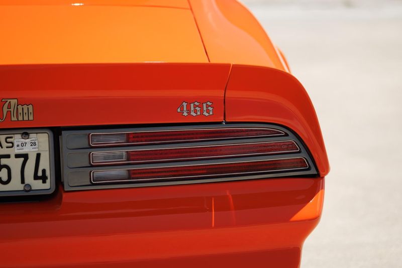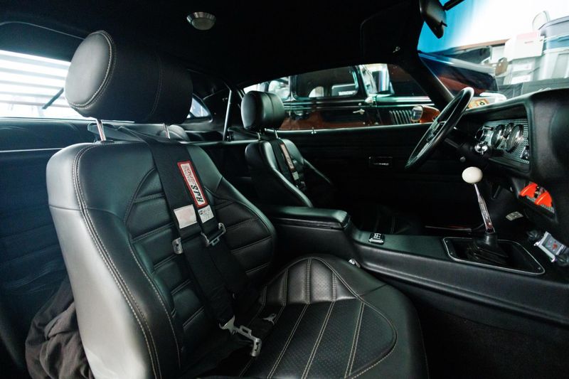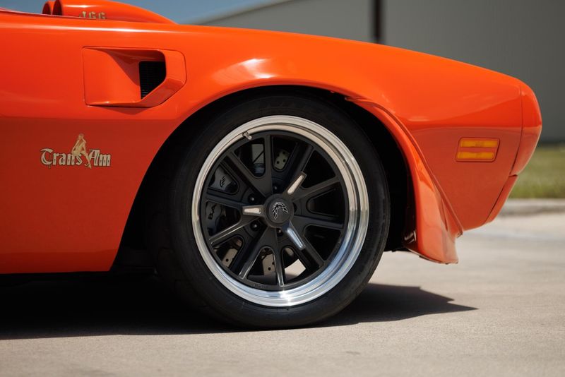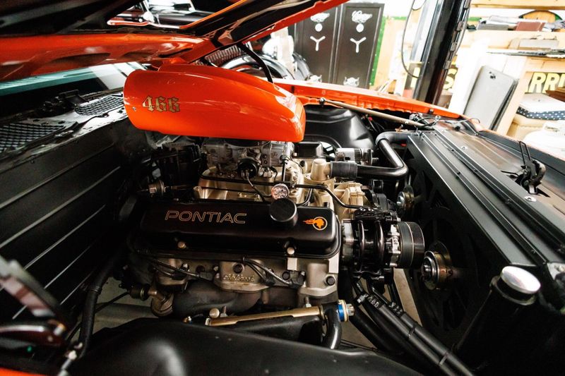 This 1976 Pro-Touring Pontiac Trans-Am is powered by a 500hp Pontiac 466 CI engine mated to a Tremec five-speed transmission. Hotchkis lowering springs, Hotchkis tubular links, Global West Control Arms, and QA1 adjustable shocks with stopping power provided by six-piston Baer brakes. This TA rides on 18-inch American Racing Cobra wheels wrapped in R-compound Nitto rubber. The spindles have been moved inward 2 inches for increased brake caliper clearance. Brake cooling ducts now reside where the front parking lights used to be. Underhood, a custom linkage connects the carb's primaries to the hoodscoop's butterfly blades to ensure that both open and close in harmony. Inside, buck hide leather covers the custom bucket seats, headliner, and door panels. Additional cockpit components consist of a rollbar, Classic Instrument Gauges, Billet Aluminum Floor Plates, Billet Aluminum Pedals and a custom 9 speaker stereo system.