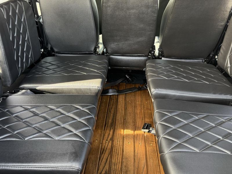 Custom front seat covers in tan finish. Seat bases removable to access battery