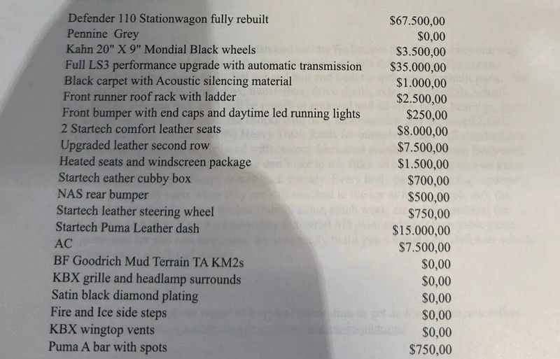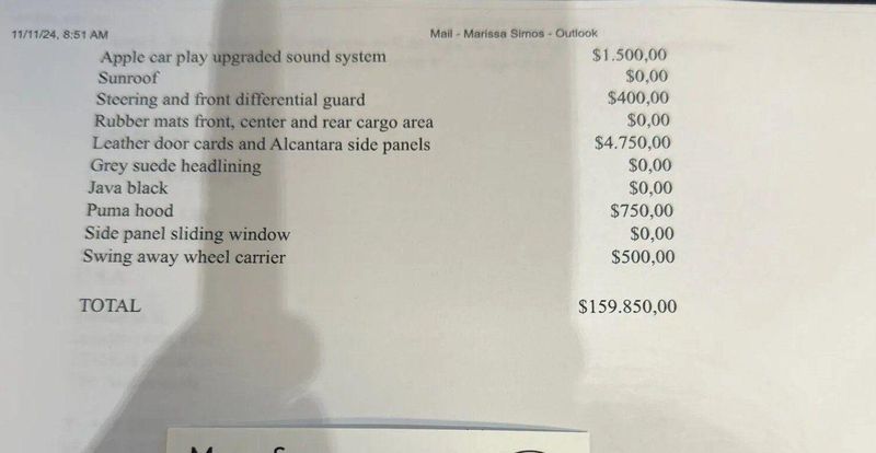 Steering & Front Differential Guard, Leather Door Cards & Alcantara Side Panels, Grey Suede Headliner, Puma Hood, Side Panel Sliding Window, Swing Away Wheel Carrier, Rubber Mats Front, Center and Rear Cargo Area