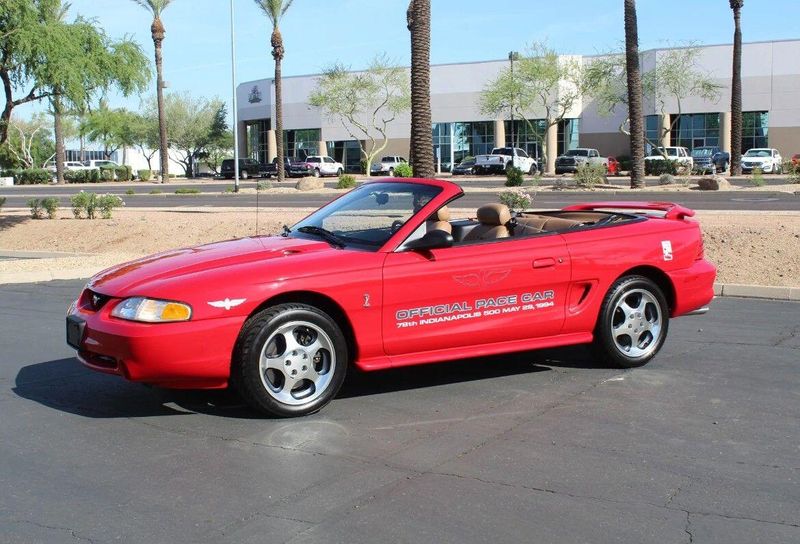 Earth MotorCars is Proud to offer this amazing: 1994 Ford Mustang SVT Cobra Indianapolis 500 Pace Car 23-Miles! CLEAN AUTOCHECK REPORT, Car #61 Out Of 1000 Built, GT suspension pkg-inc: Quadra-Shock rear suspension w/strut tower brace, variable-rate coil springs, Power retractable convertible top with semi-hard boot, Leather-wrapped steering wheel, 150 MPH speedometer, Traction-Lok axle, 2.73 rear axle ratio, Borg-Warner T5 5-speed manual transmission, Parnelli Jones was the Pace Car Driver for the 1994 Indy 500, Special 17x8-inch cast-aluminum 5-spoke wheels with 255/45ZR17 Goodyear tires, Modified MacPherson strut front and 4-link rear suspension with 4-wheel power disc brakes (13-inch front rotors), 5.0L V8 SMPI 16V, 4-Wheel Disc Brakes, ABS brakes, Air Conditioning, Alloy wheels, AM/FM radio, Cassette, Dual front impact airbags, Front Bucket Seats, Front Floor Mats, Front fog lights, Group 3, Leather steering wheel, Pace Car Replica Package, Power door mirrors, Power driver seat, Power steering, Power windows, Preferred Equipment Package 250A, Rear Window Defroster, Speed Control, Spoiler, Tachometer, Tilt steering wheel, Variably intermittent wipers, Voltmeter.