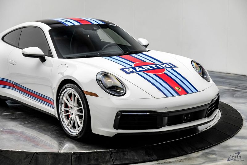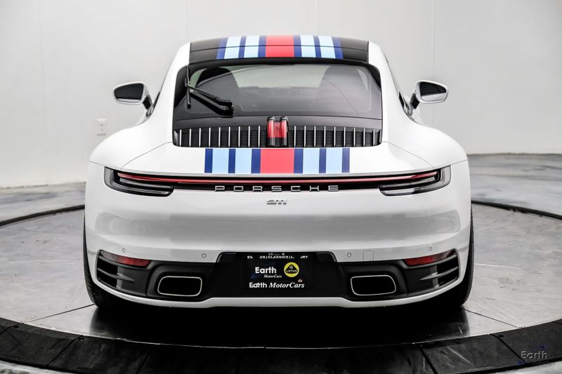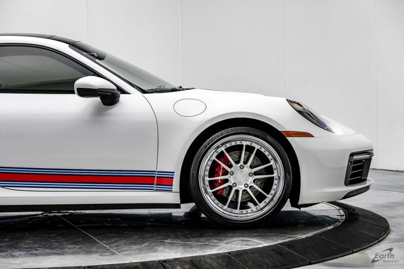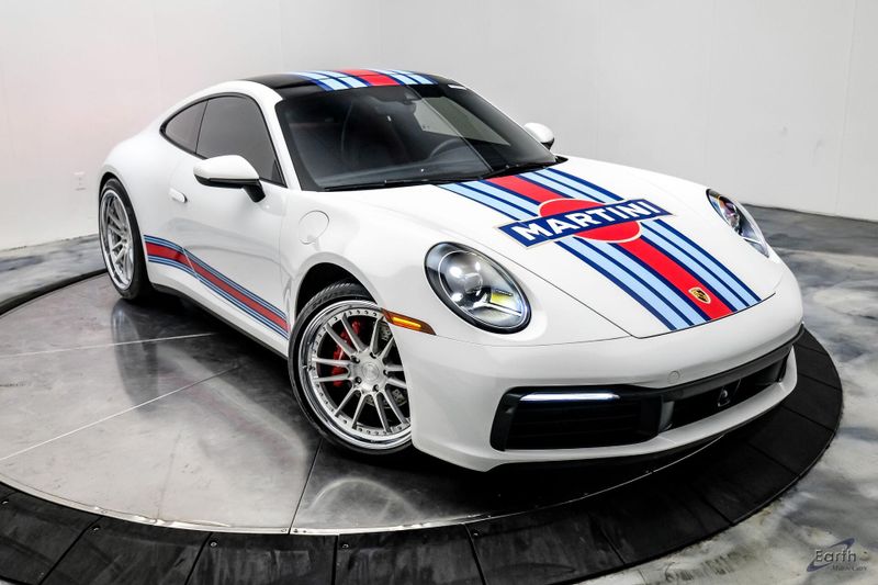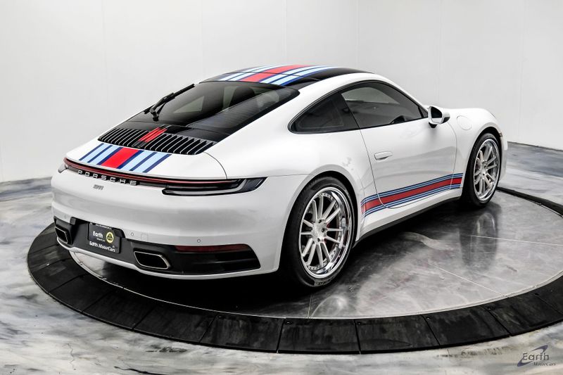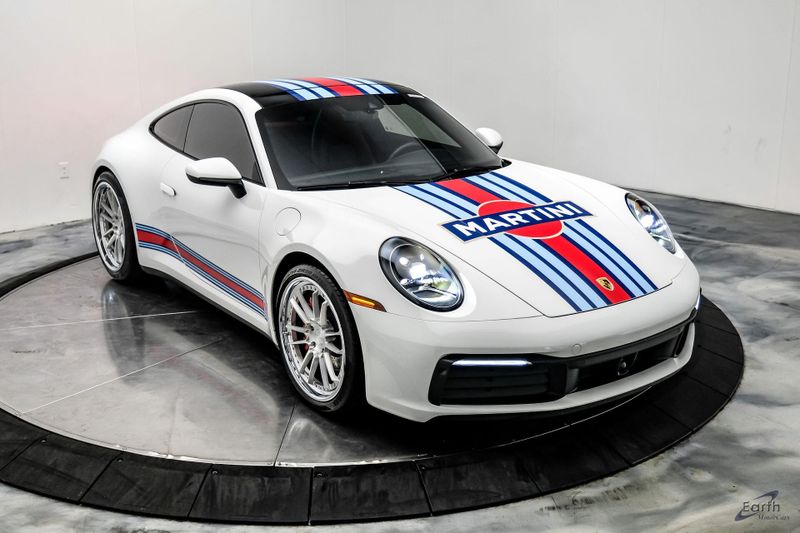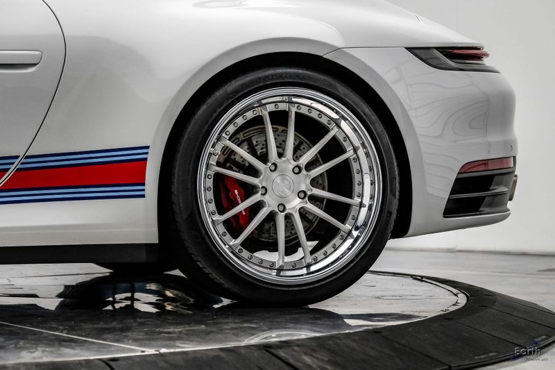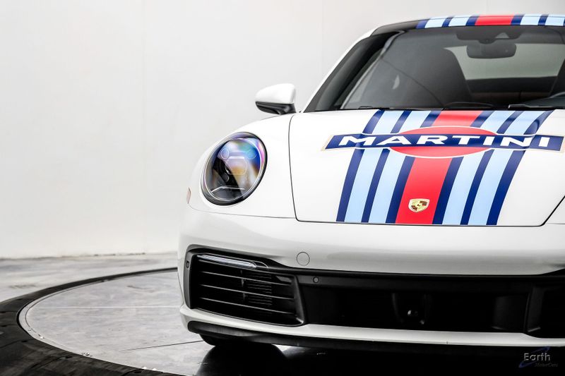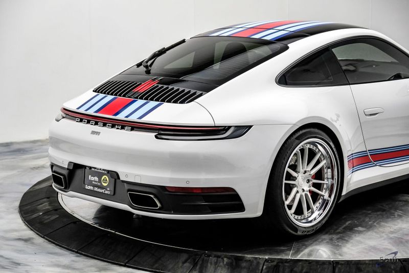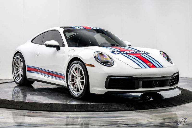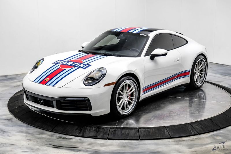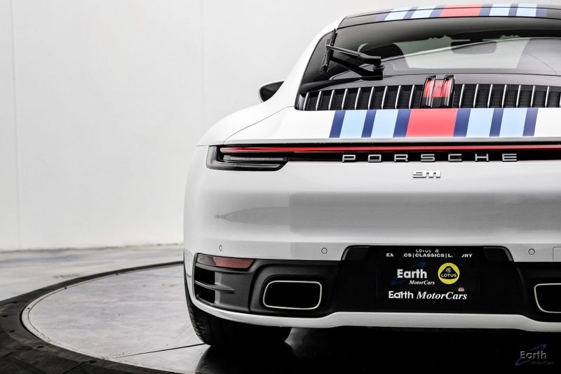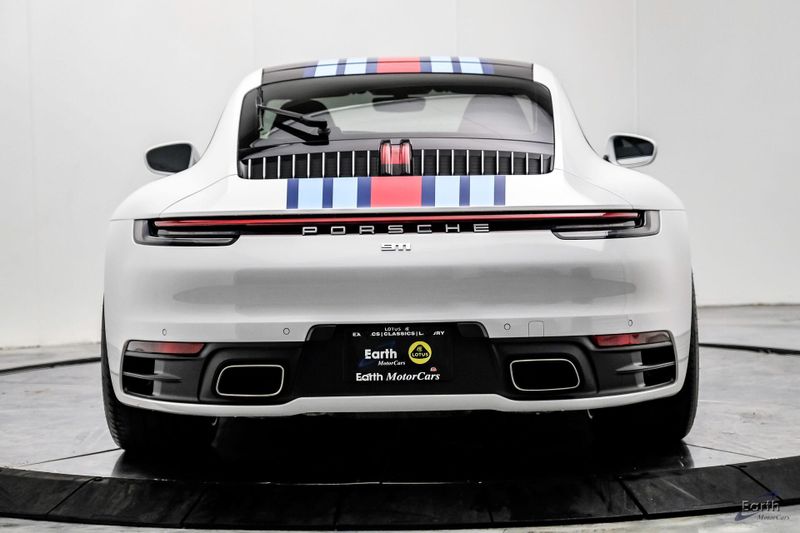 Earth MotorCars is Proud to offer this amazing: 2020 Porsche 911 Carrera Martini Package Custom Wheels, 4-Wheel Disc Brakes, 8 Speakers, 911 Logo in High Gloss Black, ABS brakes, Adaptive Cruise Control, Adaptive suspension, Air Conditioning, Alloy wheels, Apple CarPlay, Auto-dimming door mirrors, Auto-dimming Rear-View mirror, Automatic temperature control, BOSE Surround Sound System, Comfort Access, Driver door bin, Driver vanity mirror, Electric Slide/Tilt Sunroof in Glass, Electronic Stability Control, Exterior Parking Camera Rear, Four wheel independent suspension, Front Center Armrest, Front reading lights, Garage door transmitter: HomeLink, Heated door mirrors, Heated front seats, Illuminated entry, Lane Keep Assist (LKA) w/Traffic Sign Recognition, Light Design Package, Navigation system: Porsche Communication Management (PCM), Outside temperature display, Overhead console, Partial Leather Seat Trim, Passenger door bin, Passenger vanity mirror, Porsche Communication Management, Porsche Crest on Headrests, Porsche Dynamic Light System Plus (PDLS+), Power door mirrors, Power driver seat, Power passenger seat, Premium Package, Rear fog lights, Seat Ventilation, Security system, Spoiler, Sport steering wheel, Tachometer, Tilt steering wheel, Traction control, Tri-Zone A/C, Variably intermittent wipers.