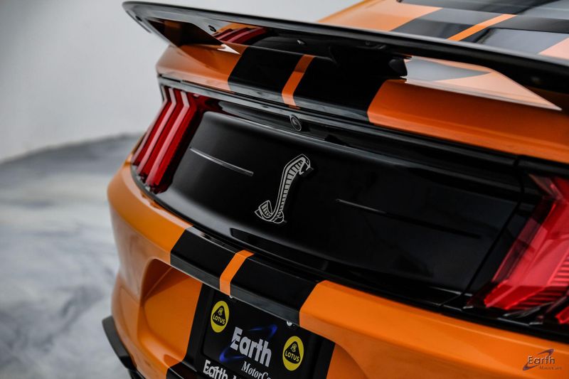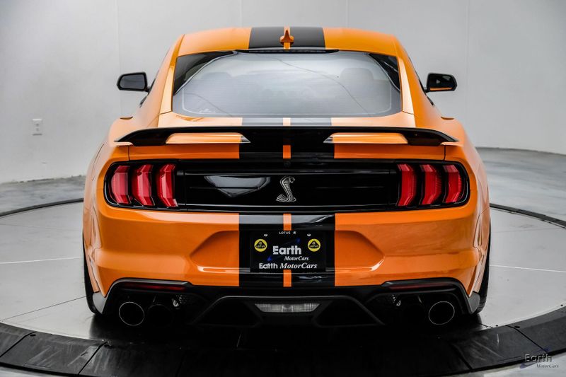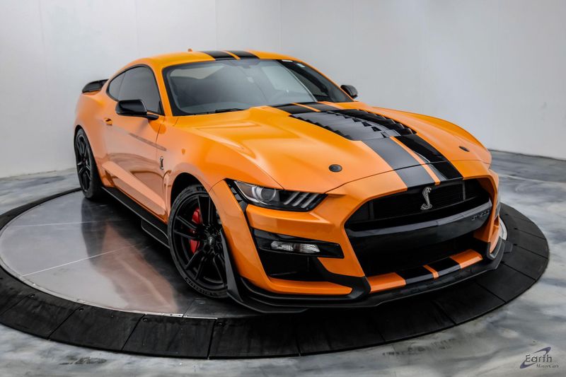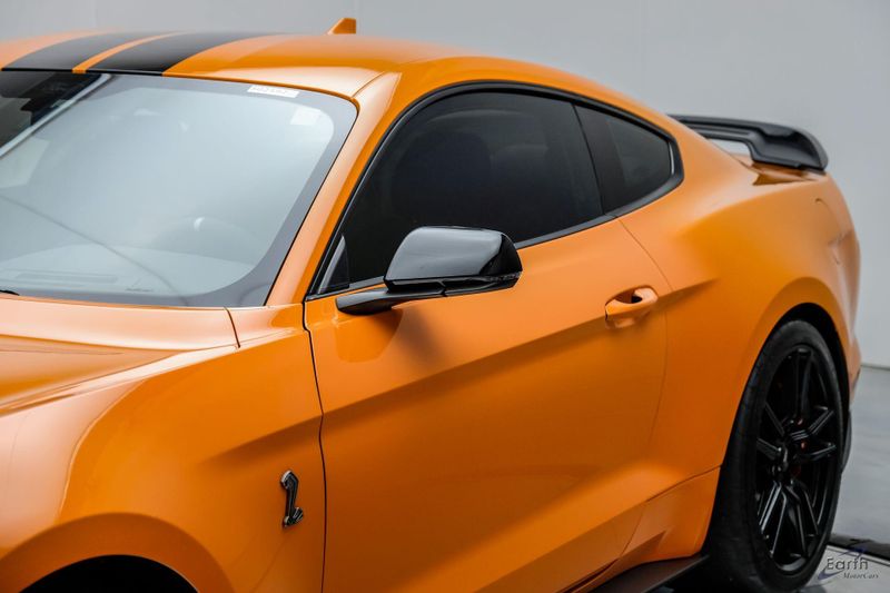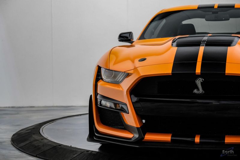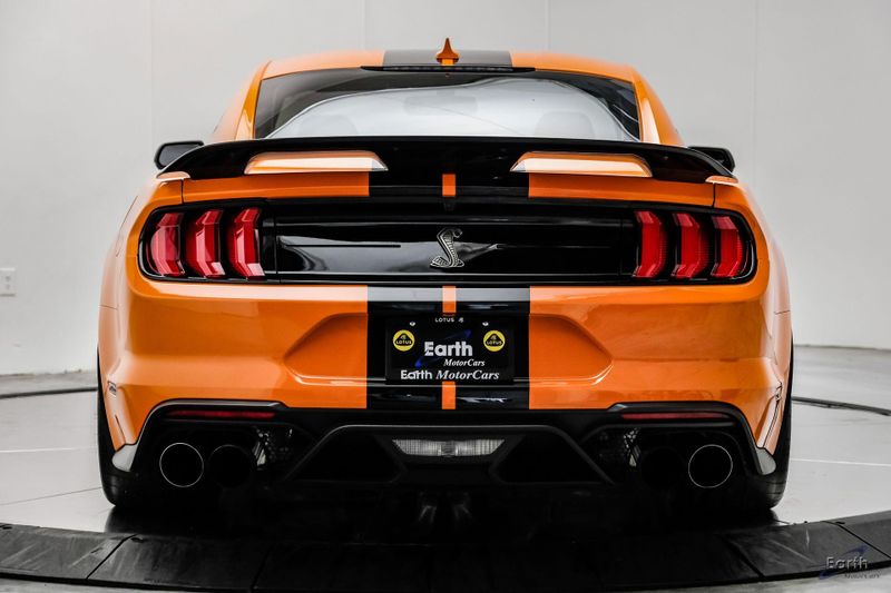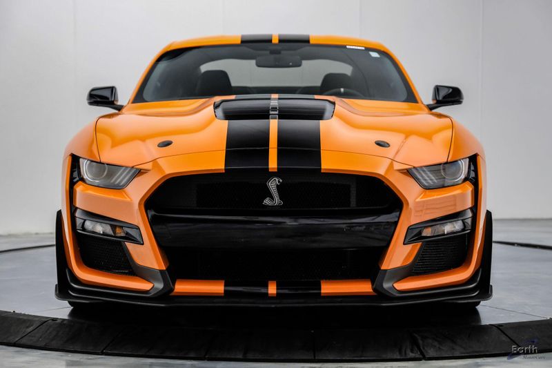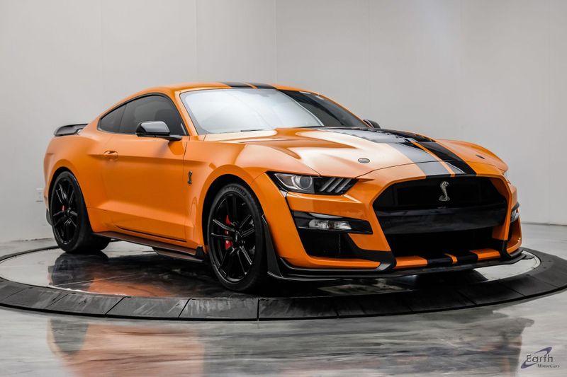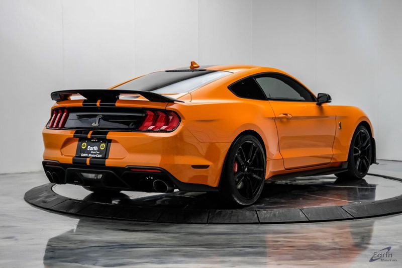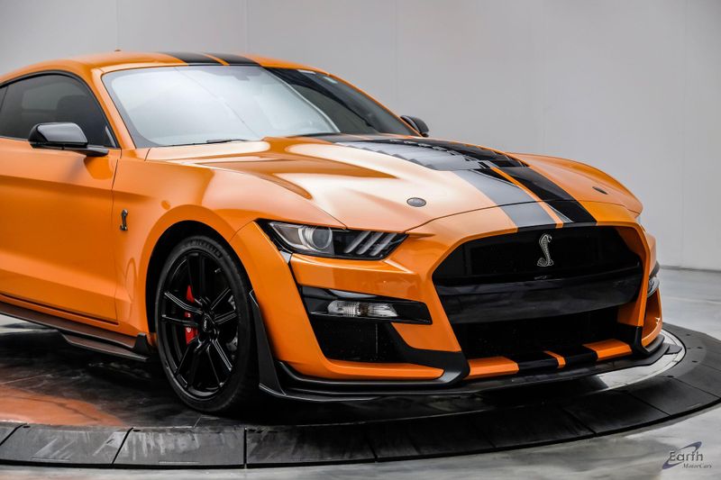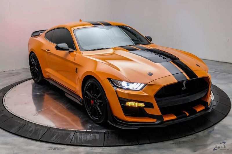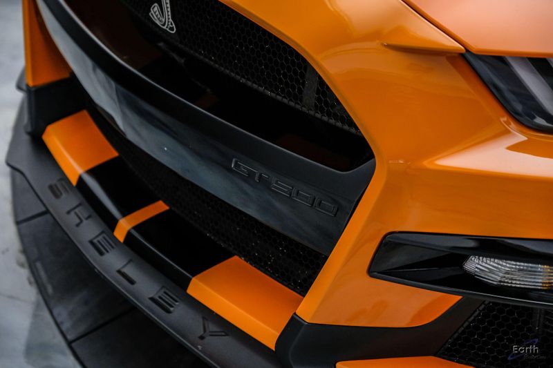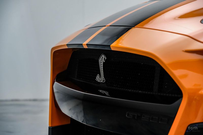 Earth MotorCars is Proud to offer this amazing: 2021 Ford Mustang Shelby GT500 Painted-Over-The-Top-Stripe Tech & Handling Pack CARFAX One-Owner. CLEAN AUTOCHECK REPORT, TWISTER ORANGE TRI-COAT 495.00, 4-Wheel Disc Brakes, ABS brakes, Air Conditioning, AM/FM Stereo, Auto-dimming Rear-View mirror, Automatic temperature control, BLIS Blind Spot Information System, Bumpers: body-color, Dual front impact airbags, Dual front side impact airbags, Equipment Group 950A, Exterior Parking Camera Rear, Four wheel independent suspension, Front Bucket Seats, Front Center Armrest, Fully automatic headlights, Handling Package, Heated Mirrors, Illuminated entry, Knee airbag, Painted Over-the-Top Racing Stripes, Panic alarm, Power driver seat, Power steering, Power windows, Radio: B&O Sound System by Bang & Olufsen, Rear window defroster, Remote keyless entry, Security system, SiriusXM Radio, Speed control, Speed-sensing steering, Spoiler, Steering wheel mounted audio controls, SYNC 3 Communications & Entertainment System, Tachometer, Technology Package, Traction control, Variably intermittent wipers, Voice-Activated Touch-Screen Navigation System, Voltmeter, Wheels: 20'' Flow Formed High Gloss Black Aluminum.