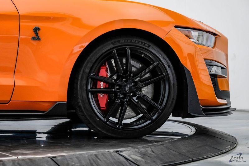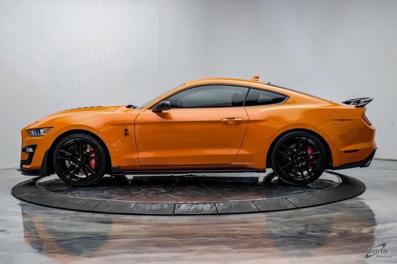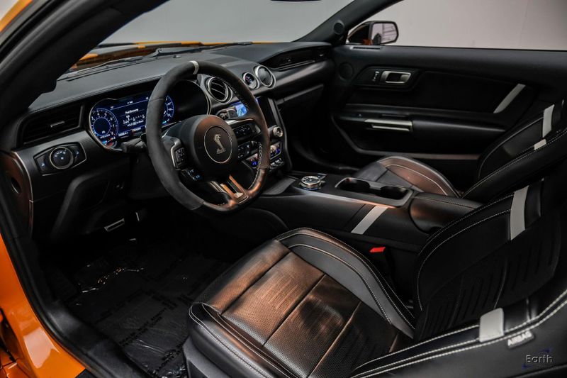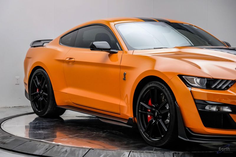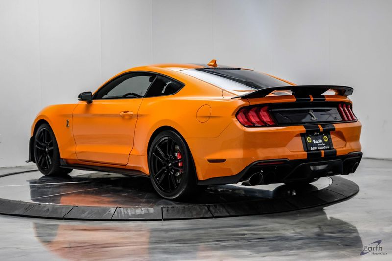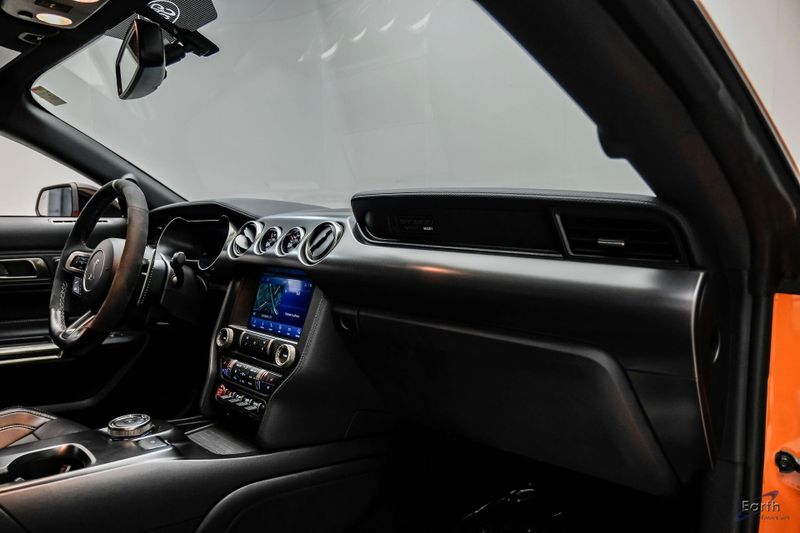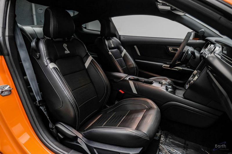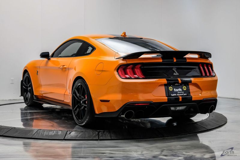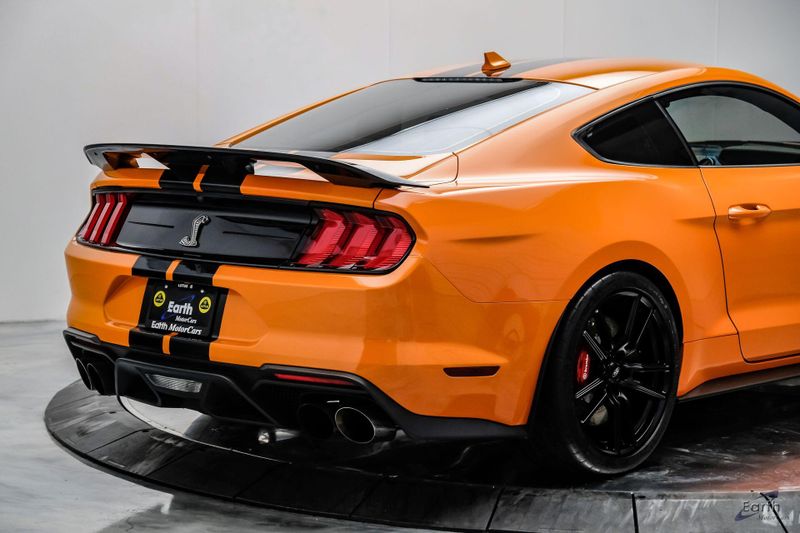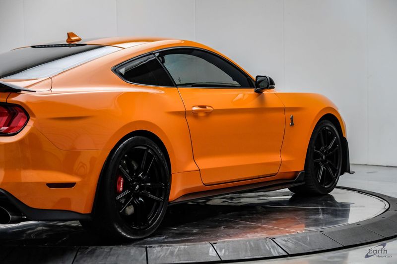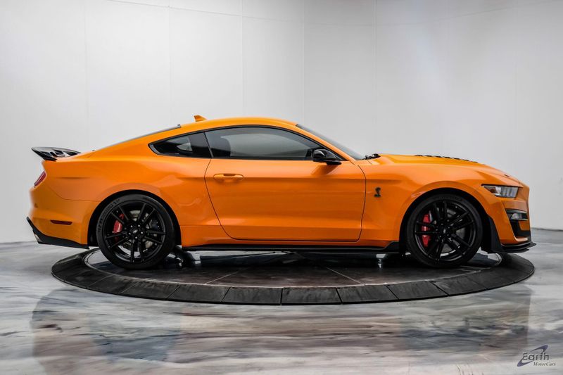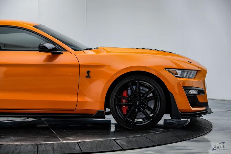 Earth MotorCars is Proud to offer this amazing: 2021 Ford Mustang Shelby GT500 Painted-Over-The-Top-Stripe Tech & Handling Pack CARFAX One-Owner. CLEAN AUTOCHECK REPORT, TWISTER ORANGE TRI-COAT 495.00, 4-Wheel Disc Brakes, ABS brakes, Air Conditioning, AM/FM Stereo, Auto-dimming Rear-View mirror, Automatic temperature control, BLIS Blind Spot Information System, Bumpers: body-color, Dual front impact airbags, Dual front side impact airbags, Equipment Group 950A, Exterior Parking Camera Rear, Four wheel independent suspension, Front Bucket Seats, Front Center Armrest, Fully automatic headlights, Handling Package, Heated Mirrors, Illuminated entry, Knee airbag, Painted Over-the-Top Racing Stripes, Panic alarm, Power driver seat, Power steering, Power windows, Radio: B&O Sound System by Bang & Olufsen, Rear window defroster, Remote keyless entry, Security system, SiriusXM Radio, Speed control, Speed-sensing steering, Spoiler, Steering wheel mounted audio controls, SYNC 3 Communications & Entertainment System, Tachometer, Technology Package, Traction control, Variably intermittent wipers, Voice-Activated Touch-Screen Navigation System, Voltmeter, Wheels: 20'' Flow Formed High Gloss Black Aluminum.