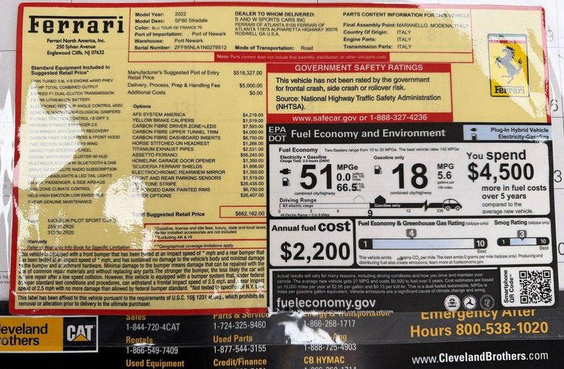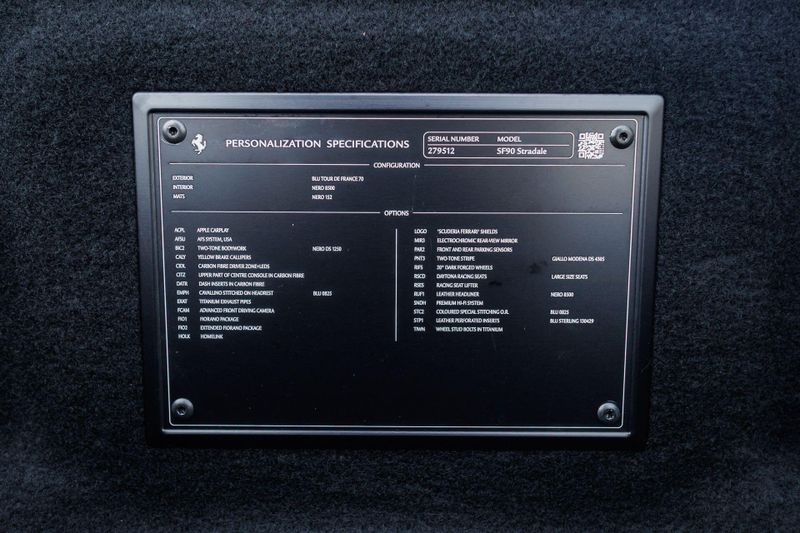 Earth MotorCars is Proud to offer this amazing: 2022 Ferrari SF90 Stradale Assetto Fiorano $682,162 MSRP FULL PPF CARFAX One-Owner. Clean CARFAX. Assetto Fiorano Package, Carbon Interior Package, Carbon Exterior Package, LOADED and fully serived, FULL PPF, 6 Speakers, ABS brakes, Adaptive suspension, Alloy wheels, AM/FM radio, Apple CarPlay, Bumpers: body-color, Carbon Interior Upgrade, Compass, Electronic Stability Control, Exterior Carbon Components, Exterior Parking Camera Rear, Front Center Armrest, Heads-Up Display, Heated door mirrors, Illuminated entry, Leather Seat Trim, Leather steering wheel, Low tire pressure warning, Navigation System, Outside temperature display, Power door mirrors, Power driver seat, Power passenger seat, Radio data system, Rear fog lights, Remote keyless entry, Security system, Sport steering wheel, Tachometer, Tilt steering wheel, Titanium Exhaust Pipes, Traction control, Variably intermittent wipers, Wheels: 20'' x 9.5'' Fr & 20'' x 11.5'' Rr Forged Matte, Yellow Brake Calipers.