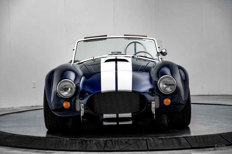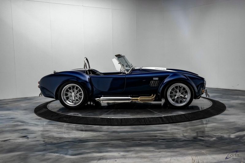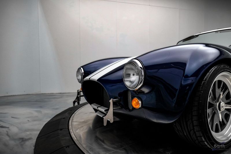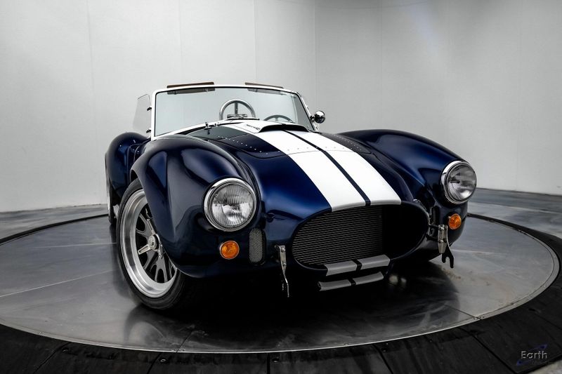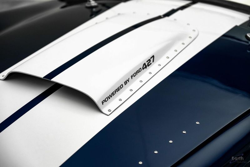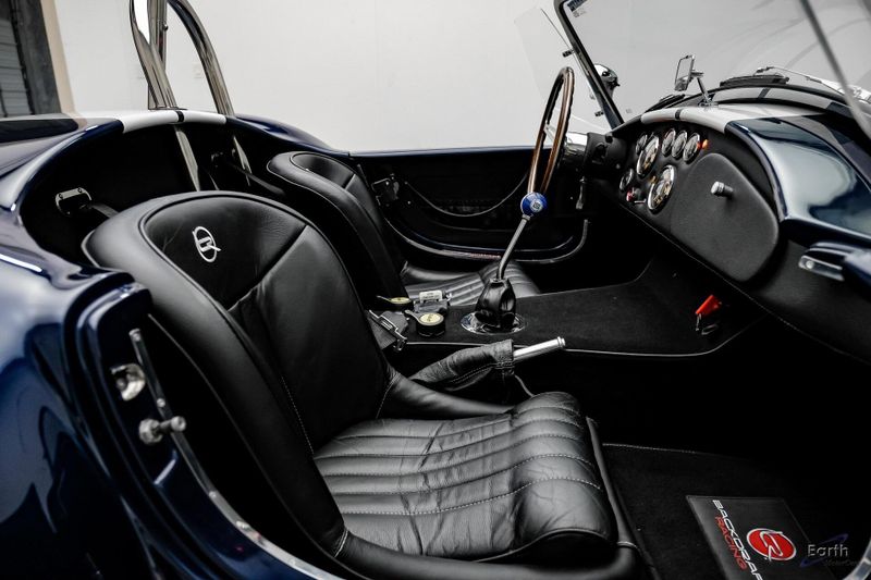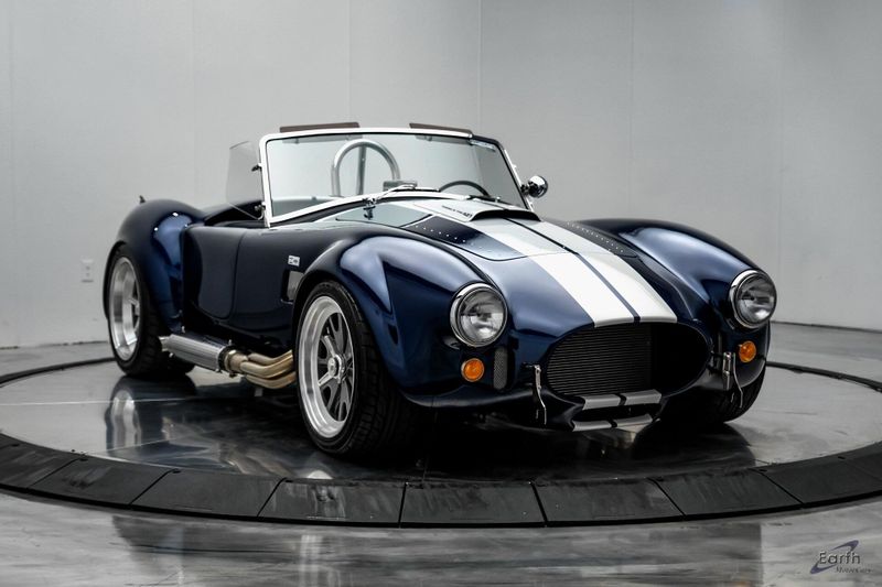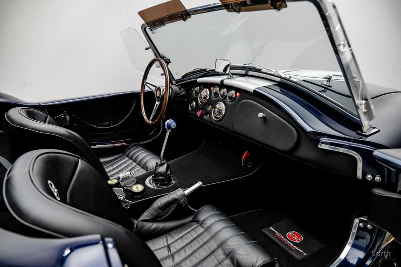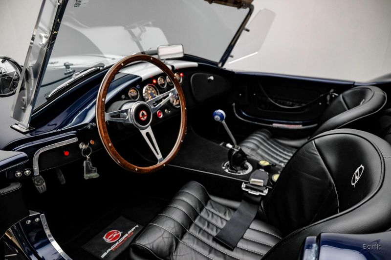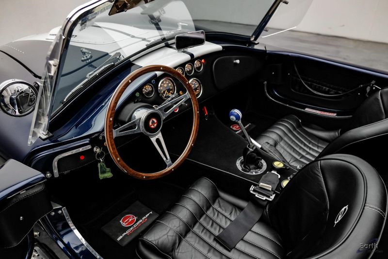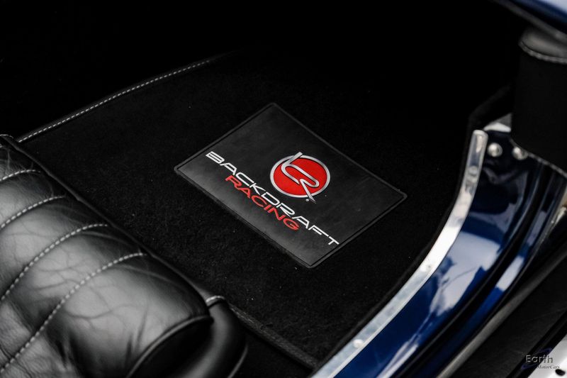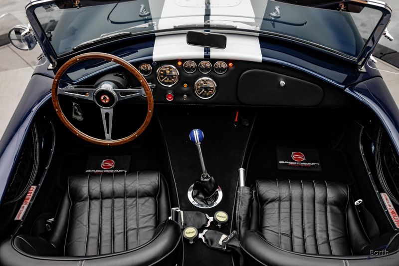 This stunning Shelby Backdraft Cobra presents in Indigo Blue Exterior with White stripes and classic Black leather interior. Classic Trim. Prestige 500hp 427 cu. in. V8, 5 speed manual transmission. Ceramic headers, Chrome engine accessories, 18 Wheels, Chrome side pipes, Cam style seat belts, Raydot Mirror, optional glove box, all new steering column mounted wiper and light controls as well as a traditional wooded steering wheel.