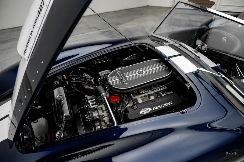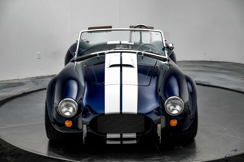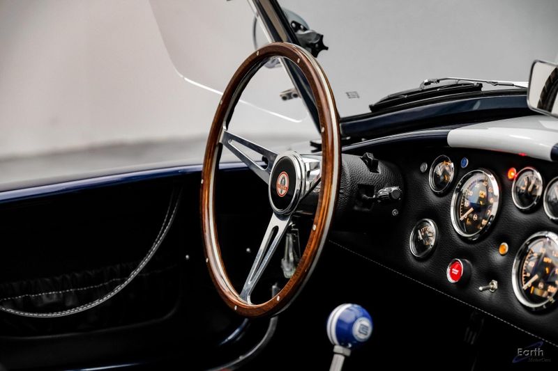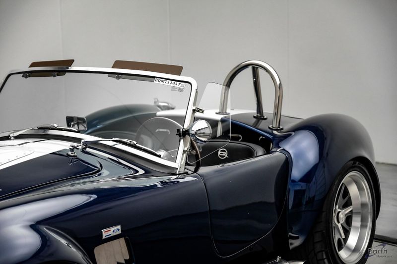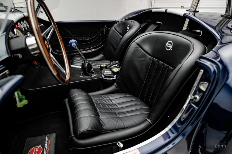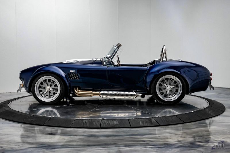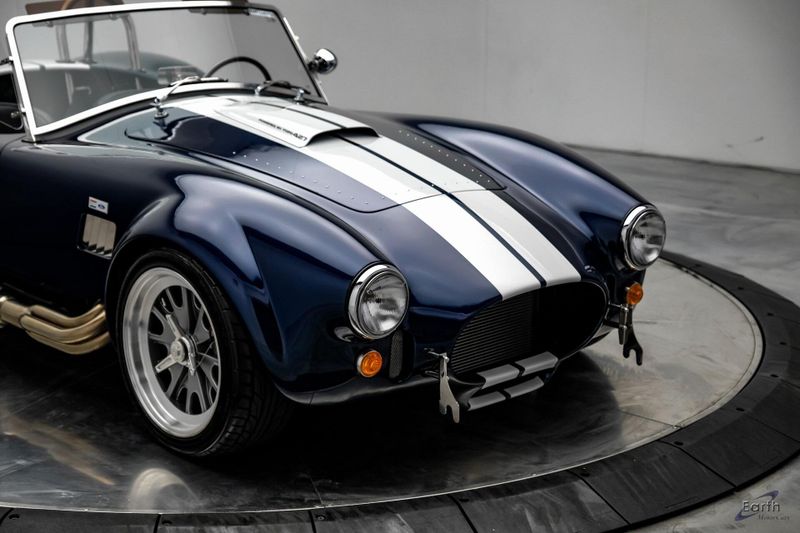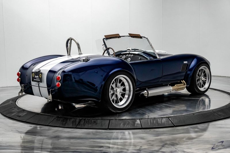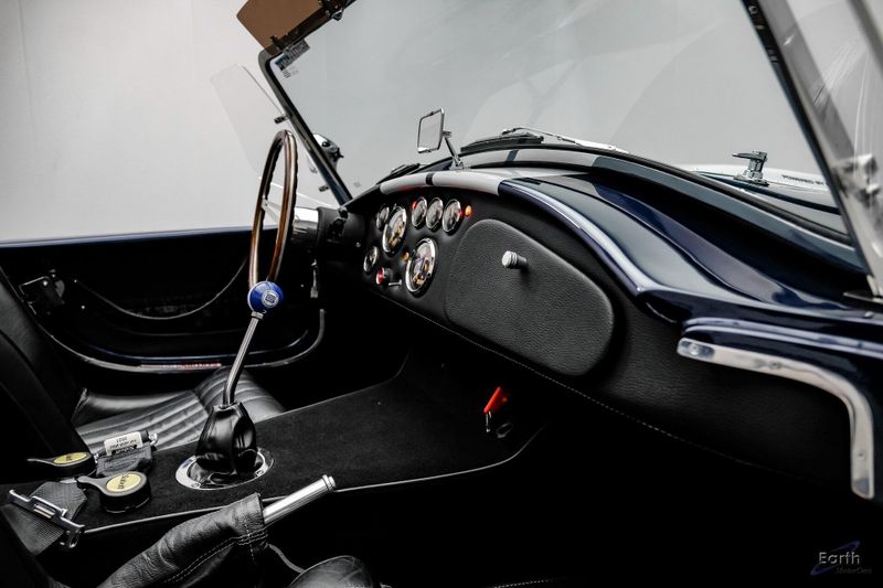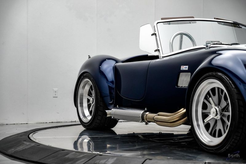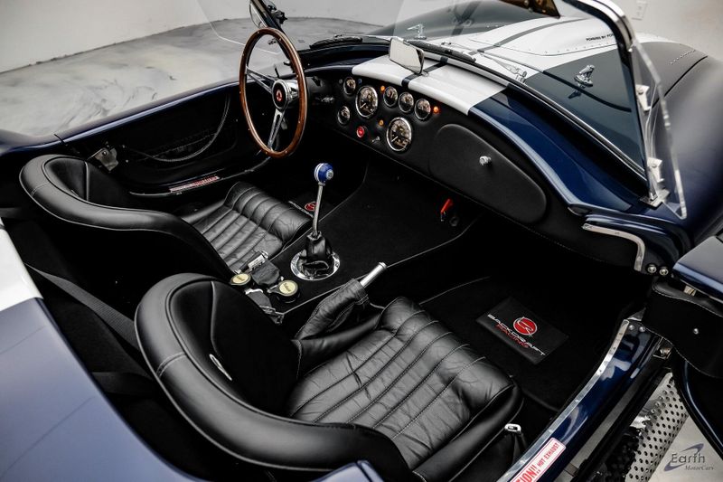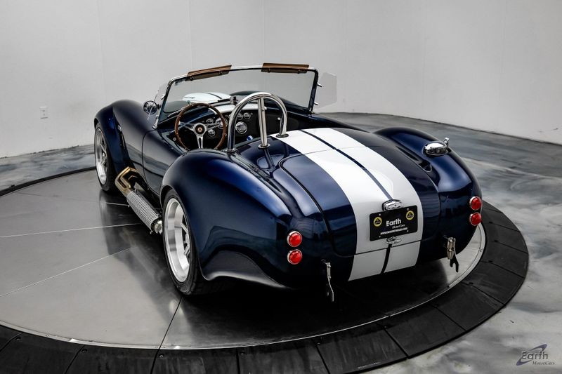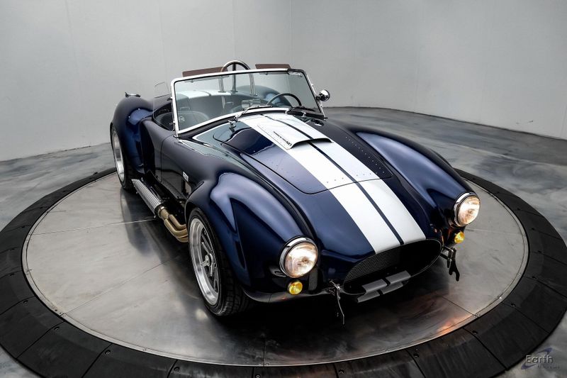 This stunning Shelby Backdraft Cobra presents in Indigo Blue Exterior with White stripes and classic Black leather interior. Classic Trim. Prestige 500hp 427 cu. in. V8, 5 speed manual transmission. Ceramic headers, Chrome engine accessories, 18 Wheels, Chrome side pipes, Cam style seat belts, Raydot Mirror, optional glove box, all new steering column mounted wiper and light controls as well as a traditional wooded steering wheel.