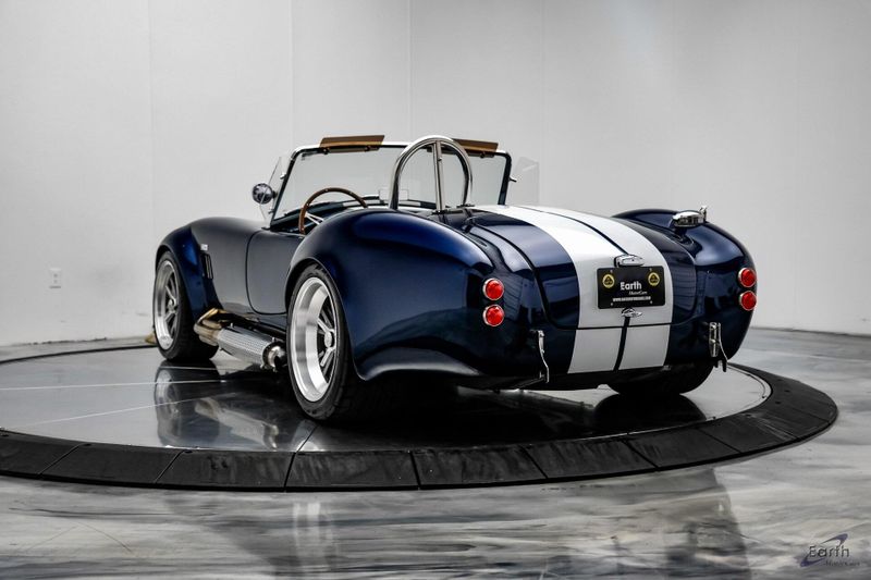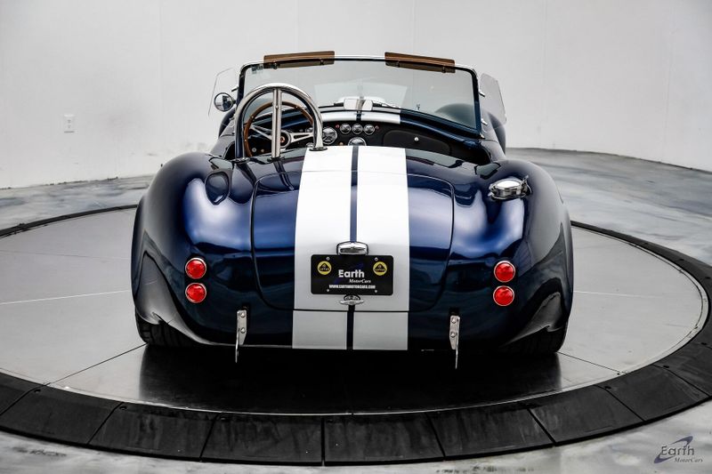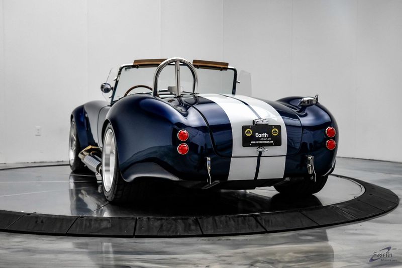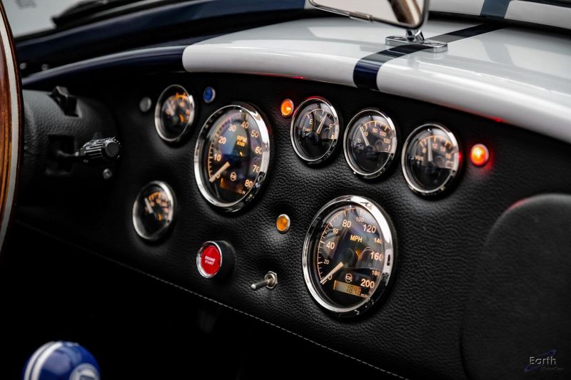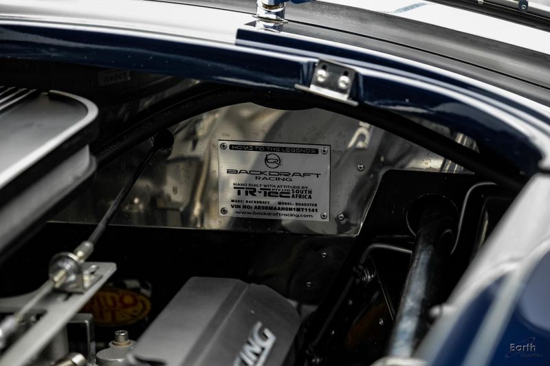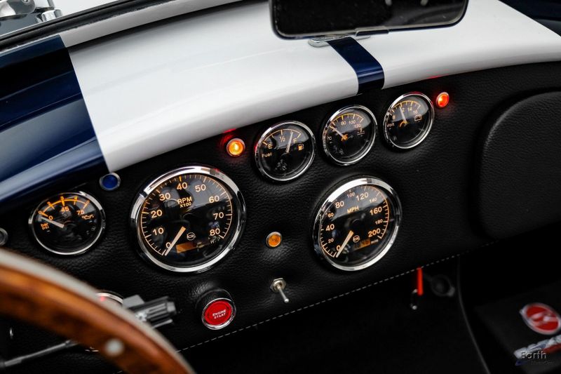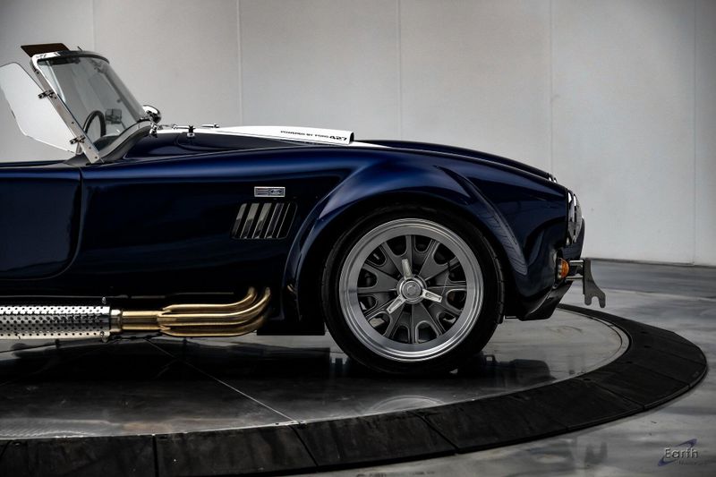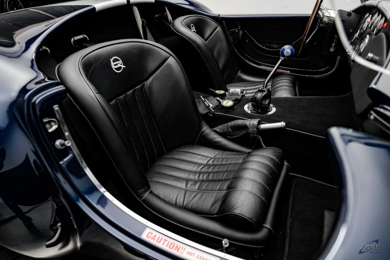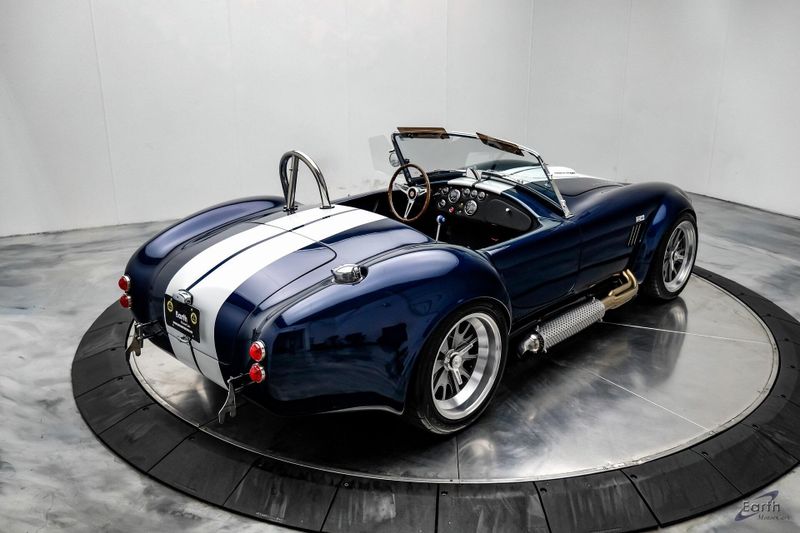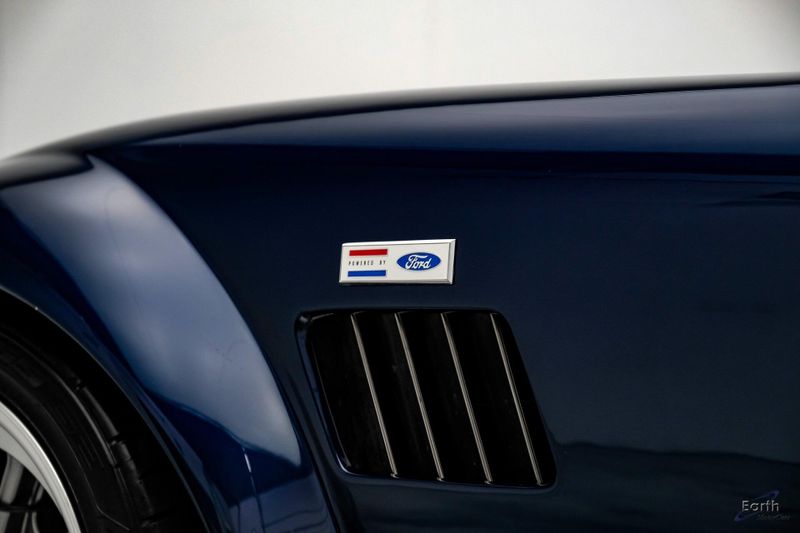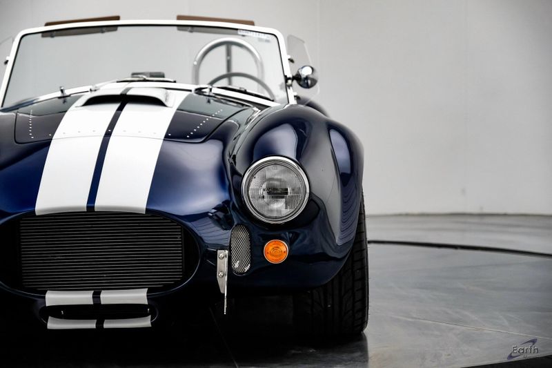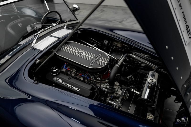 This stunning Shelby Backdraft Cobra presents in Indigo Blue Exterior with White stripes and classic Black leather interior. Classic Trim. Prestige 500hp 427 cu. in. V8, 5 speed manual transmission. Ceramic headers, Chrome engine accessories, 18 Wheels, Chrome side pipes, Cam style seat belts, Raydot Mirror, optional glove box, all new steering column mounted wiper and light controls as well as a traditional wooded steering wheel.