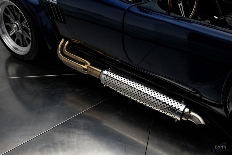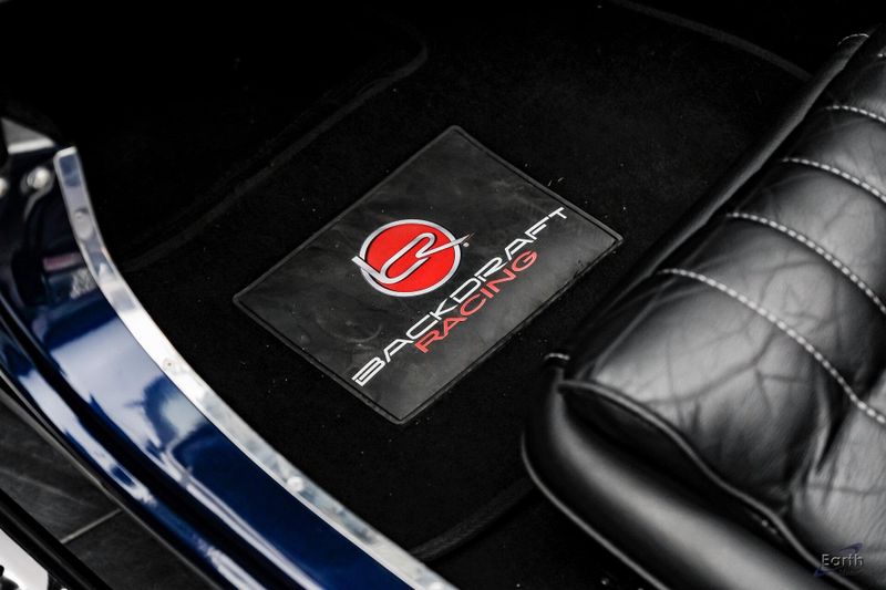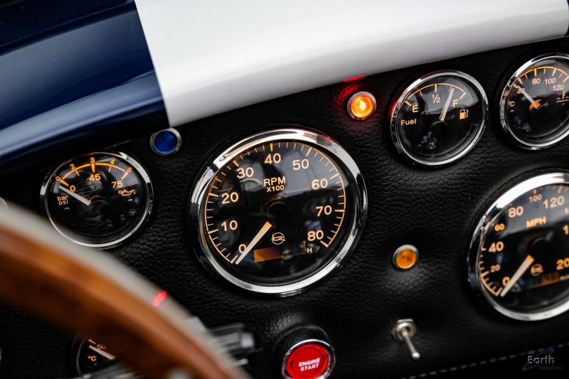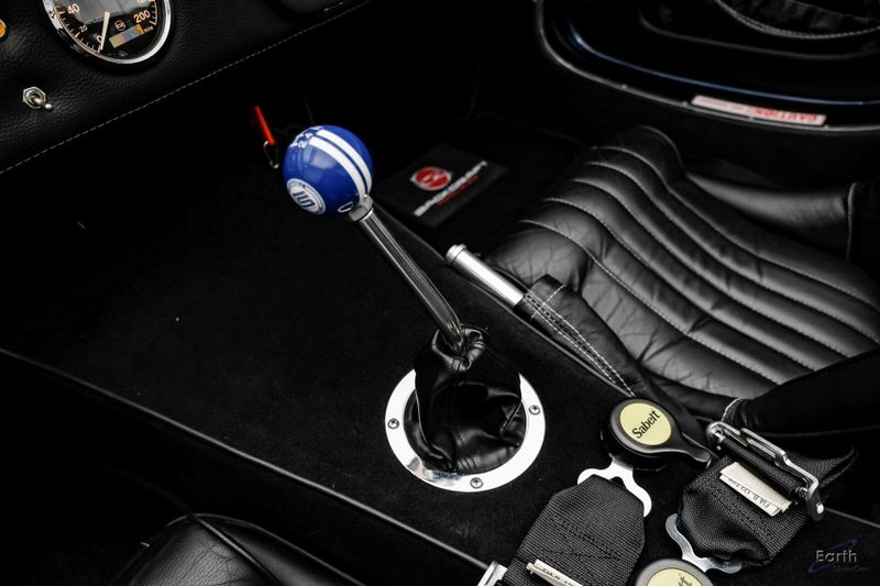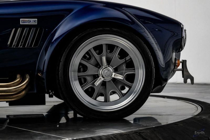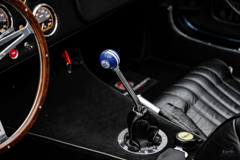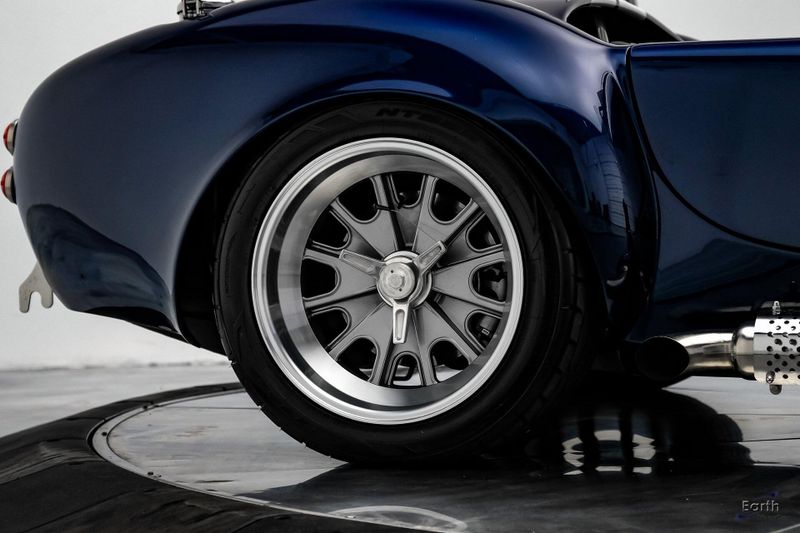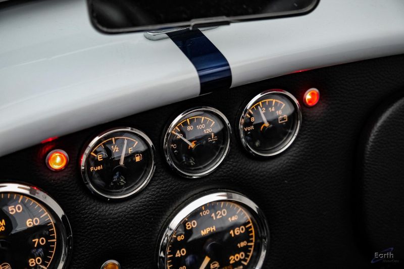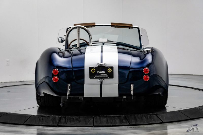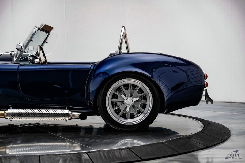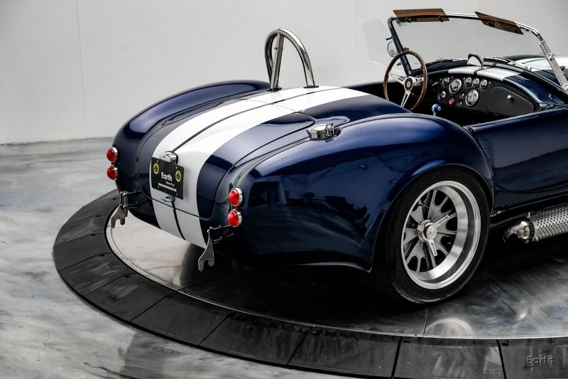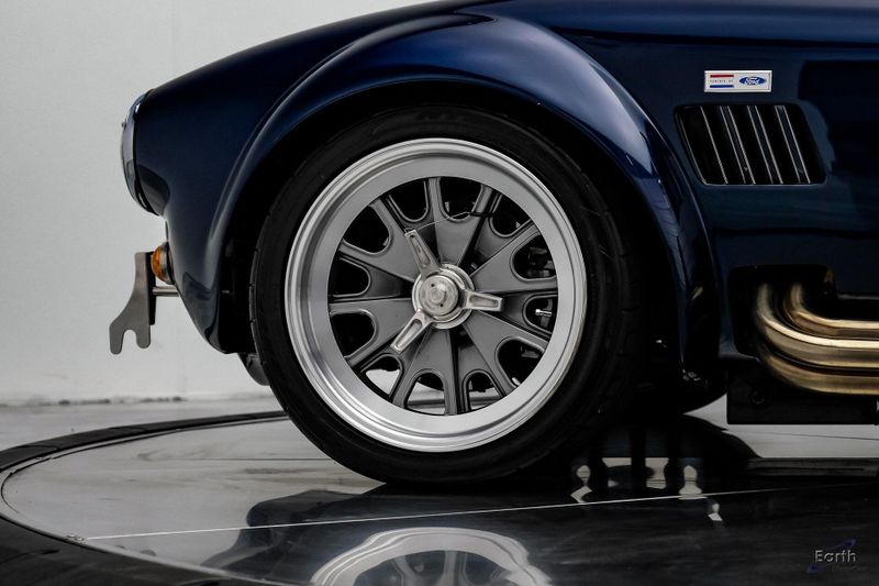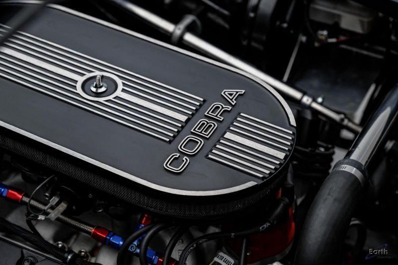 This stunning Shelby Backdraft Cobra presents in Indigo Blue Exterior with White stripes and classic Black leather interior. Classic Trim. Prestige 500hp 427 cu. in. V8, 5 speed manual transmission. Ceramic headers, Chrome engine accessories, 18 Wheels, Chrome side pipes, Cam style seat belts, Raydot Mirror, optional glove box, all new steering column mounted wiper and light controls as well as a traditional wooded steering wheel.