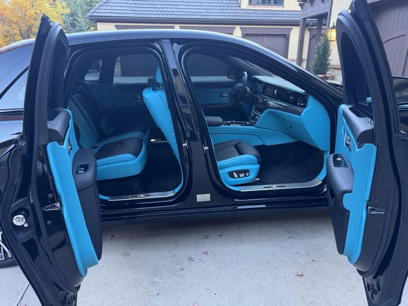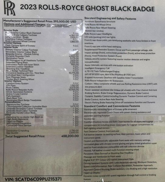 Earth MotorCars is Proud to offer this amazing: 2023 Rolls-Royce Ghost Black Badge SHOOTING STAR! CARFAX One-Owner. Clean CARFAX. Shooting Star Headliner, Turchese w/CC Leather Seat Trim, 16 Speakers, 4-Wheel Disc Brakes, Accent Interior Environment, Active Cruise Control w/Stop & Go, Adaptive suspension, Air Conditioning, Auto-dimming door mirrors, Auto-leveling suspension, Automatic temperature control, Bespoke Interior - Module Editing, Body Colored Wheel Centers, Brake assist, CC Leather Seat Trim, Color-Keyed Boot Trim, Comfort Entry System, Commissioned Collection Umbrellas, Contrast Interior Environment, Dark Chrome Spirit of Ecstasy, Double Long Coachline, Driver Assistance Systems, Dual front impact airbags, Dynamic Bespoke Clock, Exterior Parking Camera Rear, Four wheel independent suspension, Front Massage Seats, Front Ventilated Seats, Genuine wood console insert, Headlight cleaning, Heated Front Bucket Seats, HVAC memory, Illuminated entry, Illuminated Fascia, Immersive Seating w/Occasional 3rd Seat, Lane Departure Warning System, Navigation System, Park Assist, Picnic Tables, Pinstripe Applied to Wheel Centers, Radio: AM/FM/CD/MP3 Satellite Audio System, Rear dual zone A/C, Remote keyless entry, Rolls-Royce Bespoke Audio, RR Monogram to all Headrests, Security system, Signature Key, Single Coachline, Steering wheel mounted audio controls, Ventilated front seats, Wheels: 21'' 10 Spoke Part Pol. Shadow (Pinstripe).