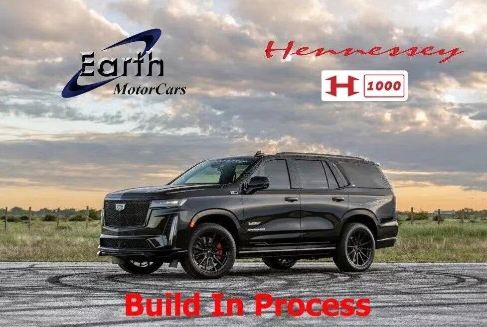 Earth MotorCars is Proud to offer this Amazing: 2025 Cadillac Escalade V-Series HENNESSEY HPE 1000 Package in Black Raven! Estimated completion 10/20/2025. 1,005 HP @ 6,400 rpm 882 lb-ft torque @ 4,300 rpm Upgraded High-Flow Supercharger System Upgraded Upper Pulley for Increased Boost Pressure Upgraded Lower Pulley Custom Hennessey Camshaft High-Performance Throttle Body Ported Cylinder Heads Auxiliary Fuel System Upgrade High-Flow Air Induction System Upgraded Valve Springs and Retainers Upgraded Intake Valves and Exhaust Valves Upgraded Lifters and Push Rods Anodized Red Valvetrain Covers Oversized Heat Exchanger Upgrade Long-Tube Stainless Steel Headers Crankcase Ventilation System High-Flow Catalytic Converters All Necessary Gaskets and Fluids Professional Installation HPE Engine Management Calibration Chassis Dyno Tuning Road Testing (Up To 500 Miles) Serial-Numbered Engine Bay Plaque Hennessey & H1000 Exterior Badging, ONYX PACKAGE, AWD, Jet Black w/Leather Seating Surfaces w/Precision Perf Inserts, 4-Wheel Disc Brakes, ABS brakes, Air Conditioning, Air Ride Adaptive Suspension, AKG Studio Reference 36-Speaker Audio System, Auto-dimming door mirrors, Automatic temperature control, Black Illuminated Cadillac Emblem (LPO), Blind Zone Steering Assist w/Trailering, Bumpers: body-color, Door Lock & Latch Shields, Dual front impact airbags, Dual front side impact airbags, Electronic Limited-Slip Differential, Electronic Stability Control, Exterior Parking Camera Rear, Four wheel independent suspension, Fully automatic headlights, Glass Breakage Sensor, Gloss Black Escalade Nameplate (LPO), Headphones, Heads-Up Display, Heated & Ventilated Driver & Front Passenger Seats, Hitch Guidance w/Hitch View, Illuminating Front & Rear Sill Plates, Integrated Trailer Brake Controller, Lane Departure Warning System, Magnetic Ride Control Suspension, Next Generation Active Noise Cancellation, Night Vision, Onyx Package (LPO), Platinum Interior Trim, Power Liftgate, Power Lumbar Massage Driver Seat, Power Lumbar Massage Front Passenger Seat, Power Open/Close Doors, Power Panoramic Tilt-Sliding Sunroof, Power-Retractable Assist Steps, Preferred Equipment Group 1SD, Rain sensing wipers, Rear air conditioning, Rear Seat Entertainment System, Rear window defroster, Rear window wiper, Reconfigurable Full-Color Head-Up Display, Smart Trailer Integration Indicator, Soft Closing Front & Rear Doors, Speed control, Steering wheel mounted audio controls, Theft-Deterrent Alarm System, Touring Package, Traction control, Trailering App, Trailering Assist Guidelines, Tri-Zone A/C, Variably intermittent wipers, Vehicle Inclination Sensor, Vehicle Interior Movement Sensor, Wheels: 24'' Black Alloy (LPO), Wheels: 24'' Transit (LPO).