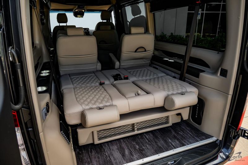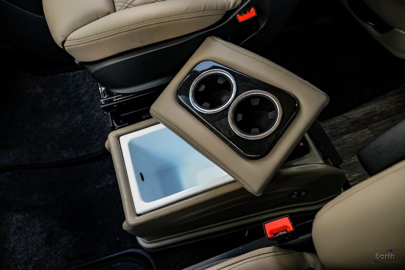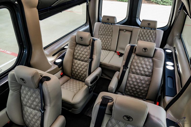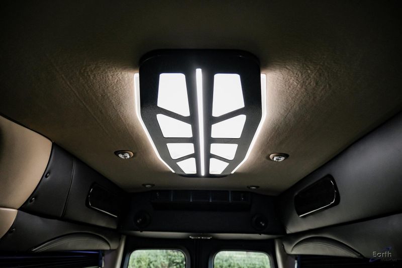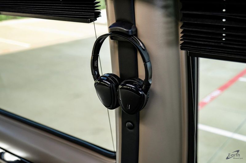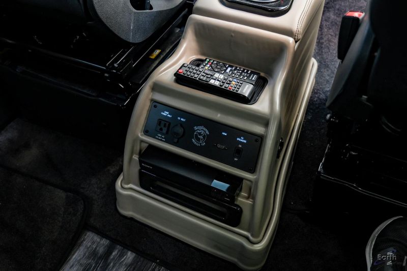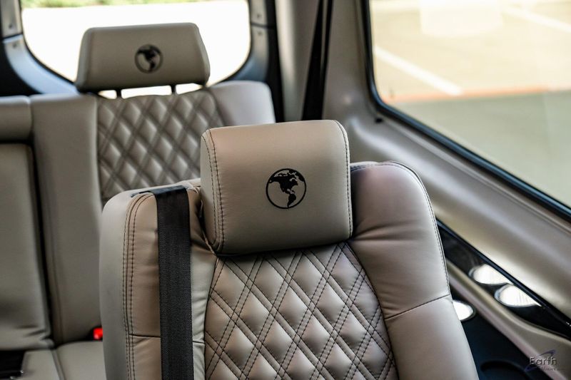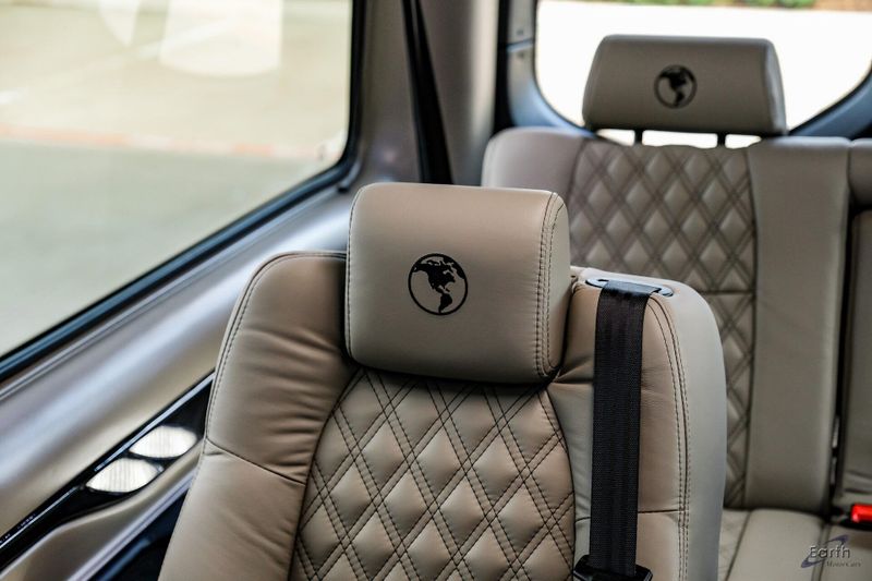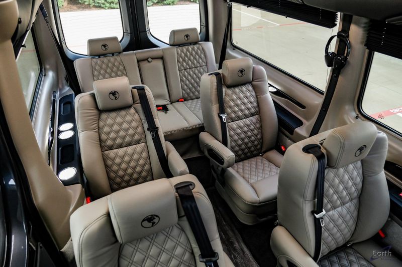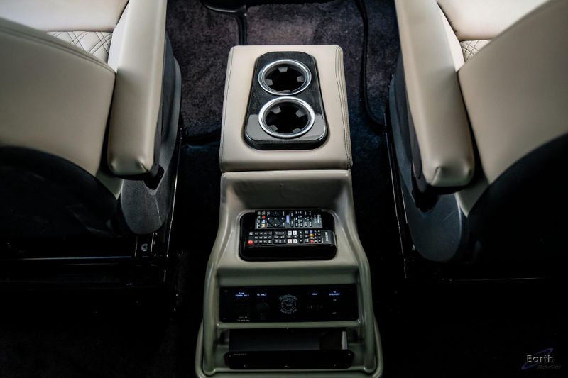 The cabin offers seating for nine including swiveling captain chairs and a folding rear bench with custom diamond stitched inserts along with custom faux wood flooring and integrated side storage compartments. It comes factory-equipped with an array of premium packages including the Comfort, Driver Convenience, and Window Fleet Packages. Installed amenities consist of a 32 LED Smart TV, headphones, window shades, and illuminated entry. Other features include Bluetooth wireless phone connectivity, automatic headlights, speed control, and remote keyless entry.