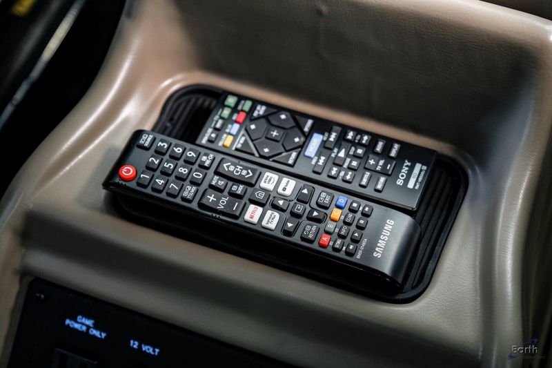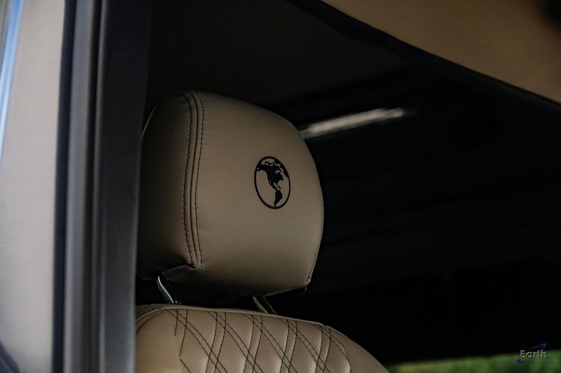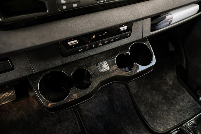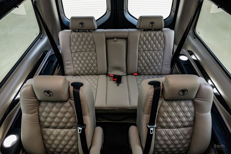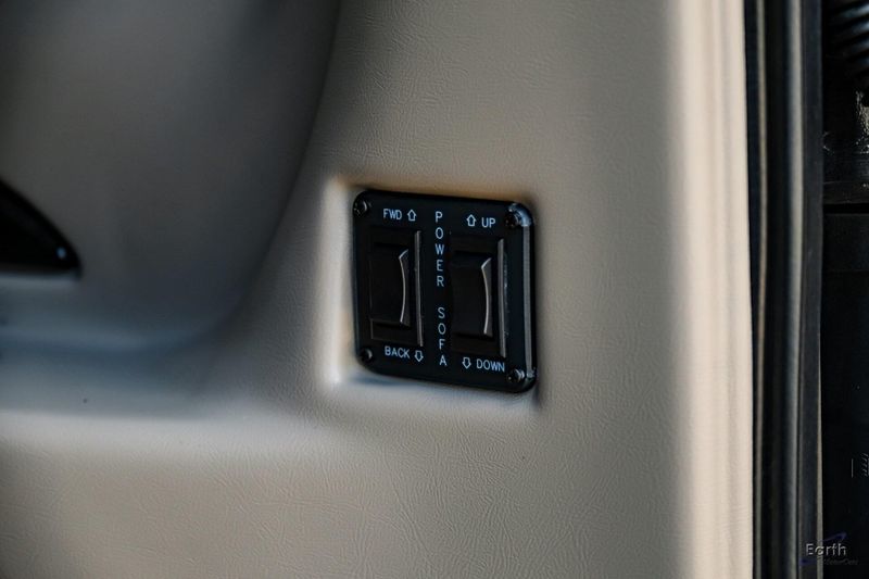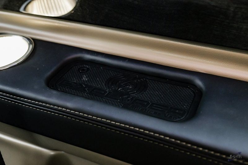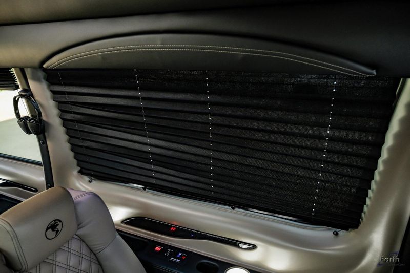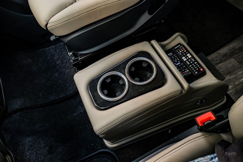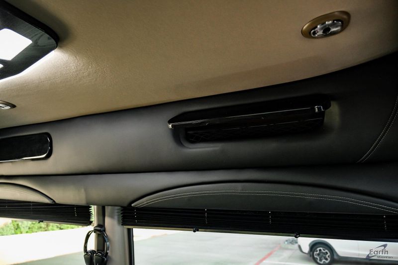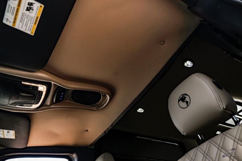 The cabin offers seating for nine including swiveling captain chairs and a folding rear bench with custom diamond stitched inserts along with custom faux wood flooring and integrated side storage compartments. It comes factory-equipped with an array of premium packages including the Comfort, Driver Convenience, and Window Fleet Packages. Installed amenities consist of a 32 LED Smart TV, headphones, window shades, and illuminated entry. Other features include Bluetooth wireless phone connectivity, automatic headlights, speed control, and remote keyless entry.