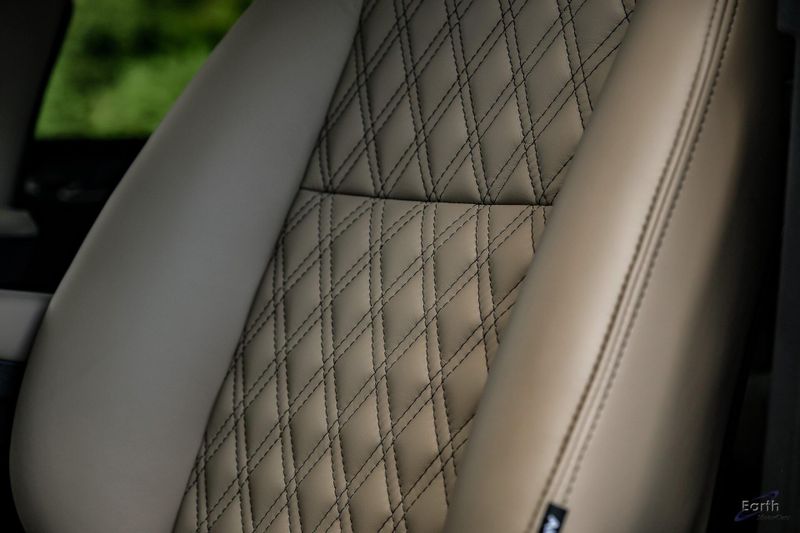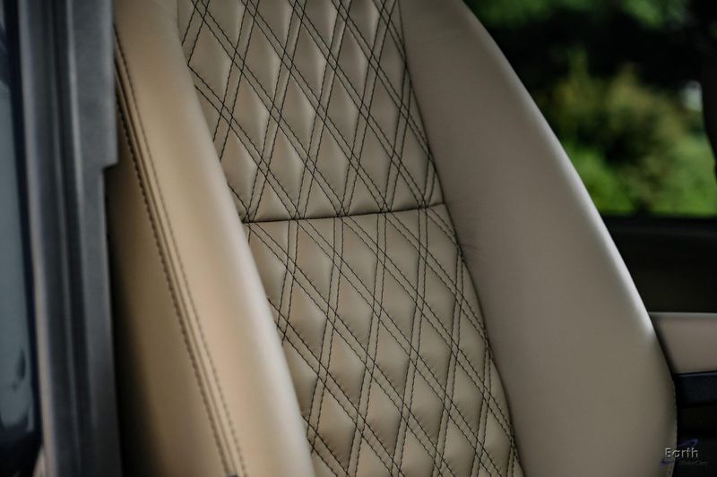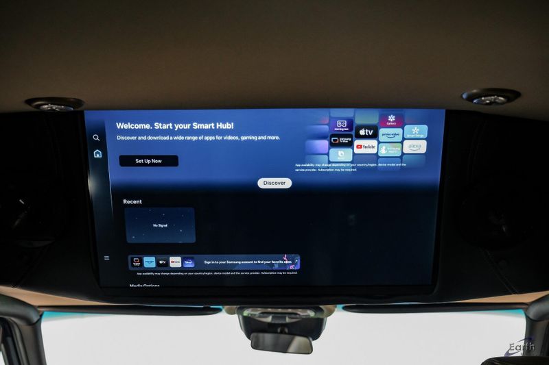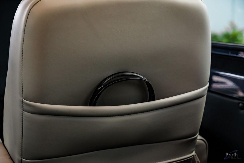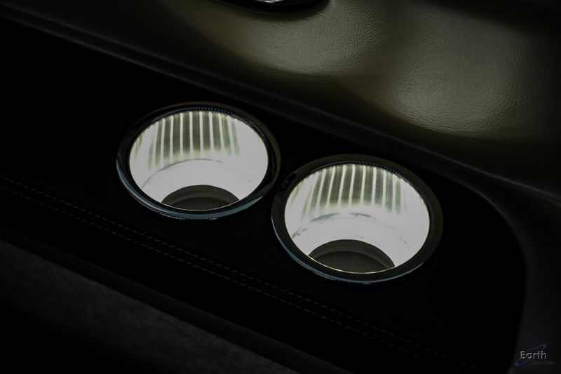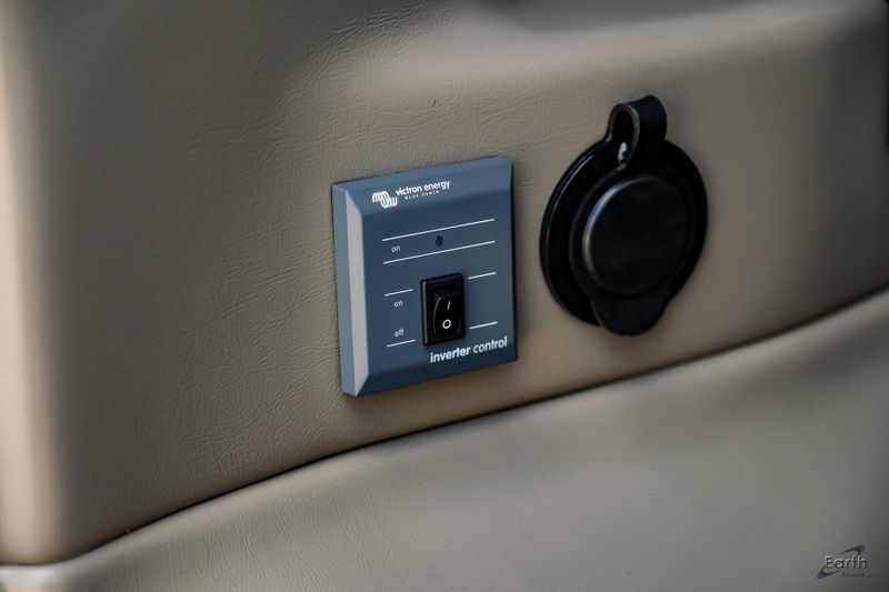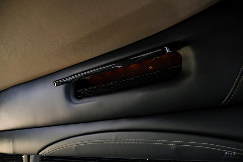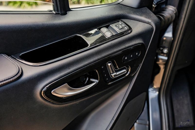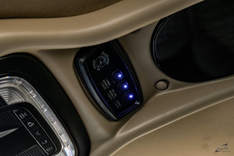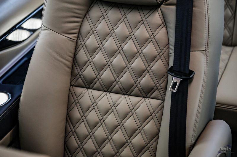The cabin offers seating for nine including swiveling captain chairs and a folding rear bench with custom diamond stitched inserts along with custom faux wood flooring and integrated side storage compartments. It comes factory-equipped with an array of premium packages including the Comfort, Driver Convenience, and Window Fleet Packages. Installed amenities consist of a 32 LED Smart TV, headphones, window shades, and illuminated entry. Other features include Bluetooth wireless phone connectivity, automatic headlights, speed control, and remote keyless entry.